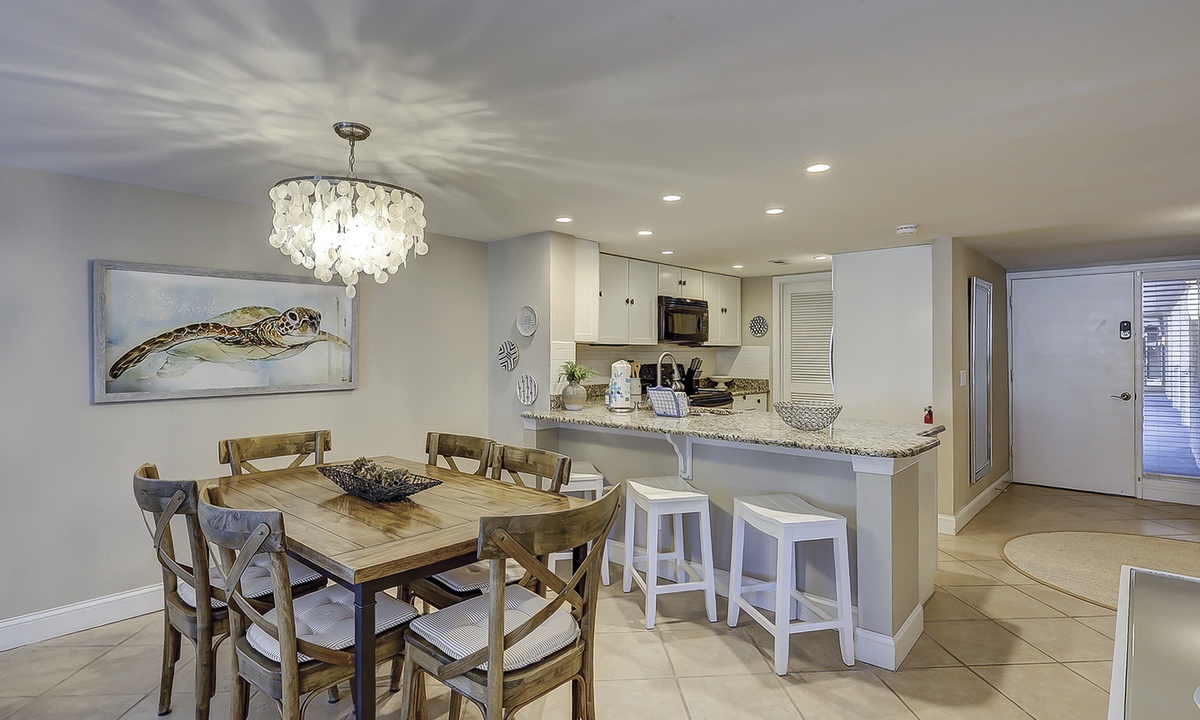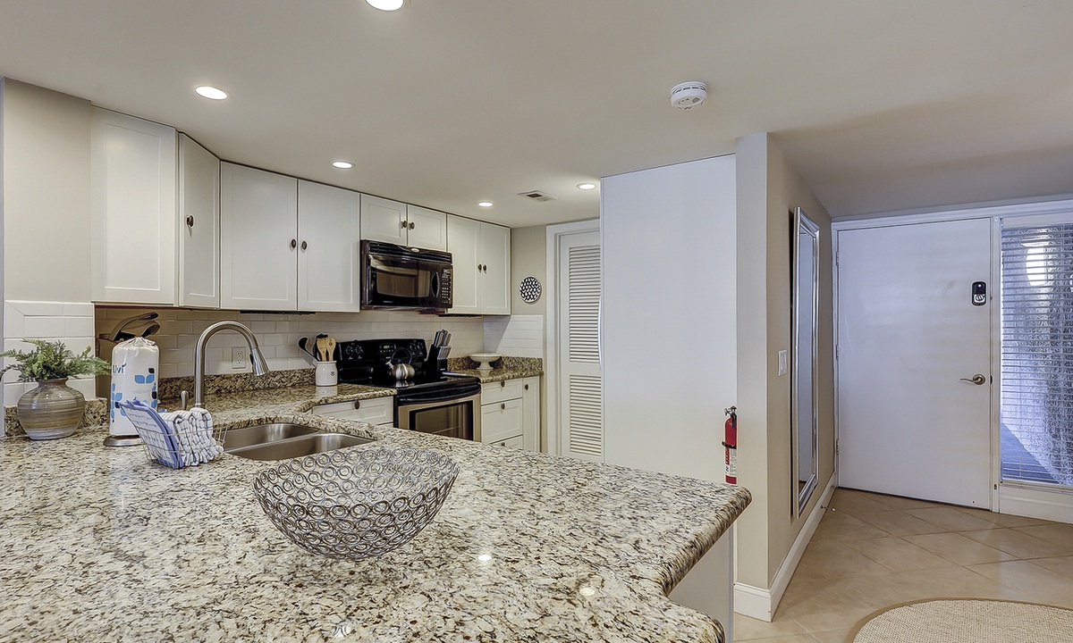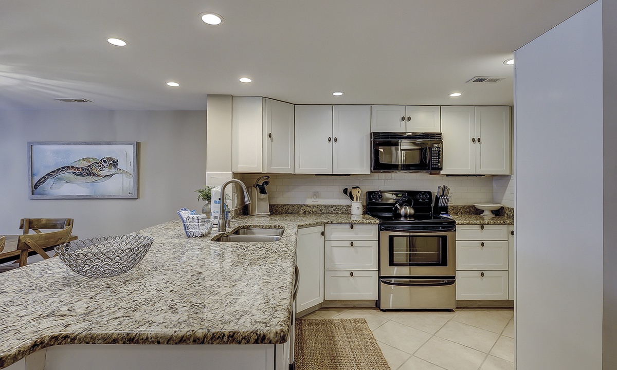 The kitchen features stainless appliances, granite counters, plenty of cabinet and counter space, a Keurig and standard coffee maker, spices for cooking and everything you'll need to prepare meals for your guests. There is also a full-size washer and dryer for added convenience.