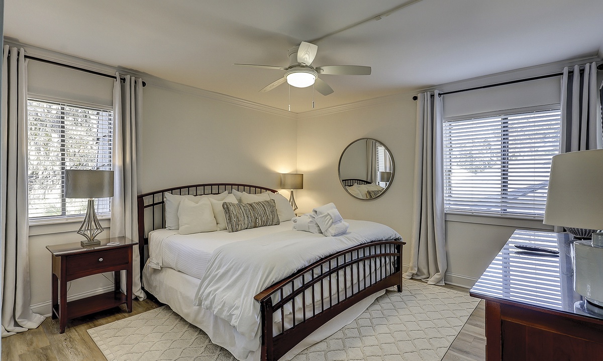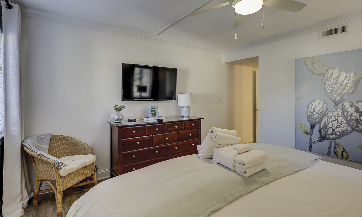 The main bedroom features a king size bed, wall-mounted Smart TV and a private bathroom with a large, walk-in shower.