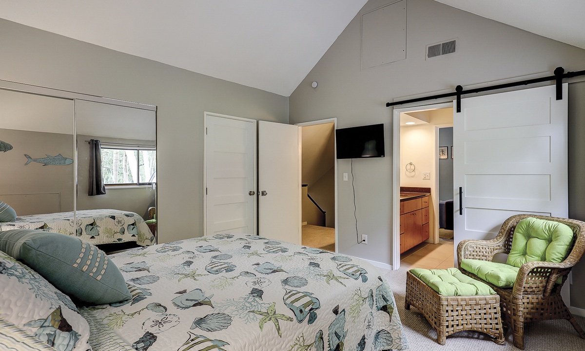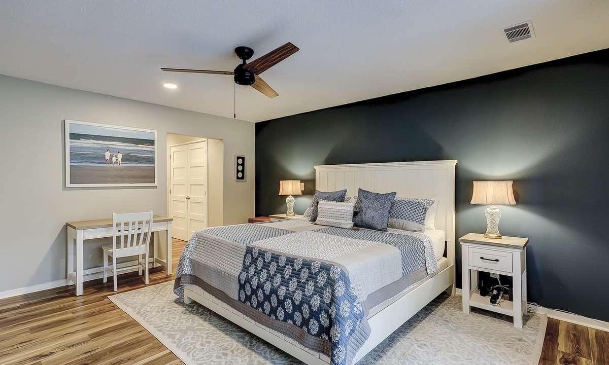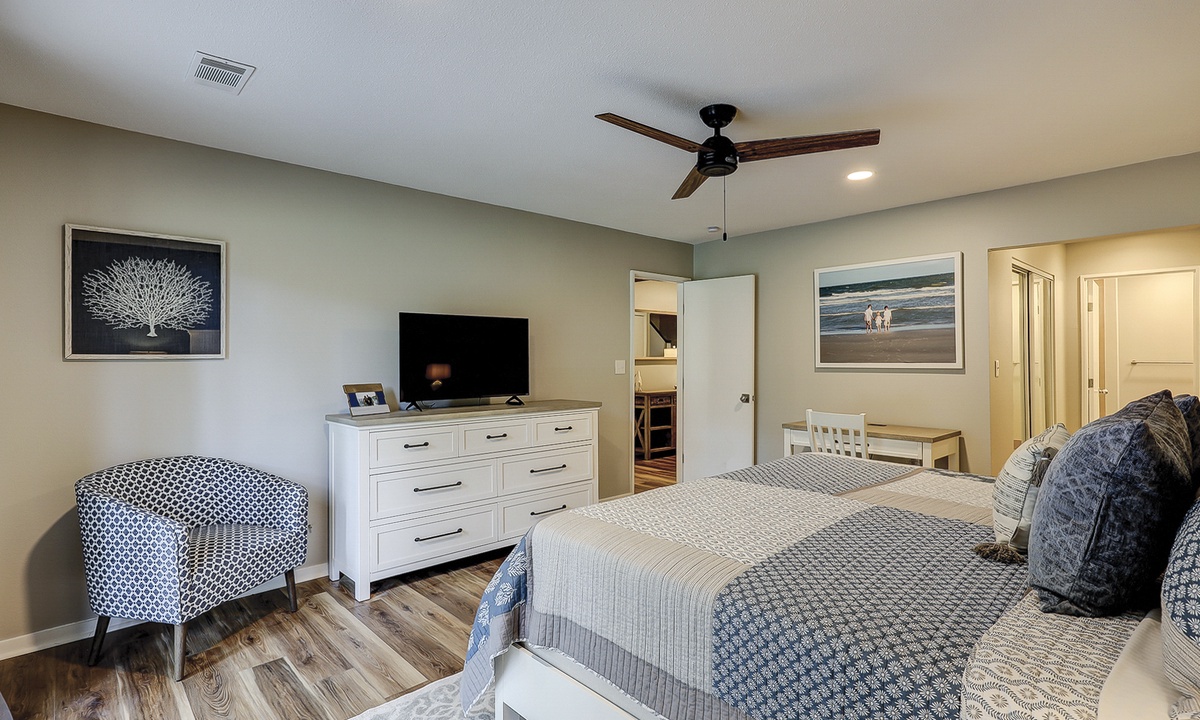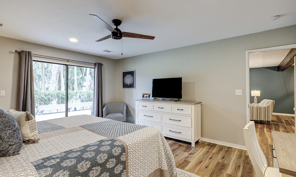 The main bedroom of this Queens Grant vacation rental is also on the first level. This luxurious suite offers a king bed, Smart TV, dedicated workspace, patio access and a stunning private bathroom with double sinks and large walk-in shower.