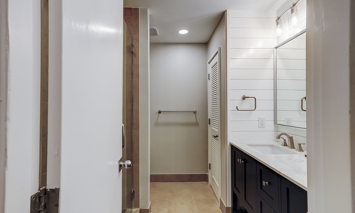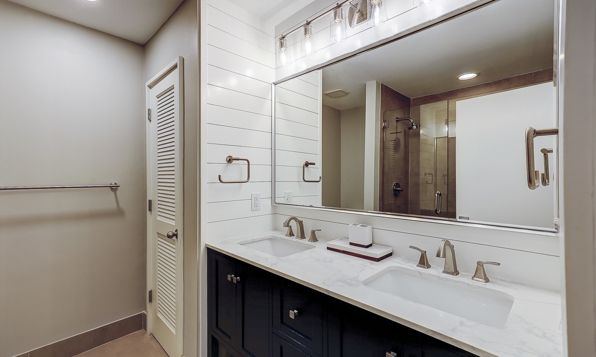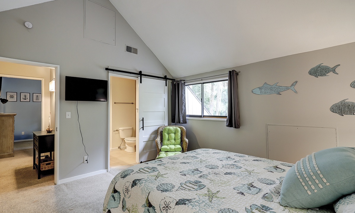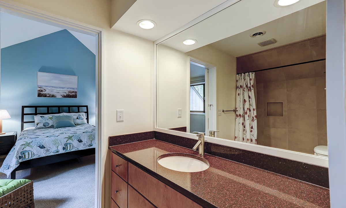 The main bedroom of this Queens Grant vacation rental is also on the first level. This luxurious suite offers a king bed, Smart TV, dedicated workspace, patio access and a stunning private bathroom with double sinks and large walk-in shower.