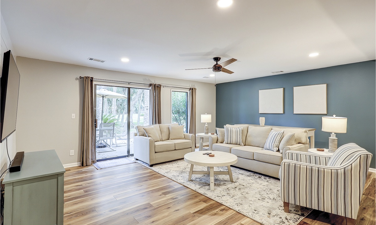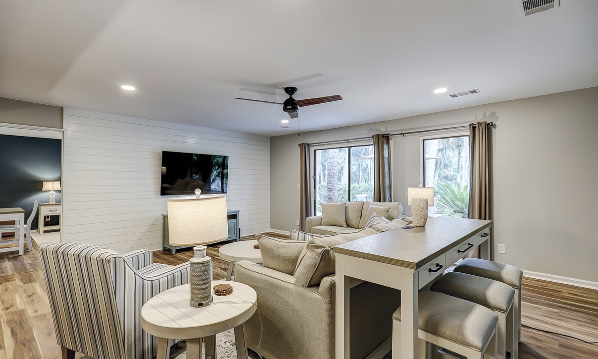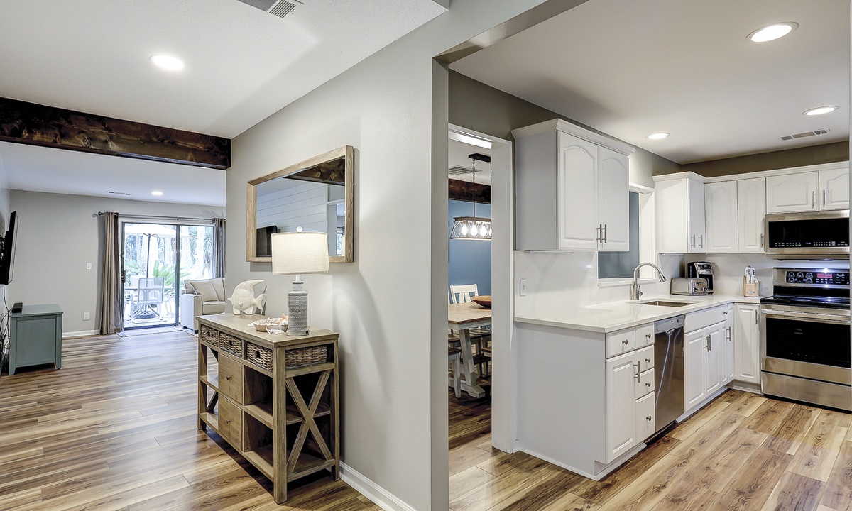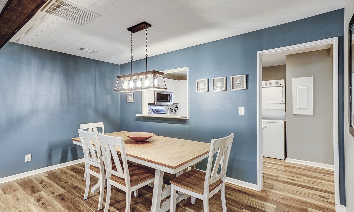 The open concept living area boasts vaulted ceilings, comfortable furnishings and a large, wall-mounted Smart TV. With ample space to lounge and access to the patio through sliding glass doors, this area provides the perfect respite from a long day at the beach. A powder room is located just off the living area for added convenience.