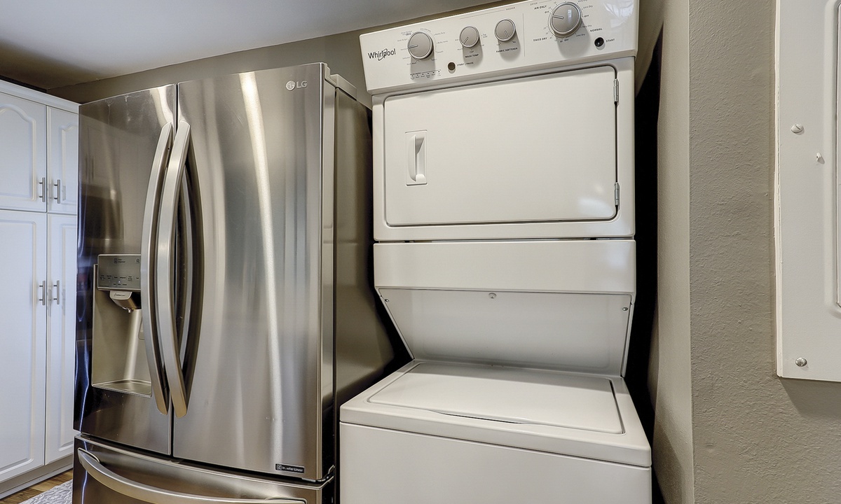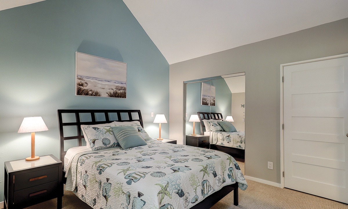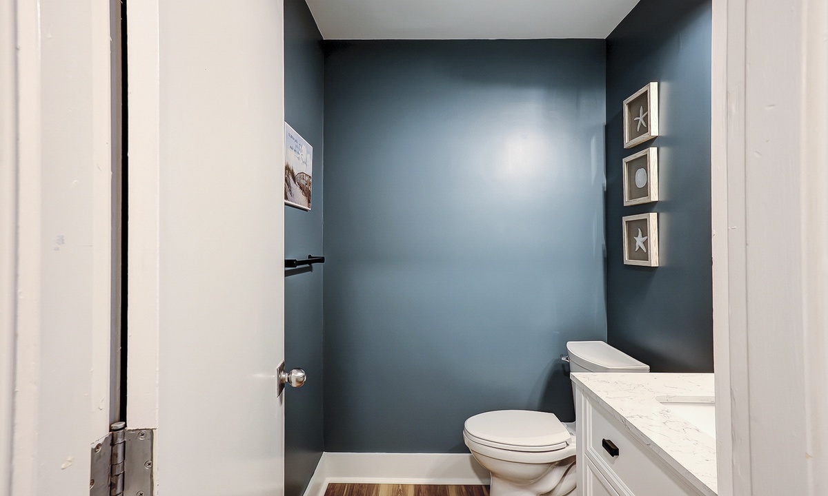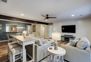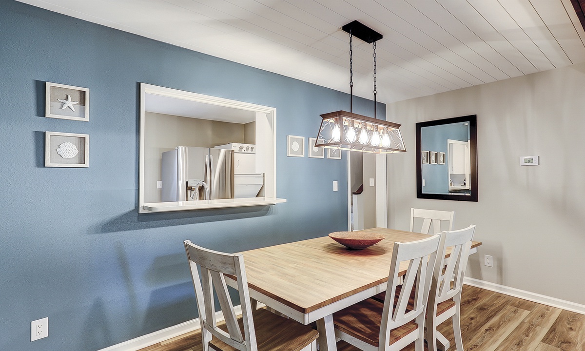 The open concept living area boasts vaulted ceilings, comfortable furnishings and a large, wall-mounted Smart TV. With ample space to lounge and access to the patio through sliding glass doors, this area provides the perfect respite from a long day at the beach. A powder room is located just off the living area for added convenience.