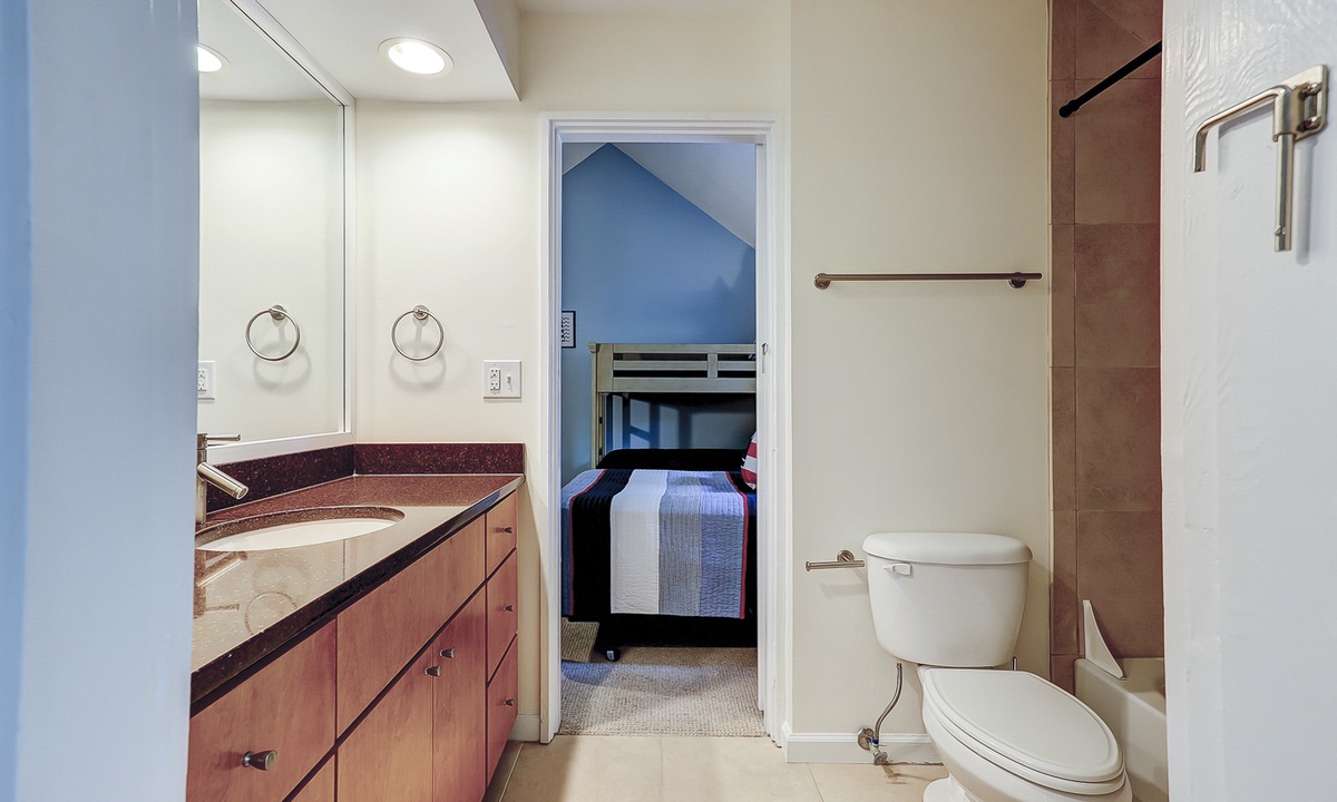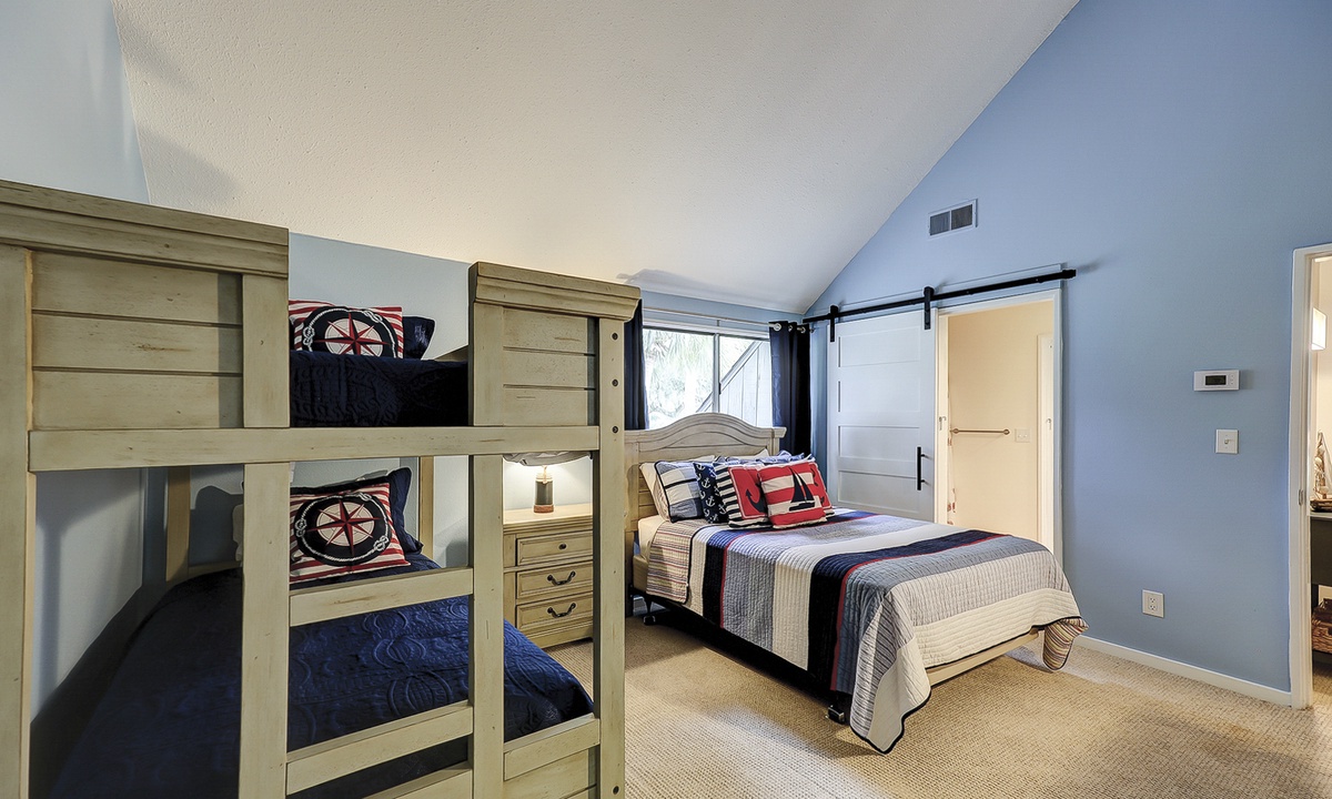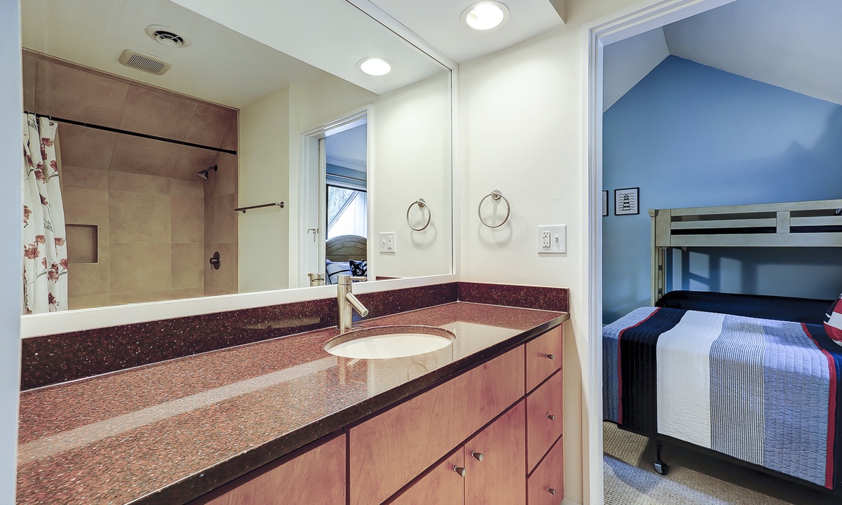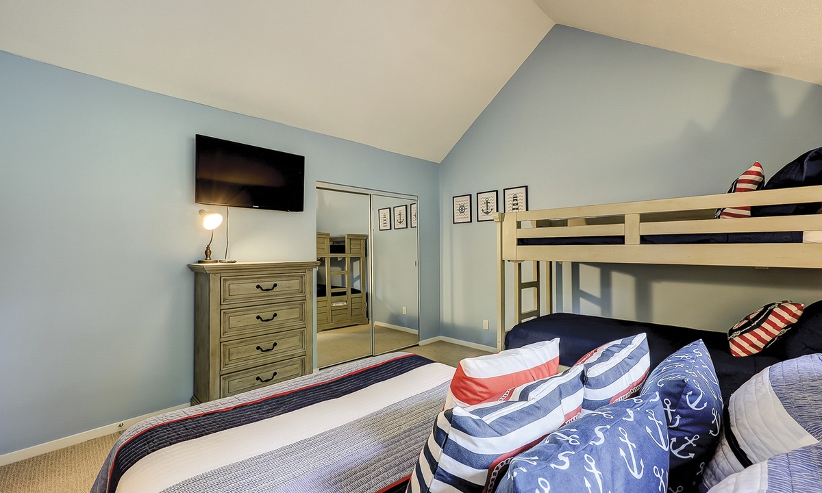 Up the stairs you'll find both guest bedrooms. One bedroom has a queen bed, while the other has a full bed and a set of twin bunks. Both bedrooms have Smart TVs and share access to a jack and jill bathroom with a tub/shower combination.