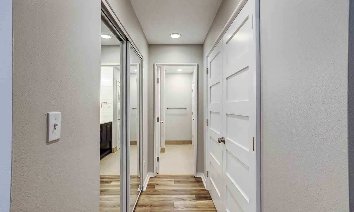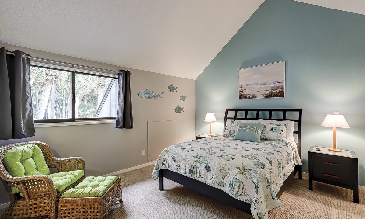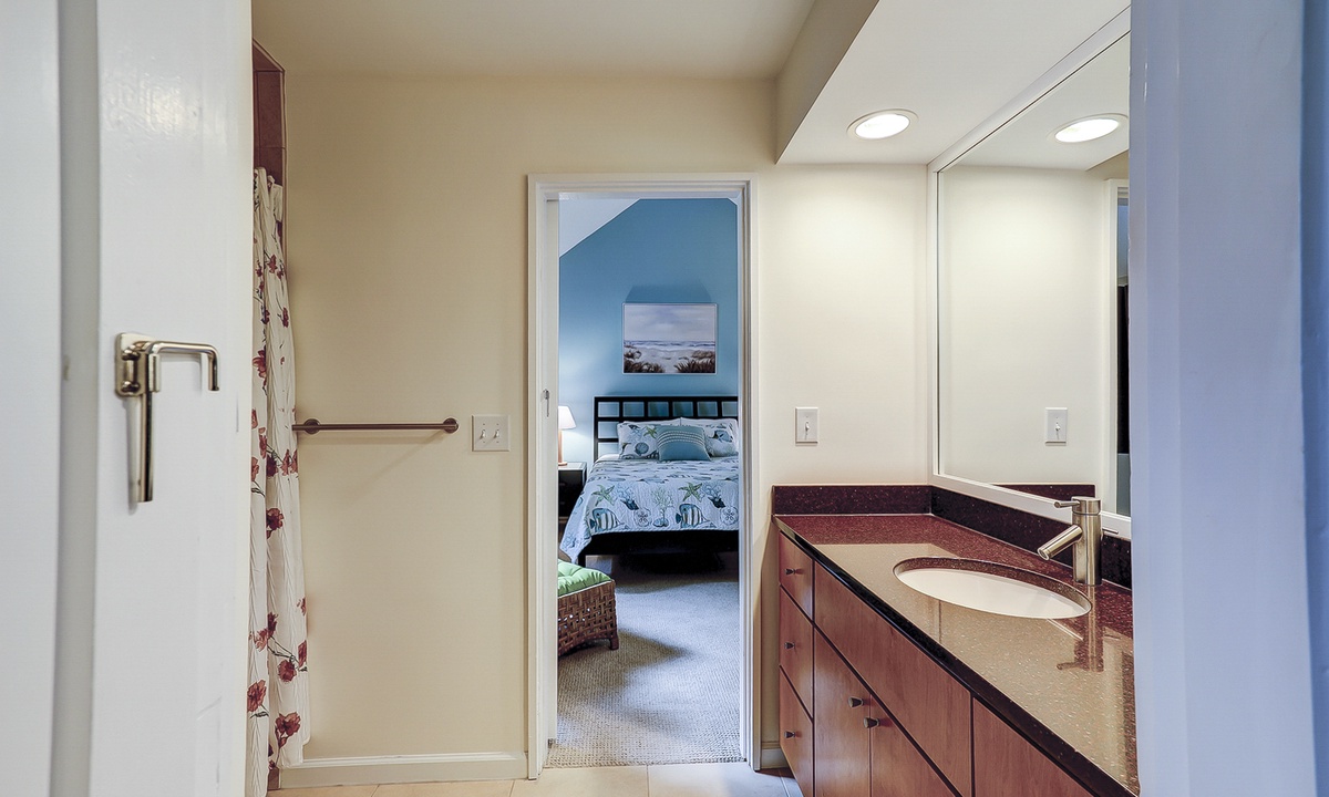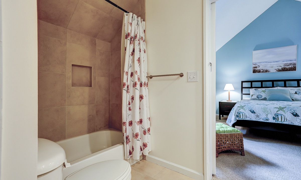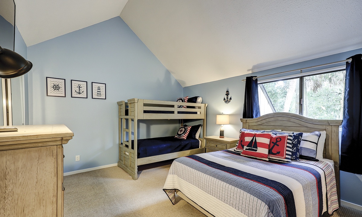 Up the stairs you'll find both guest bedrooms. One bedroom has a queen bed, while the other has a full bed and a set of twin bunks. Both bedrooms have Smart TVs and share access to a jack and jill bathroom with a tub/shower combination.