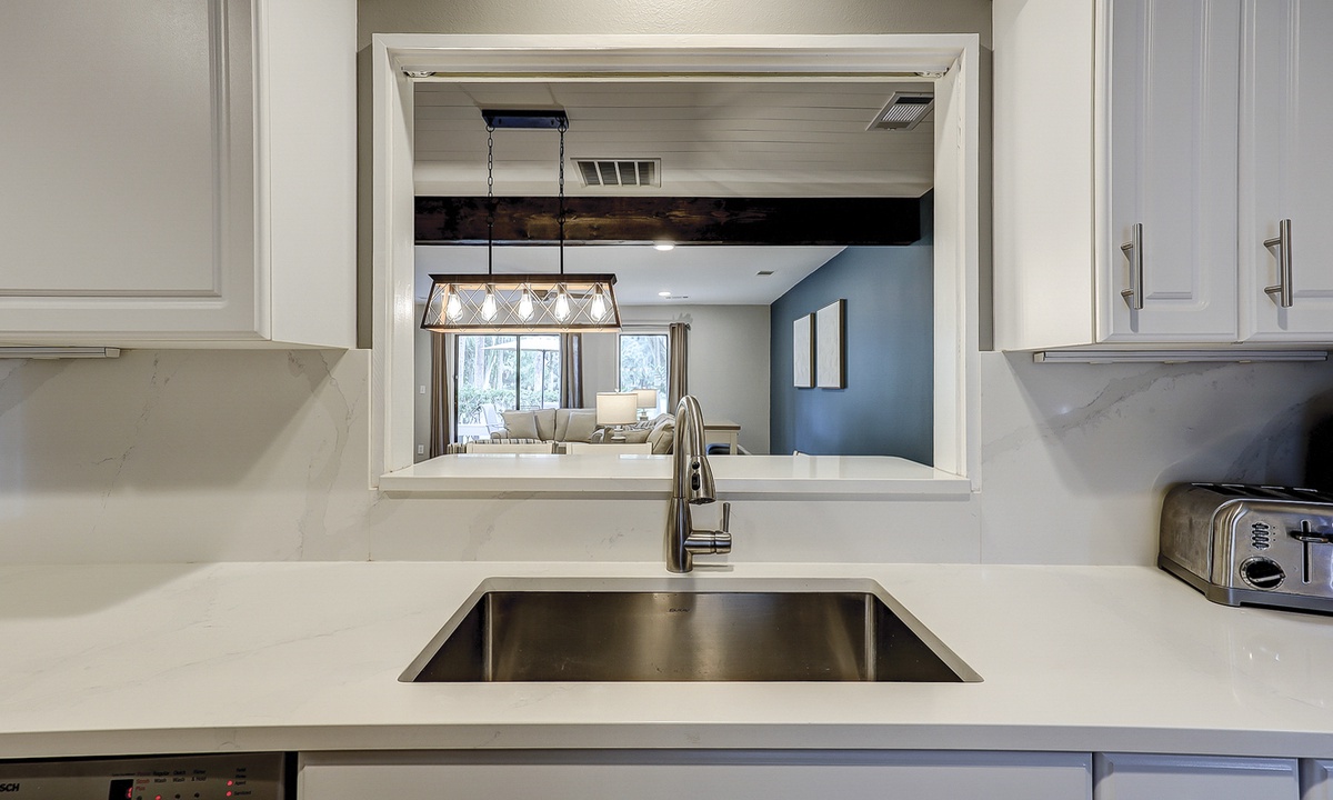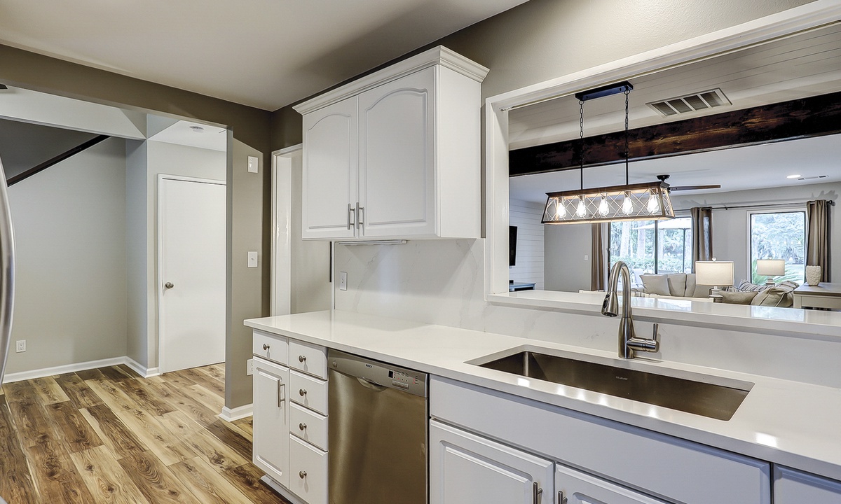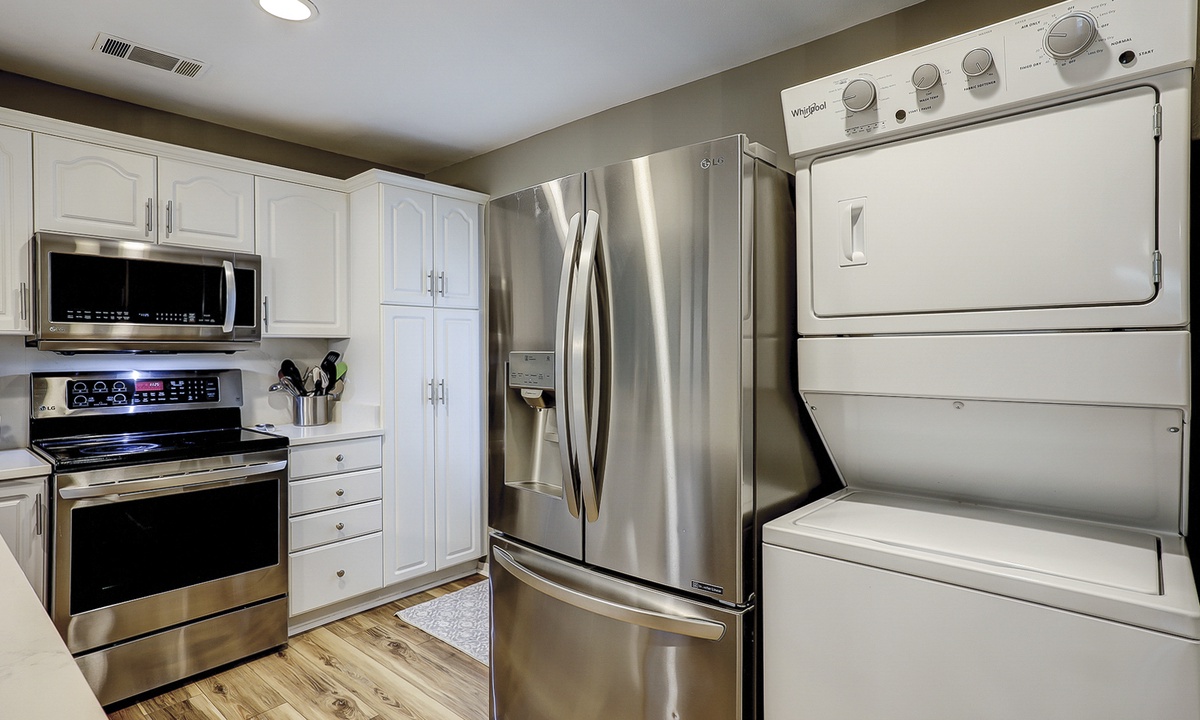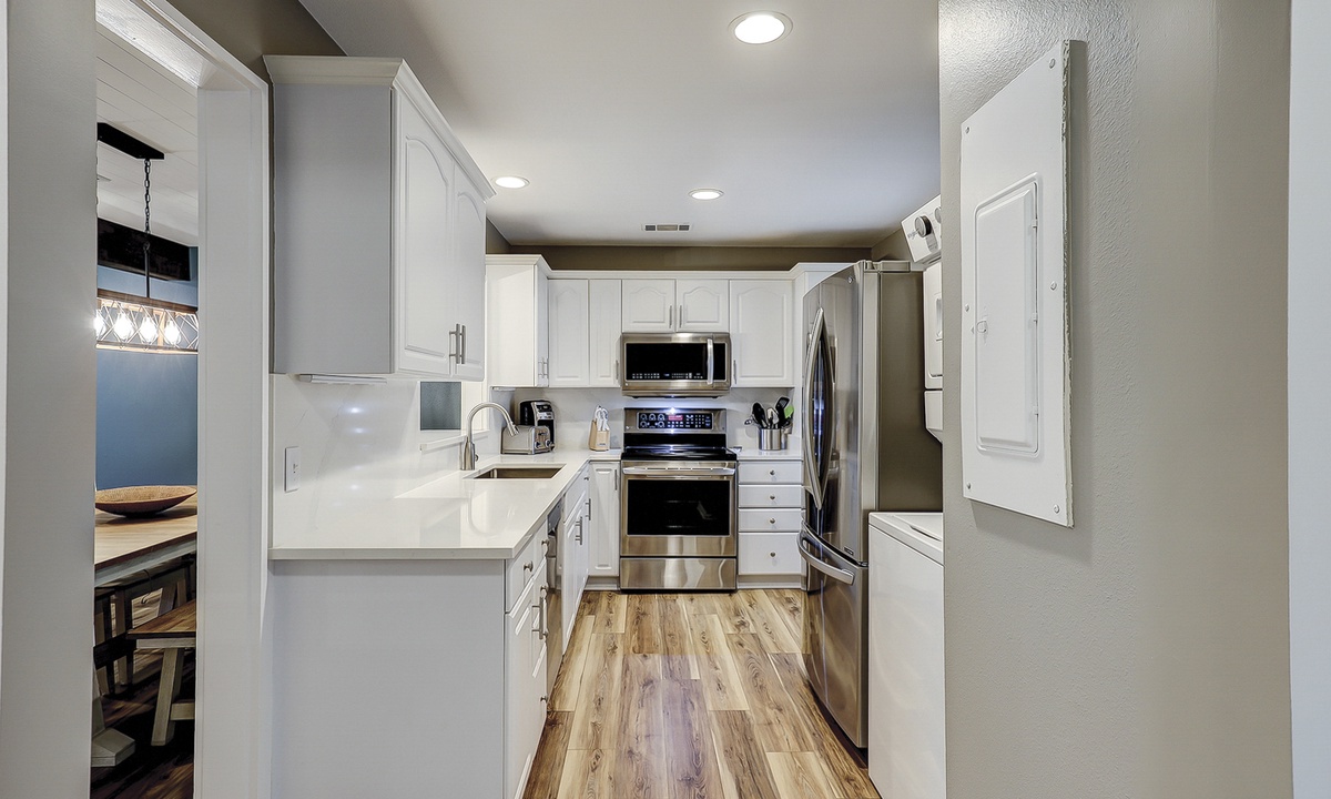 The well-appointed kitchen has stainless appliances, new countertops and is fully outfitted to make cooking a breeze.