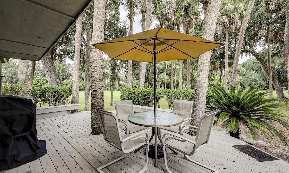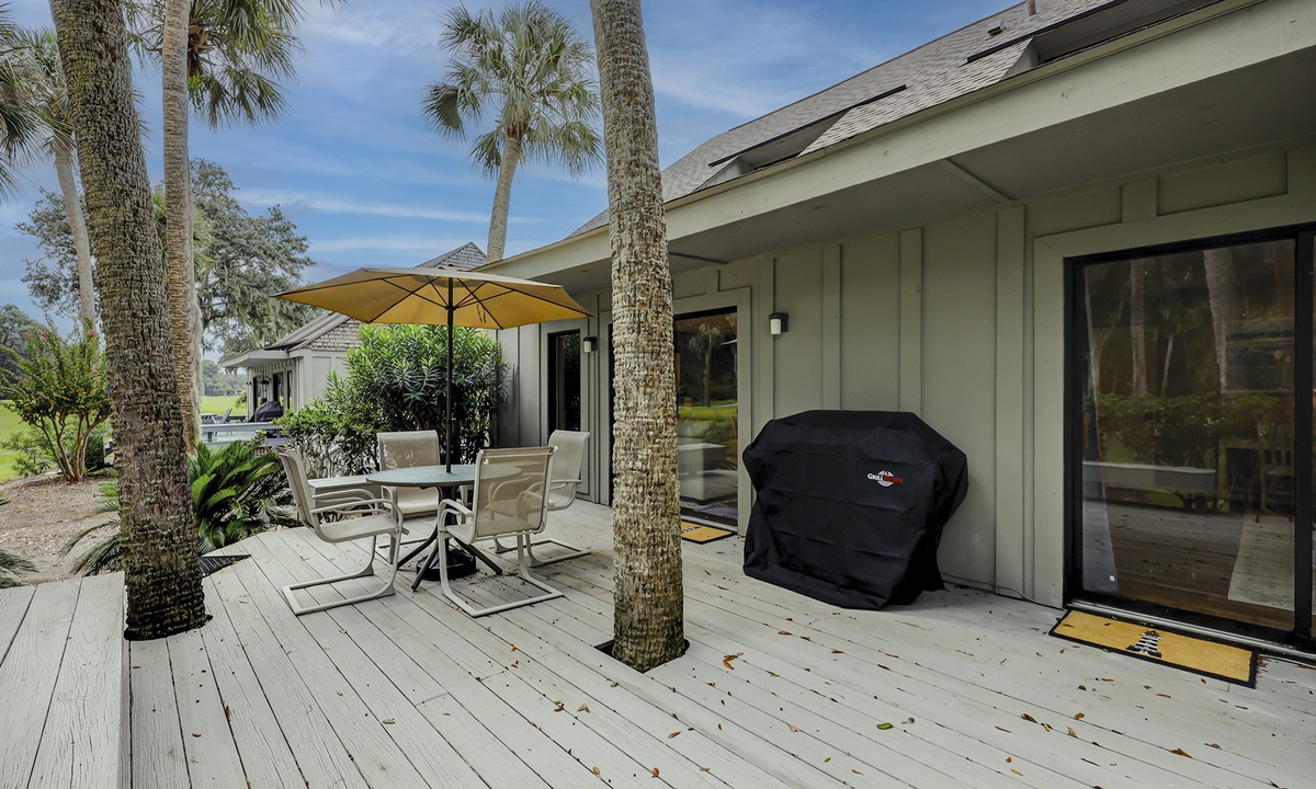 The elevated patio offers golf course views, ample seating and a gas grill.