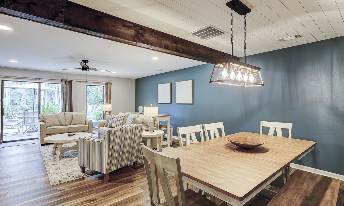 The dining area beyond seats 6 comfortably with additional seating for 2 in the elevated bar off the living area.