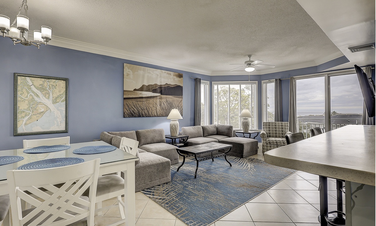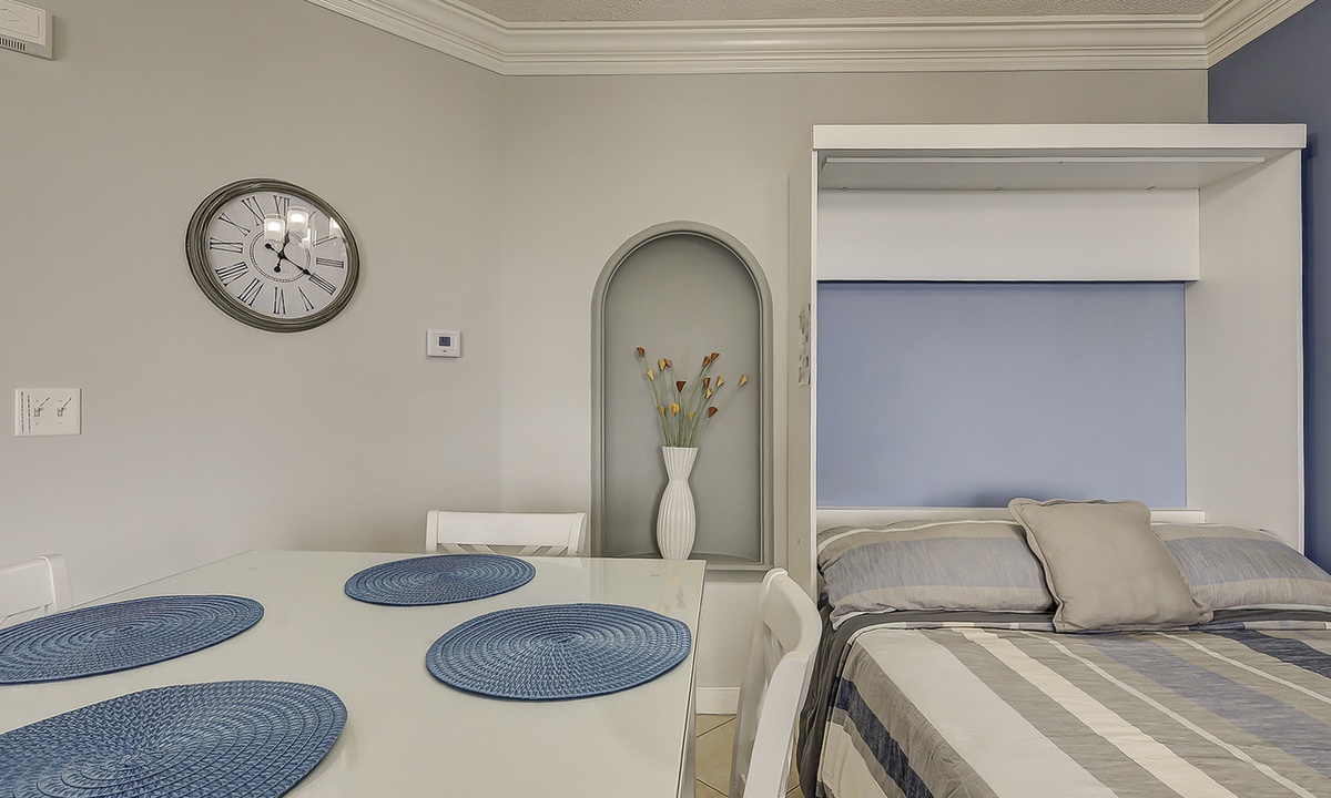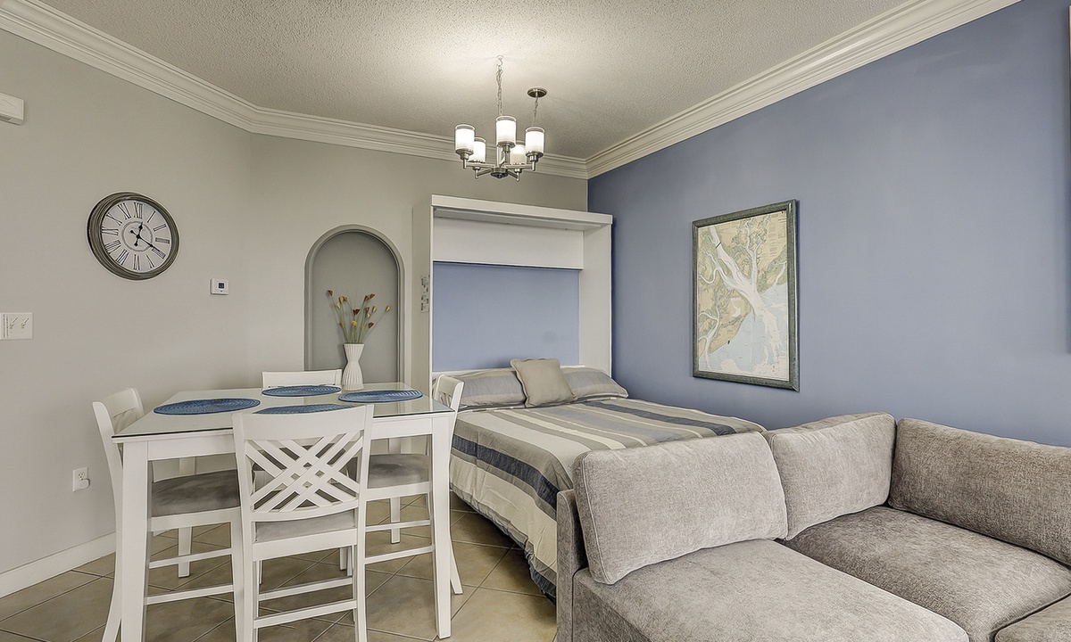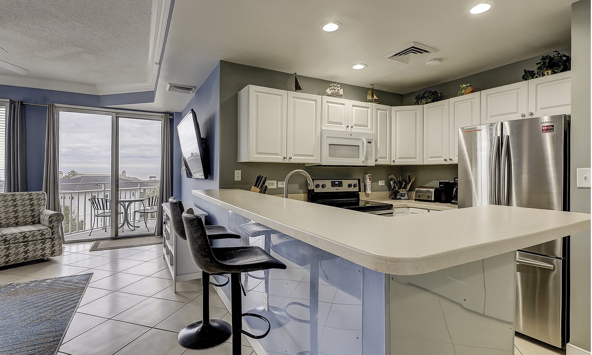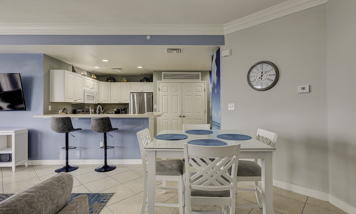 2405 Sea Crest features an open-concept floor plan with tile and LVP flooring throughout. The living area is comfortably furnished with a leather electric reclining sofa, two swivel chairs- perfect for admiring the ocean view and a Smart TV. The plush murphy bed is located just off the living room area, as is the powder room and dining area that seats 4. Additional seating for 2 can be found at the kitchen bar.