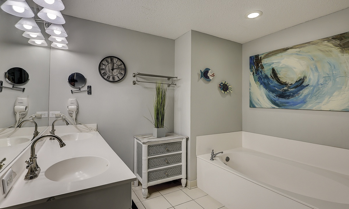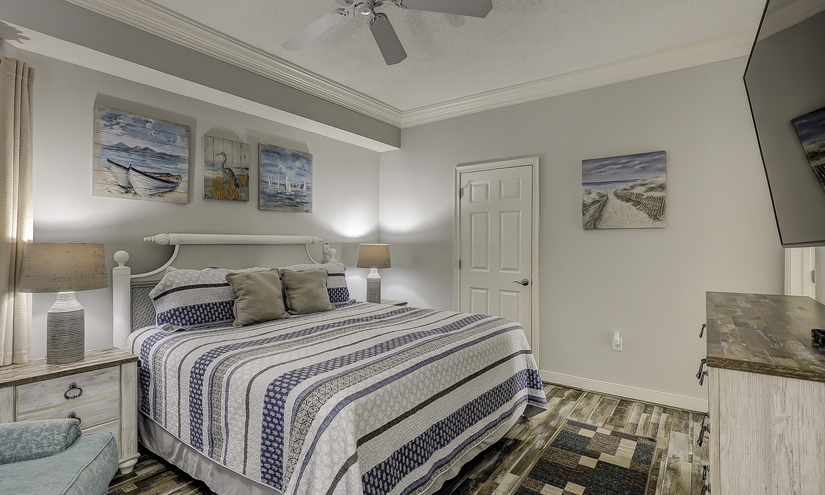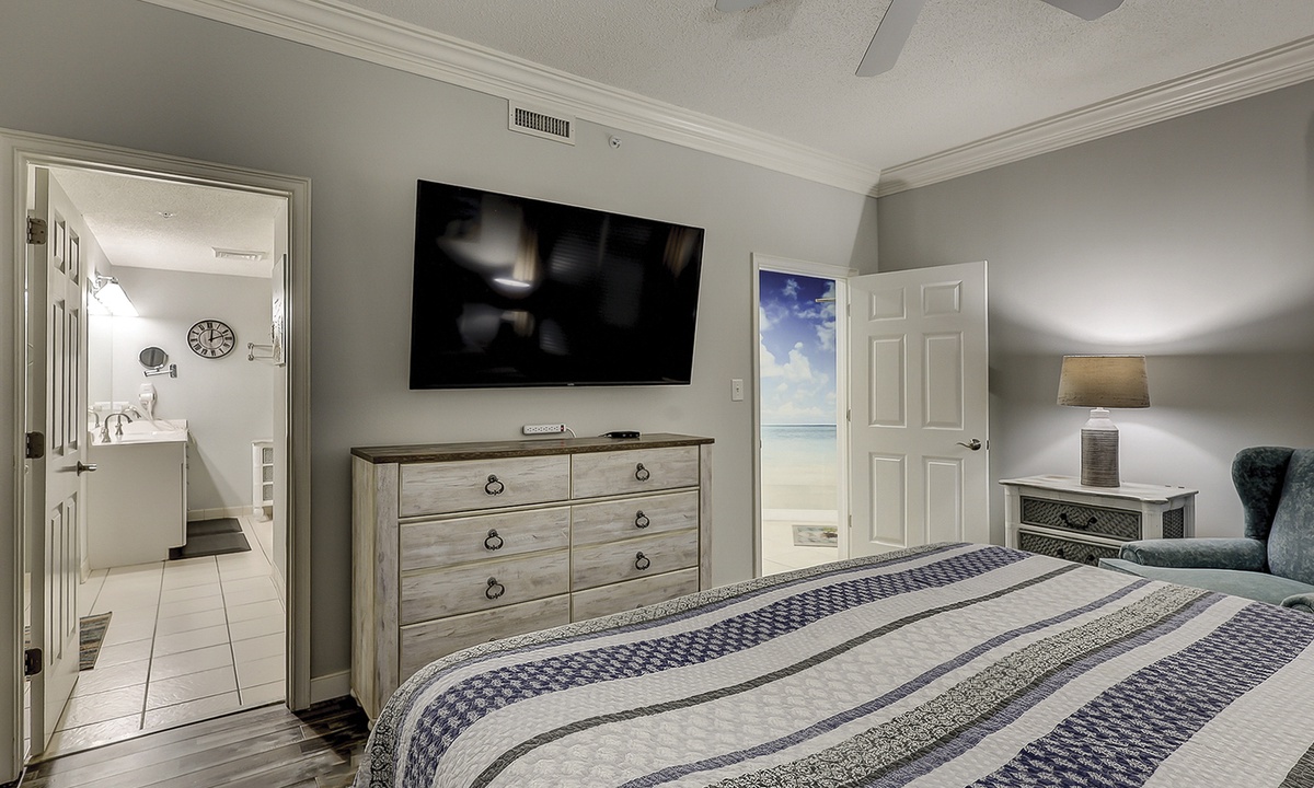 The bedroom features a California king bed, Smart TV and a large walk-in closet. The private bathroom features a soaking tub and separate walk-in shower.
