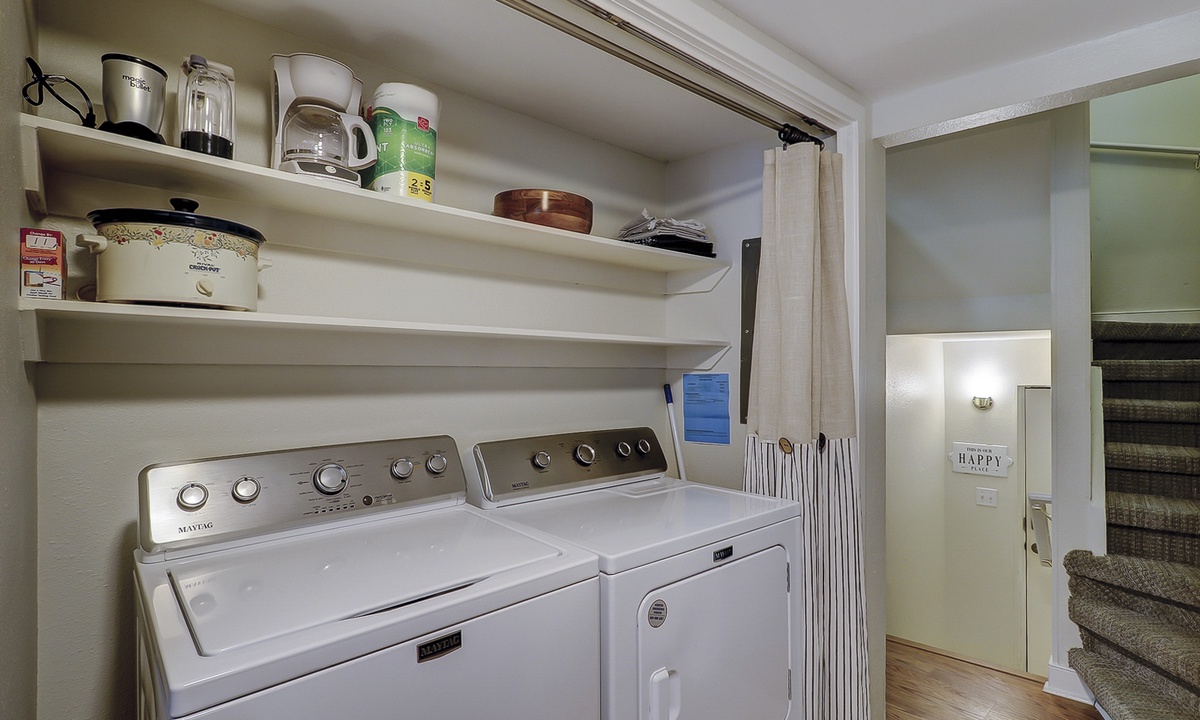 Up the stairs you'll find two bedrooms and two bathrooms. The primary bedroom has a queen bed, flat screen TV with streaming capabilities, floor to ceiling windows and a private bathroom with a tub/shower combination.