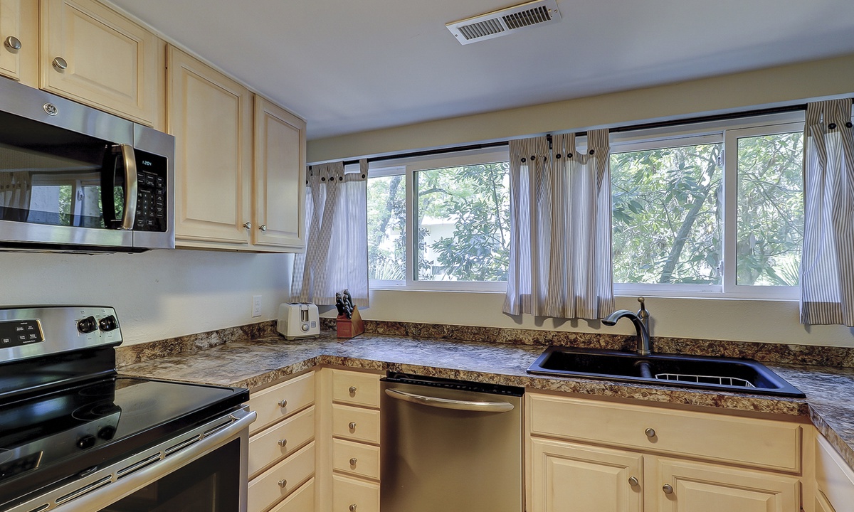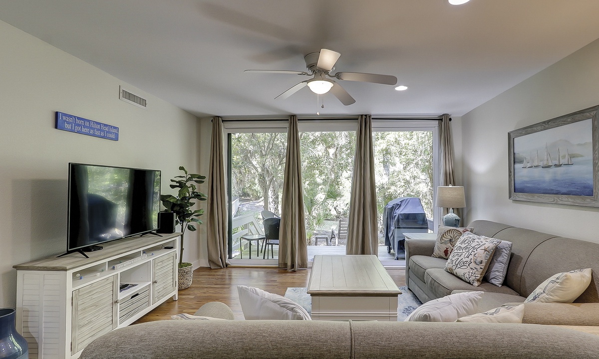The living area features comfortable furnishings, including a sleeper sofa, as well as a flat screen TV with streaming capabilities and plenty of room for the whole family to sit back and relax. Large sliding glass doors lead to the private patio complete with a gas grill and island scenery, allowing abundant light to flood through the living space.