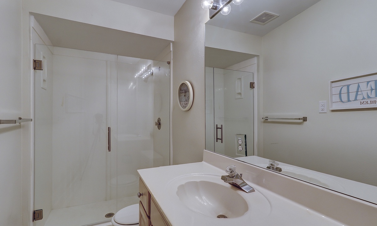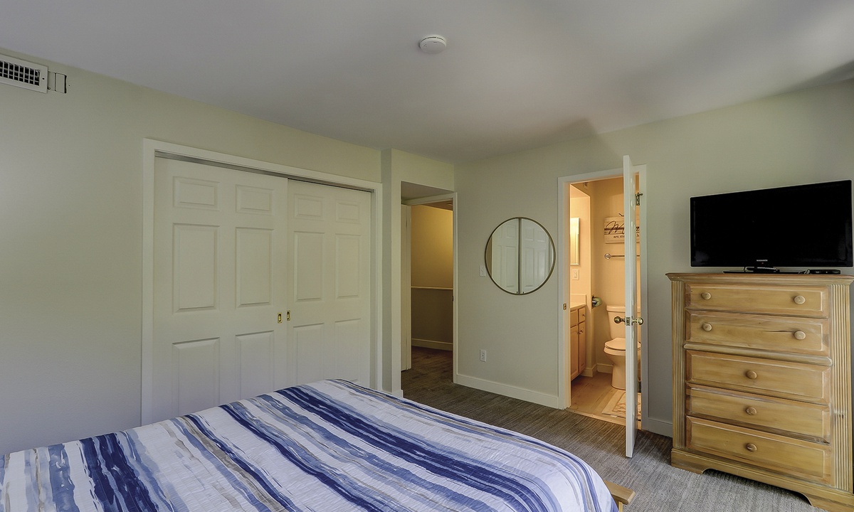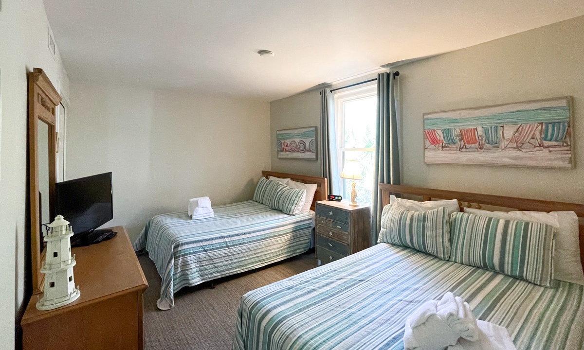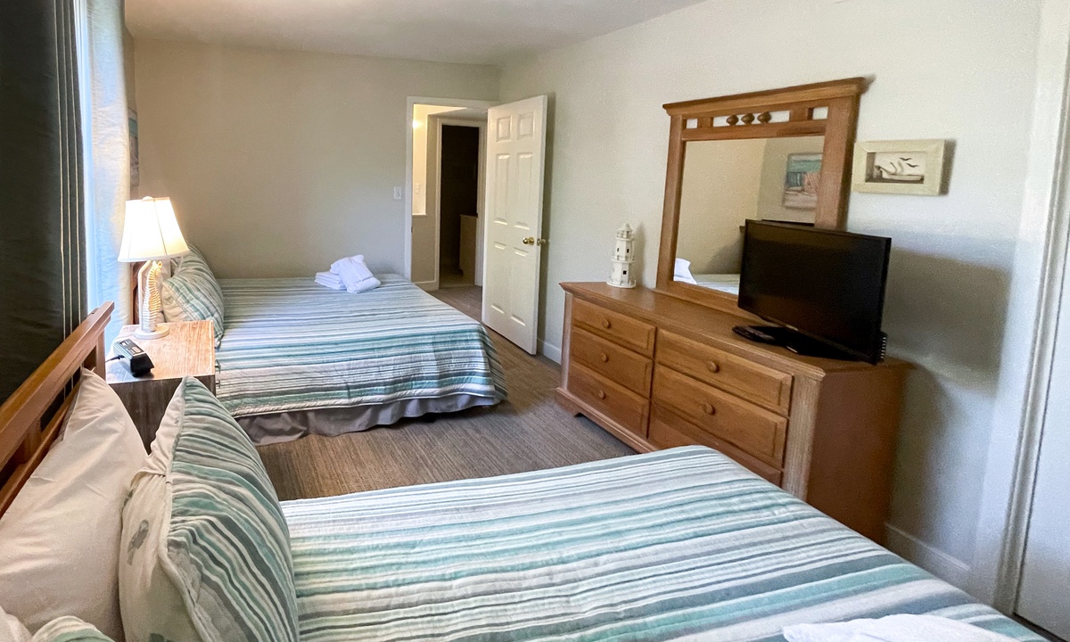 The guest bedroom features two queen beds, a TV with streaming capabilities, and has access to the hall bathroom with a walk-in shower.