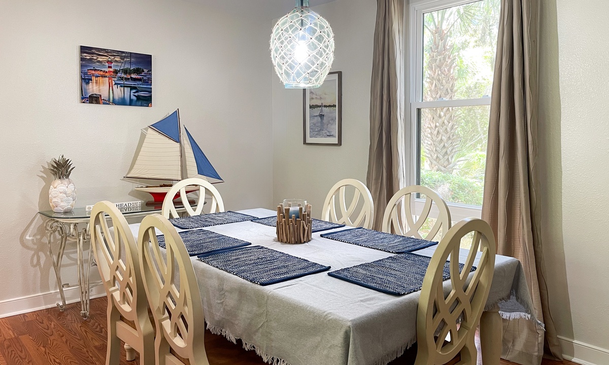 The dining area comfortably seats 6 and offers well-lit views of the living area and patio. The kitchen features plenty of counter space, high-end stainless steel appliances, and everything you need to cook a meal right from home. This luxurious villa includes all the comforts of home, including family games perfect for bonding time around the dinner table or to make the most out of a rainy day.