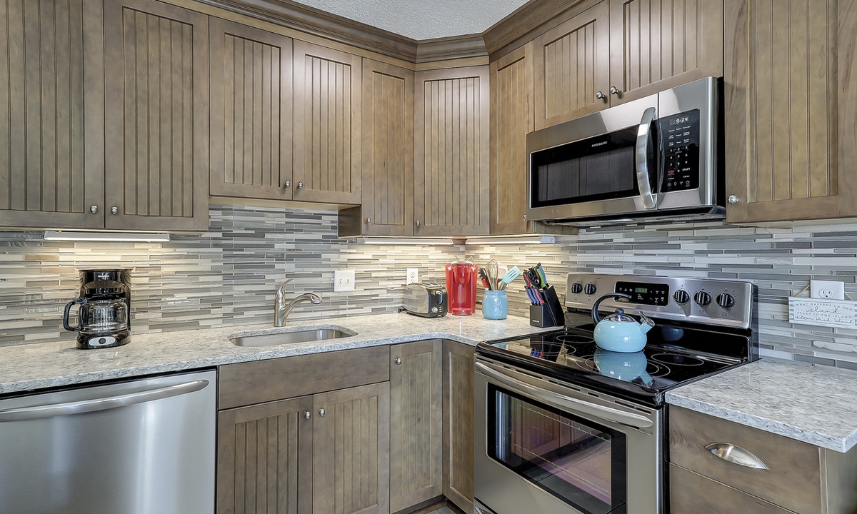 The deluxe kitchen features stainless appliances, custom cabinetry and a tiled back splash.