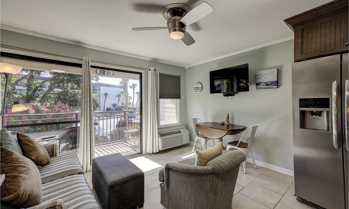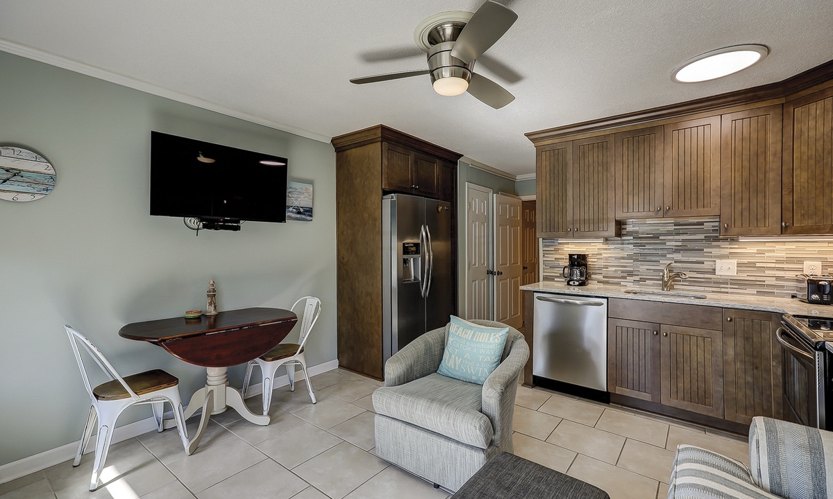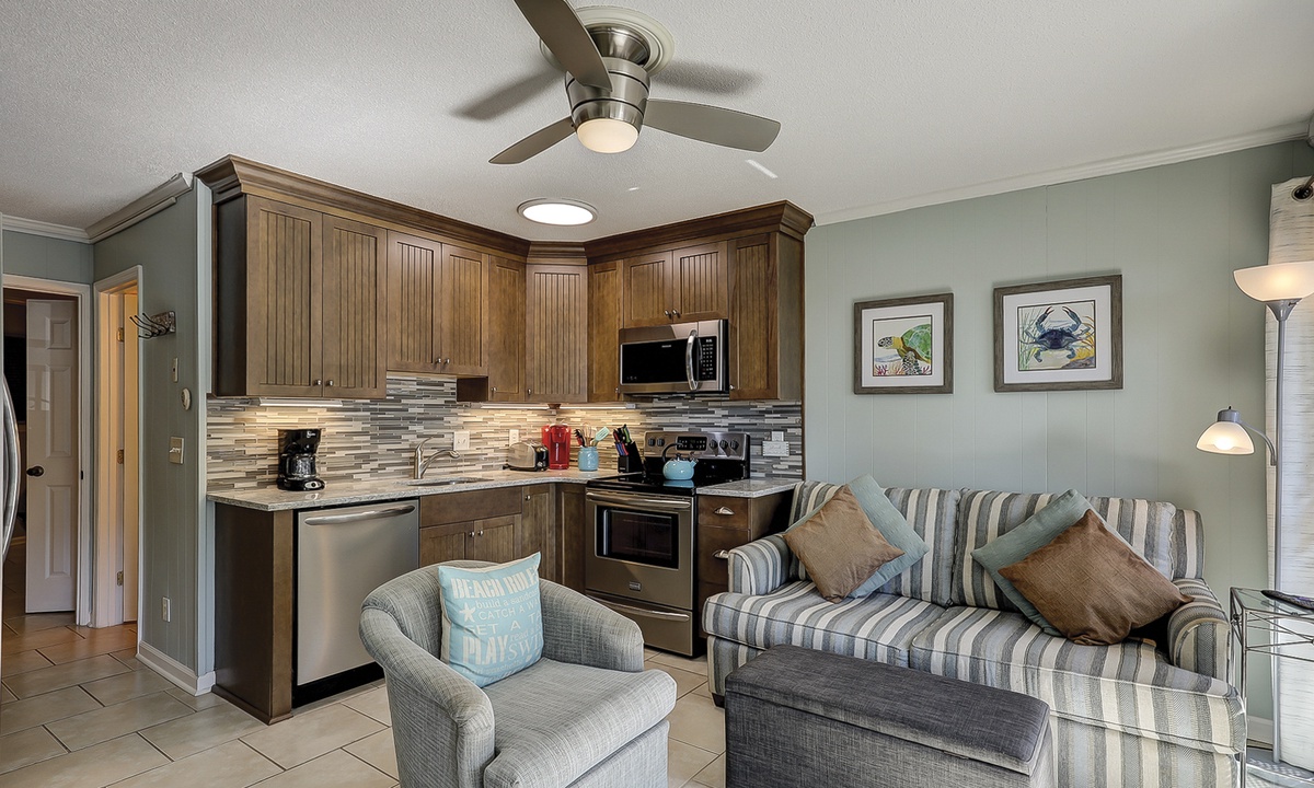 160 Seaside is a beautifully renovated and newly furnished elevated first level condo. The open living room offers plush furniture, including a sleeper sofa, a Smart TV and access to the private balcony through sliding glass doors.