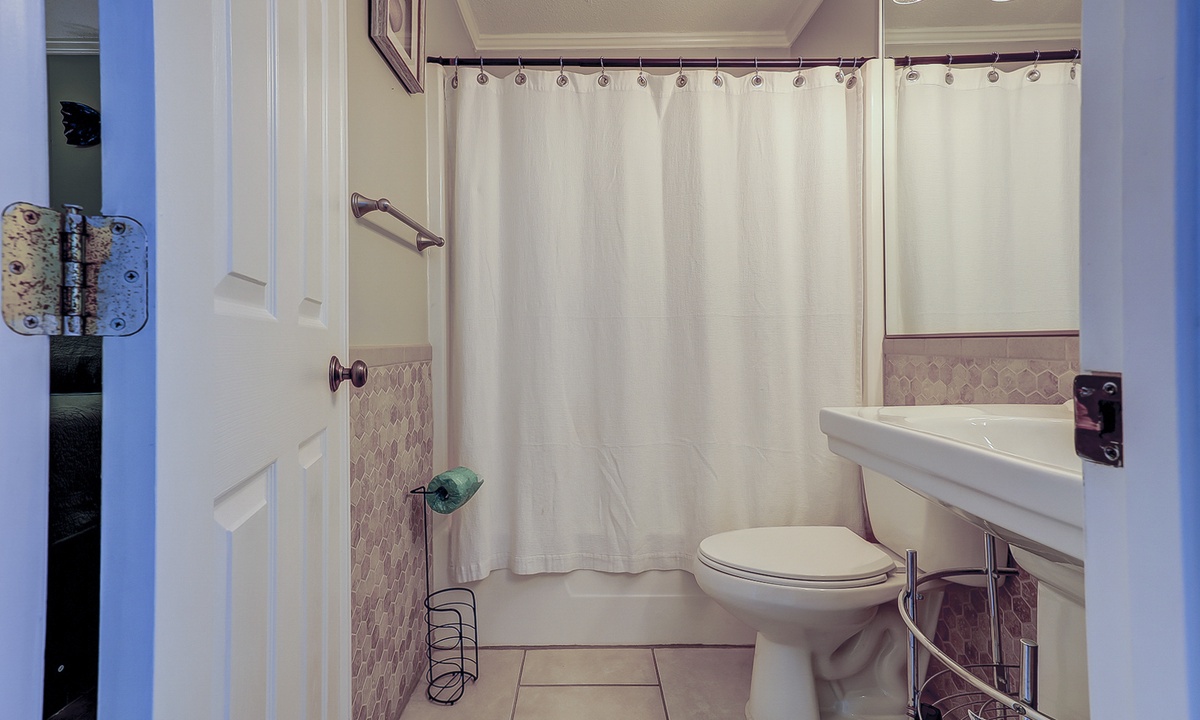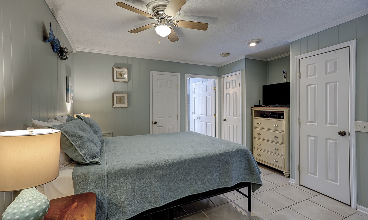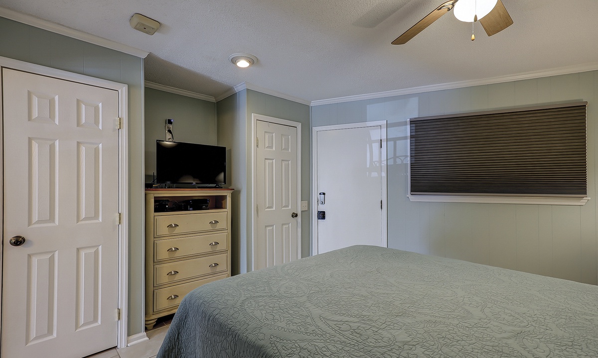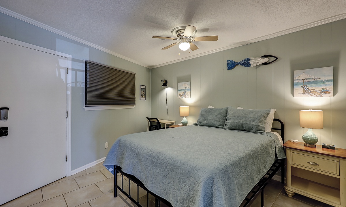 The bedroom area has a queen bed, Smart TV and closet space. The bathroom has a tub/shower combination and pedestal sink.