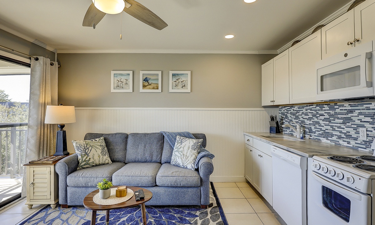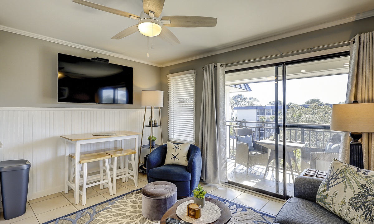 The living area features a comfortable sleeper sofa, 58” smart TV, and a dining/desk table with seating for four. You can enjoy stunning ocean views right from home in the living area or on the private deck through a sliding glass door.