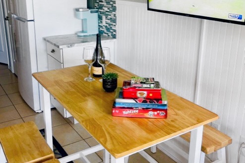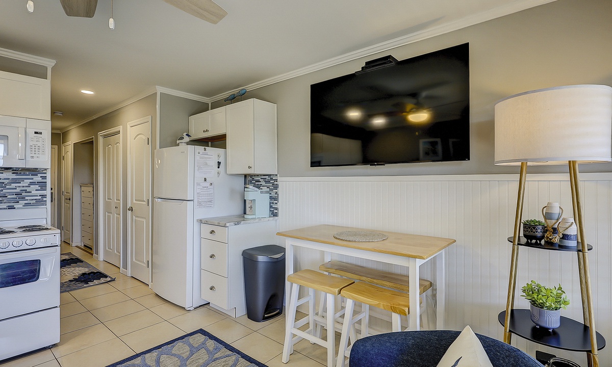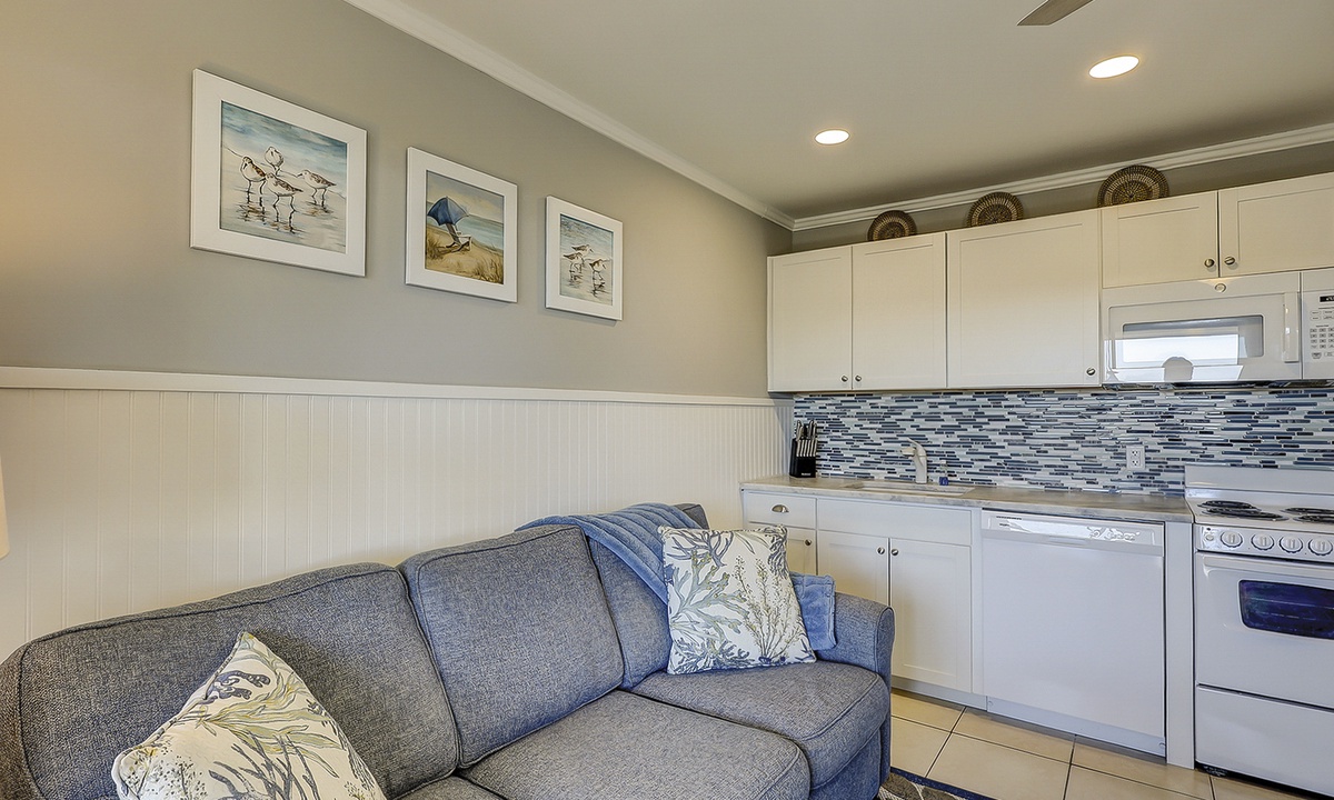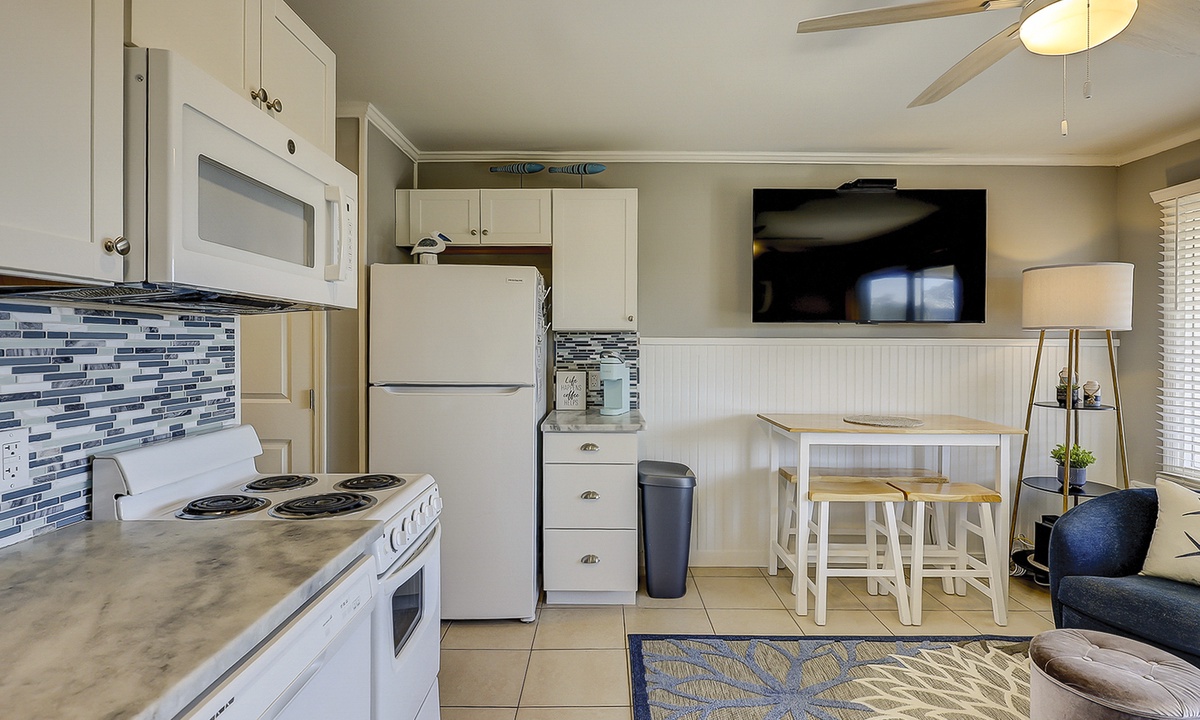 The newly renovated kitchen features stone counters, coastal inspired backsplash, full size refrigerator and dishwasher, a stove/oven, full size microwave, and everything needed to cook and dine in!