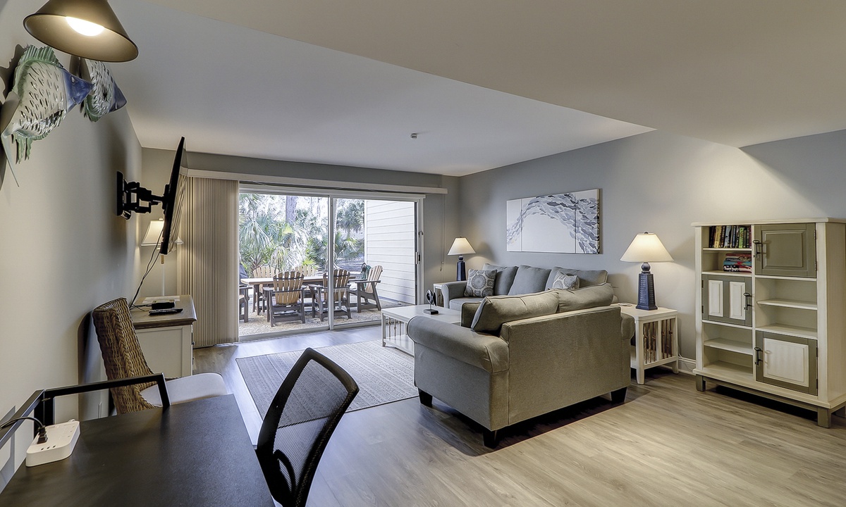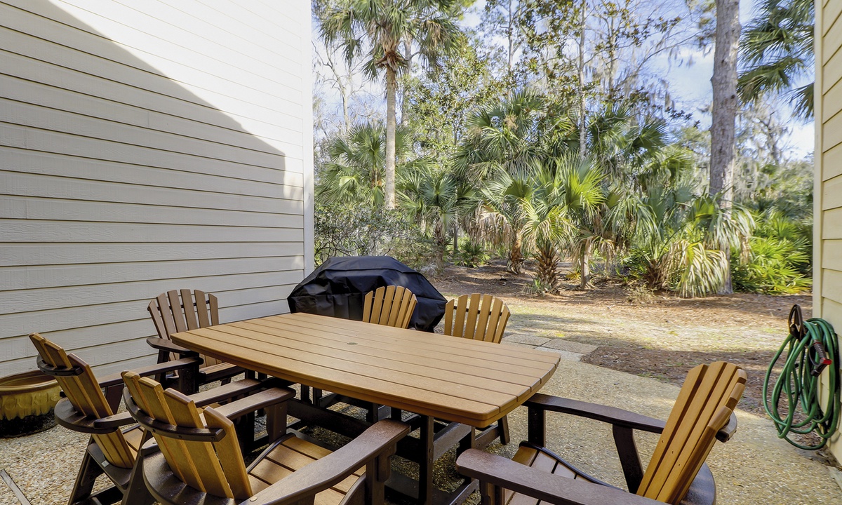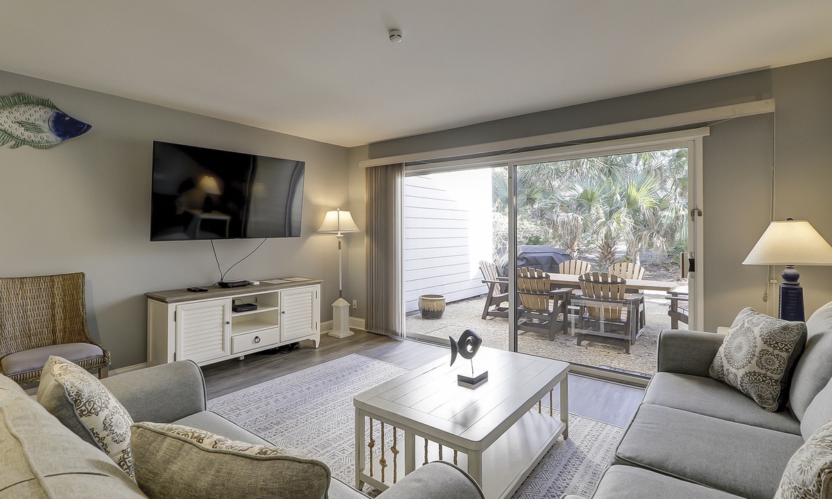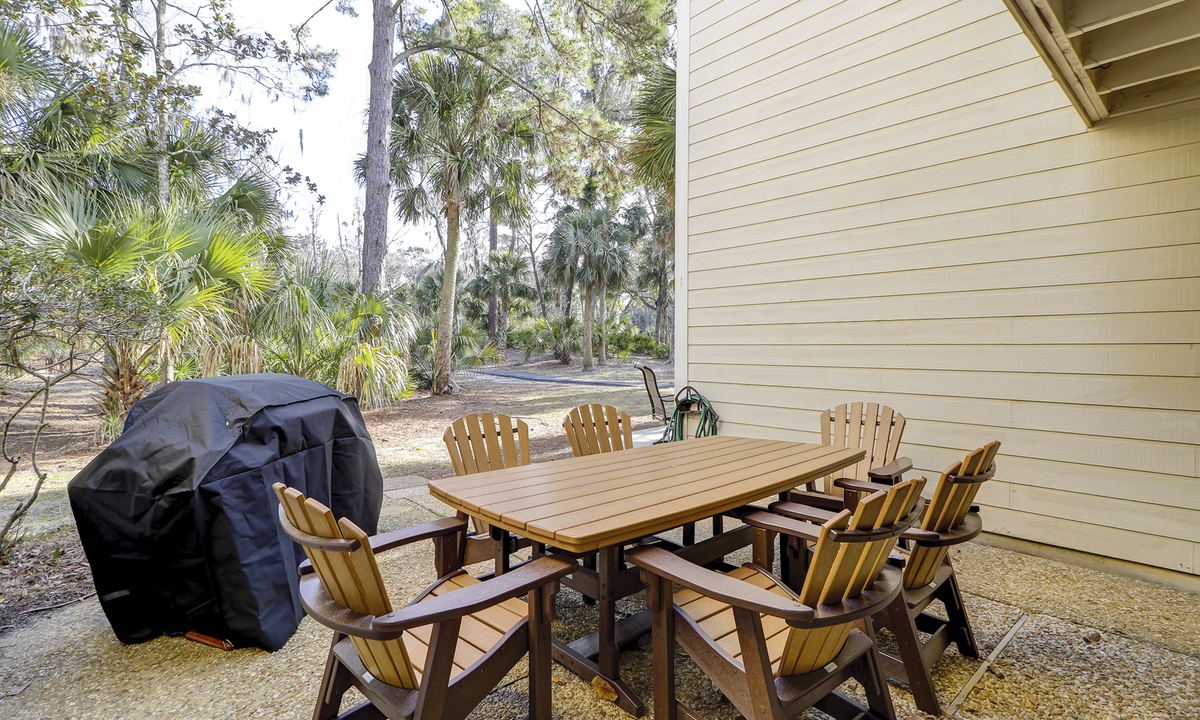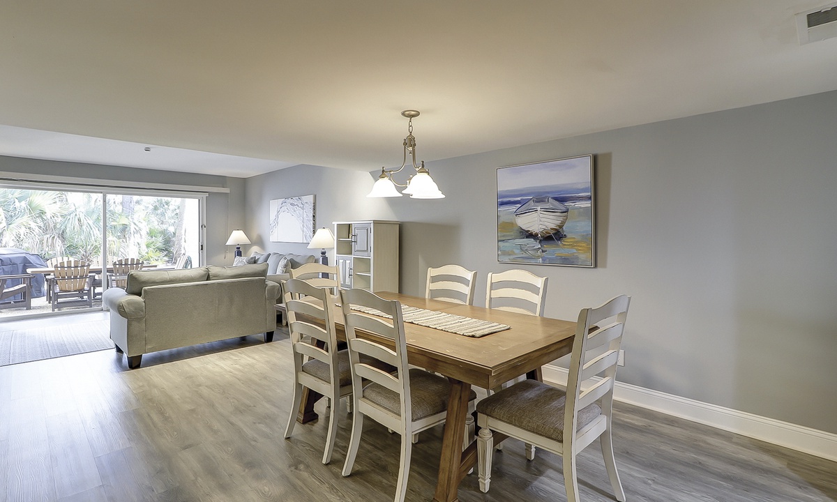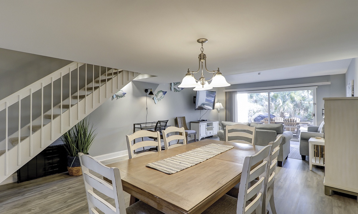 This immaculate and well-appointed Shipyard Hilton Head Island rental villa offers all the comforts of home, including a work station and high speed internet. The renovated kitchen opens to a roomy dining area. The adjoining living room is comfortably furnished and affords slider door access to a private outside patio with table and chairs, along with a grill. Also on the main floor are a laundry room and convenient half bath.
