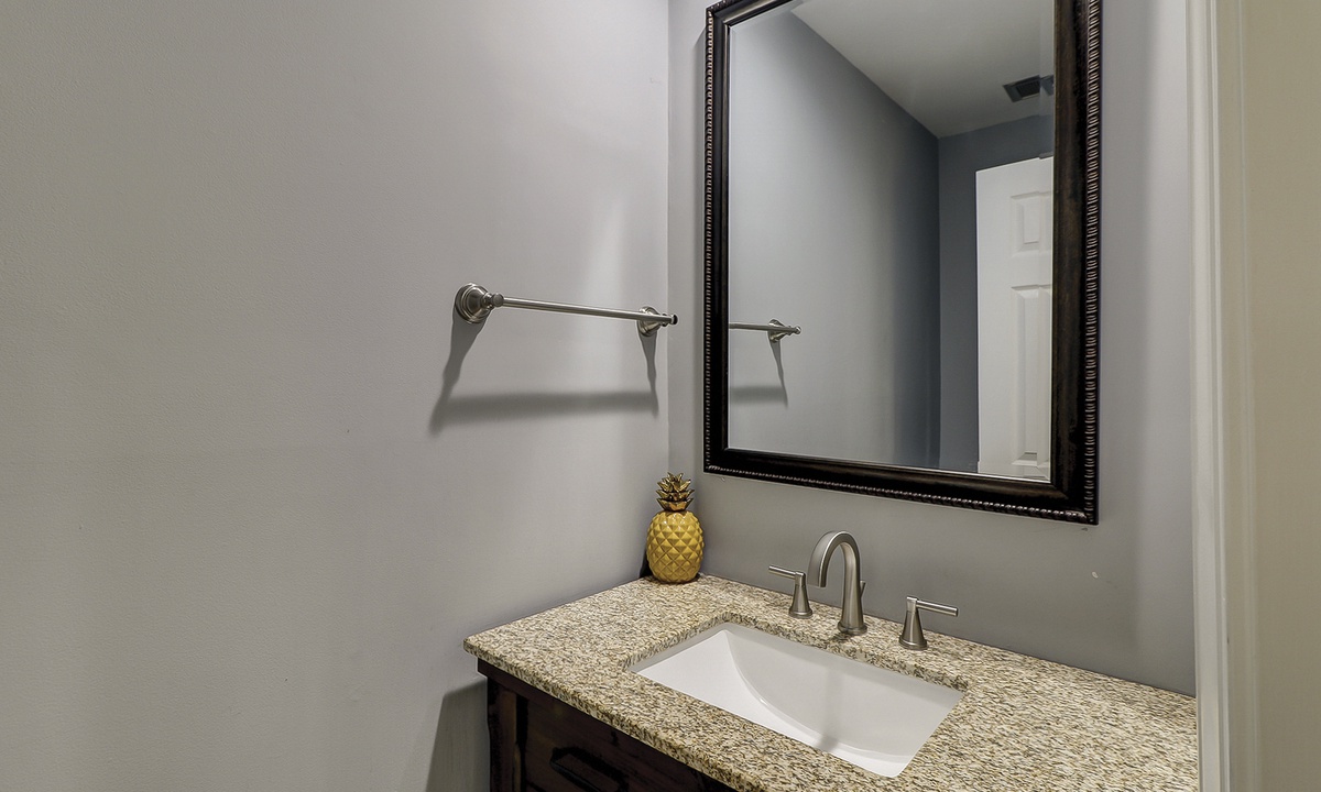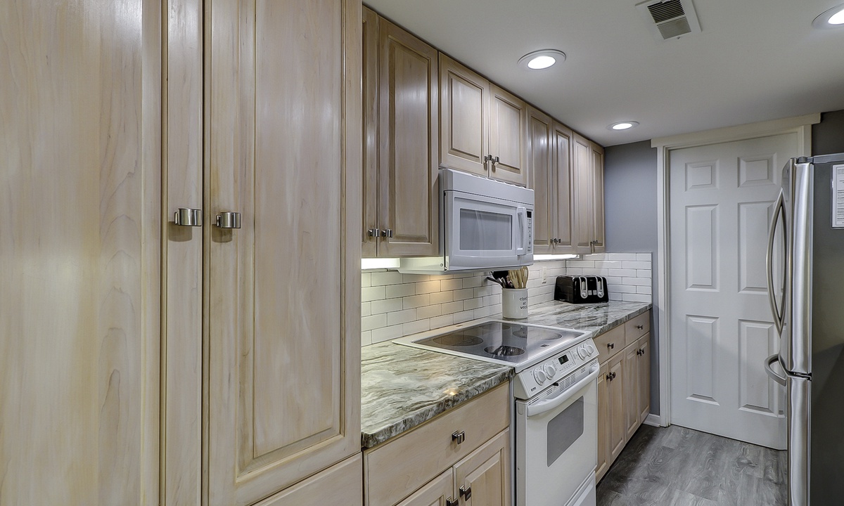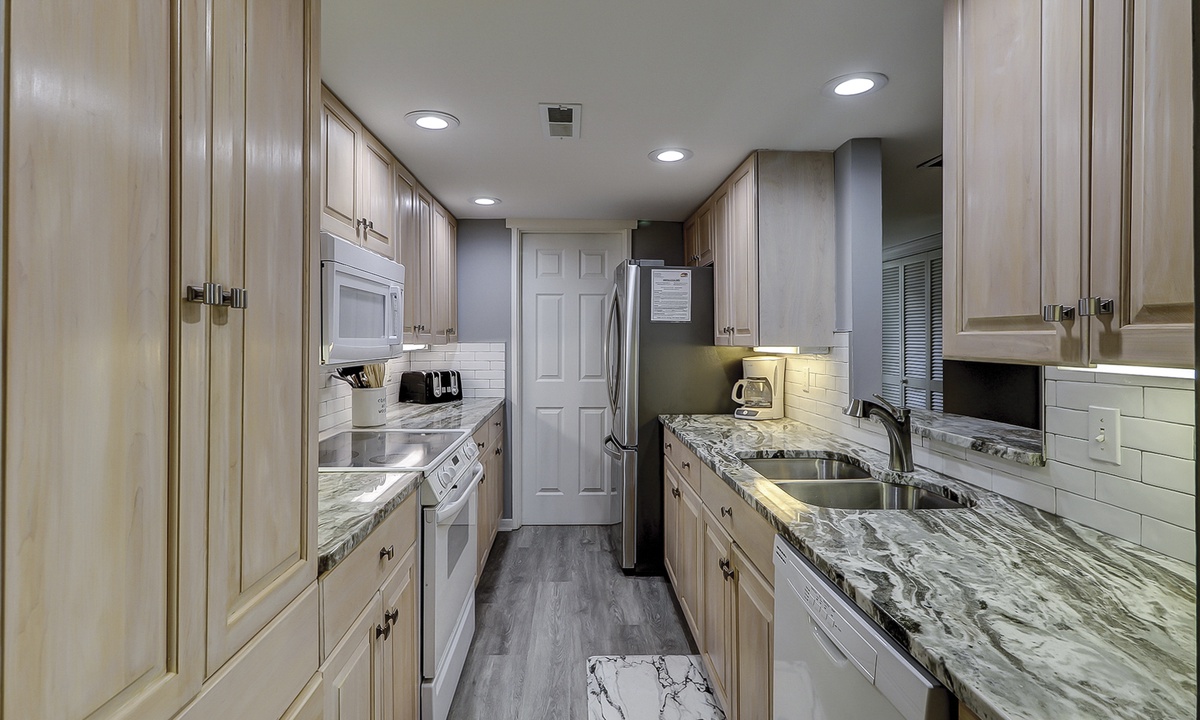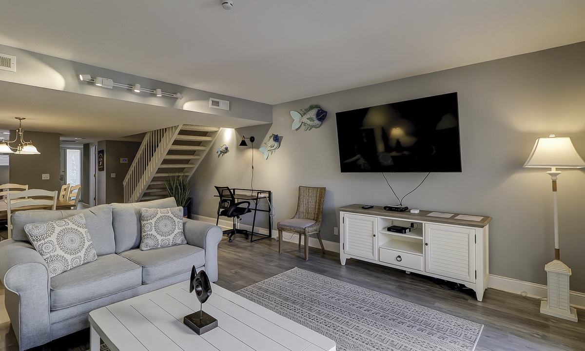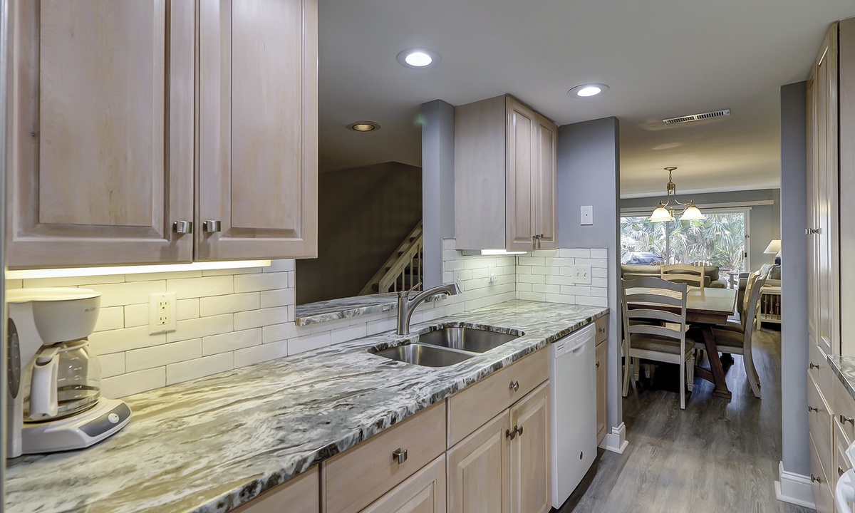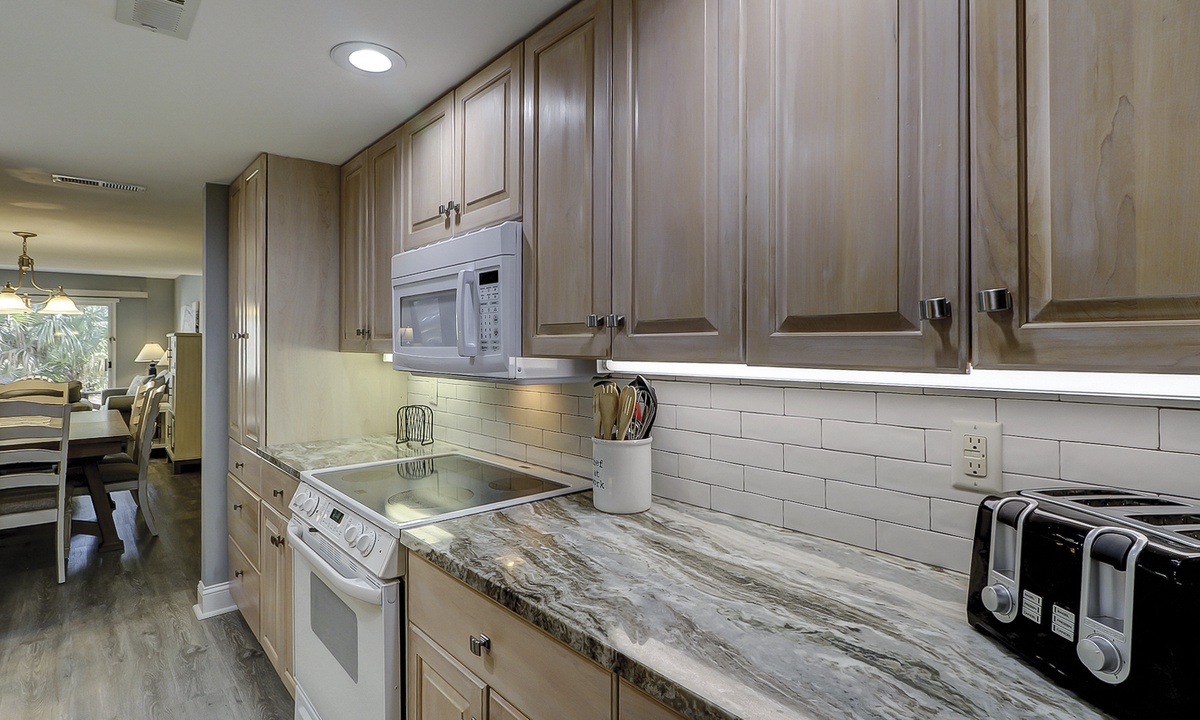 This immaculate and well-appointed Shipyard Hilton Head Island rental villa offers all the comforts of home, including a work station and high speed internet. The renovated kitchen opens to a roomy dining area. The adjoining living room is comfortably furnished and affords slider door access to a private outside patio with table and chairs, along with a grill. Also on the main floor are a laundry room and convenient half bath.