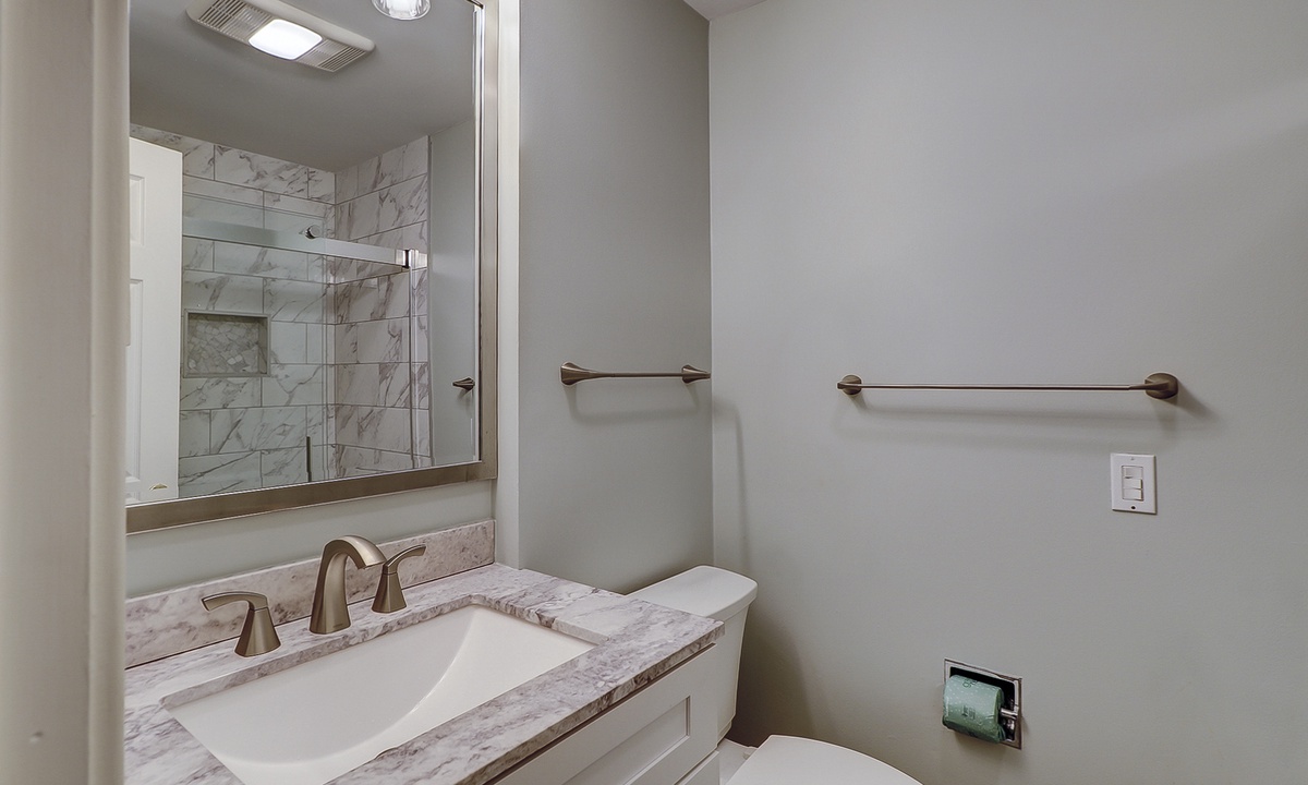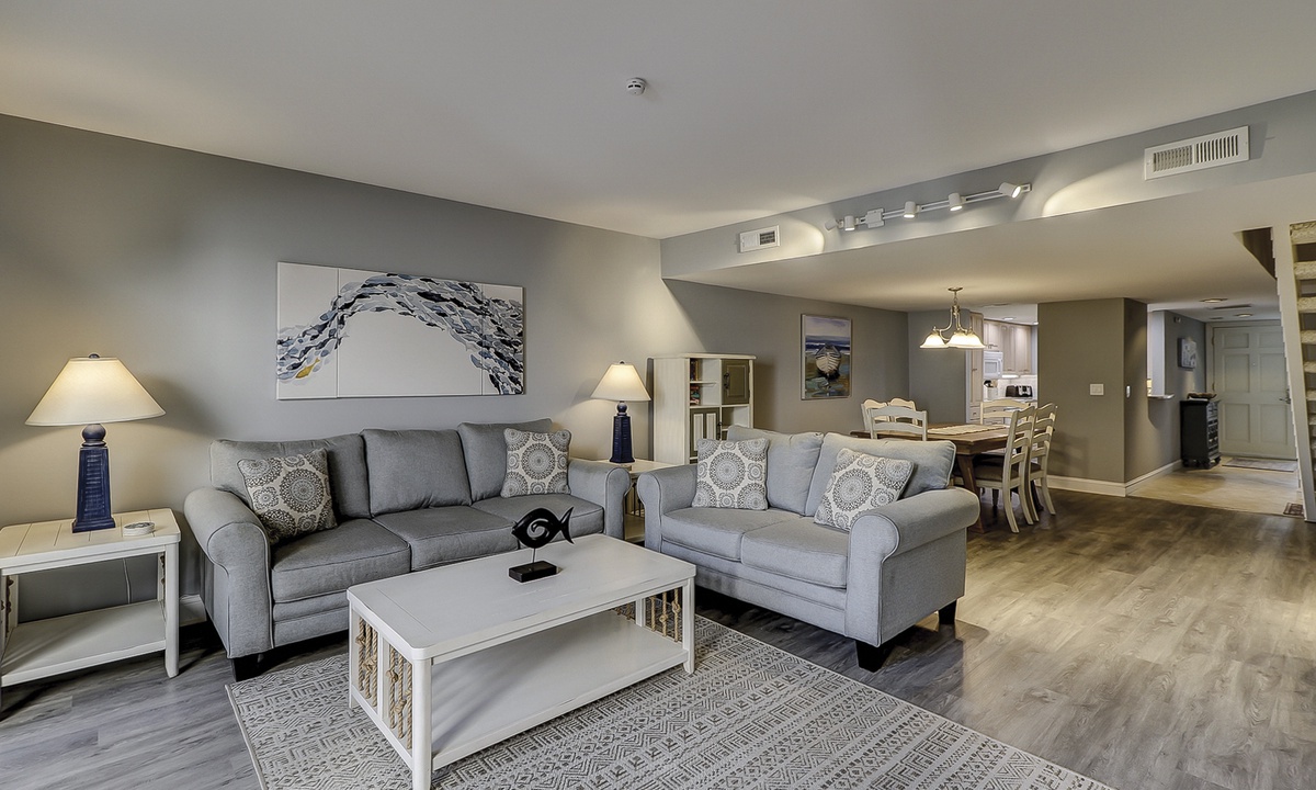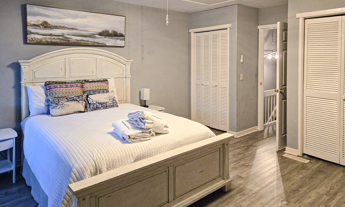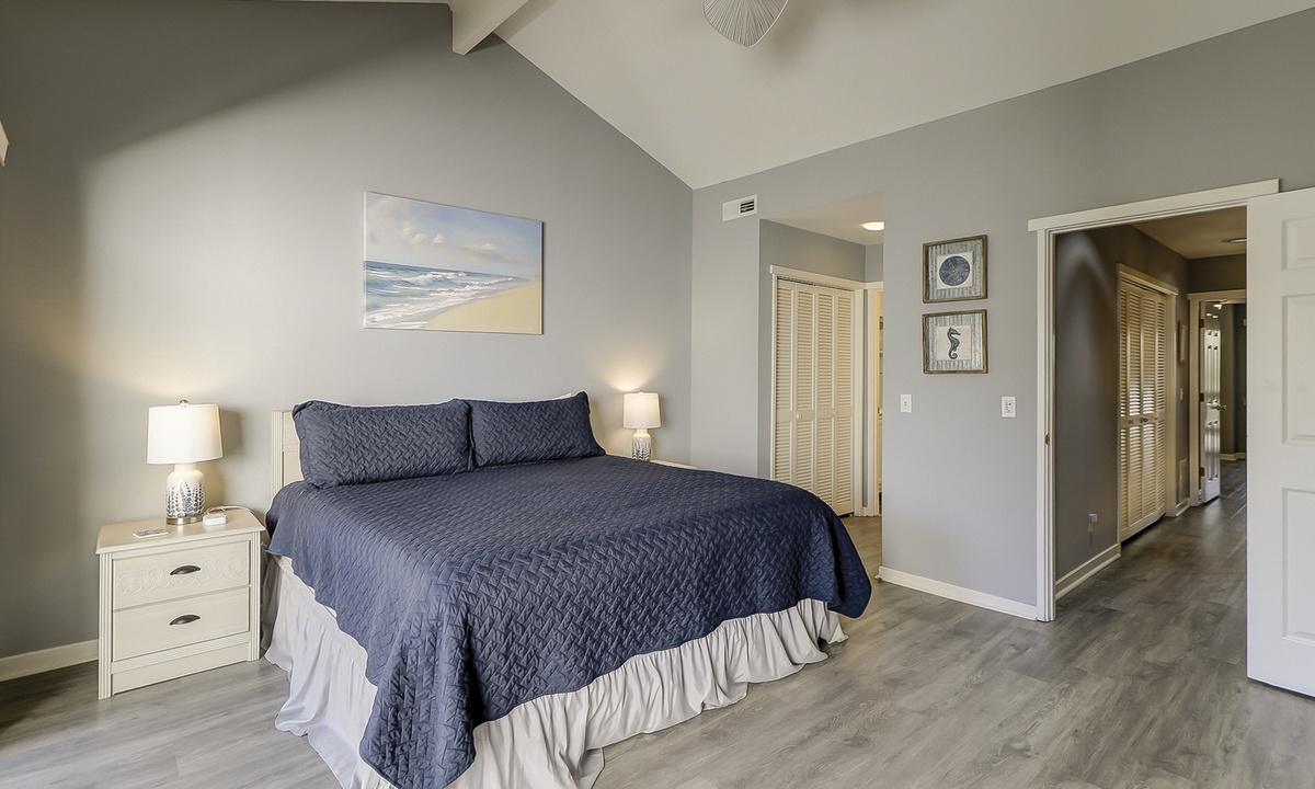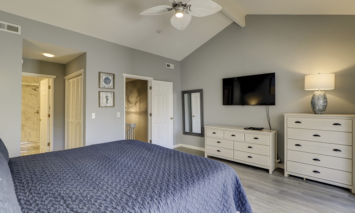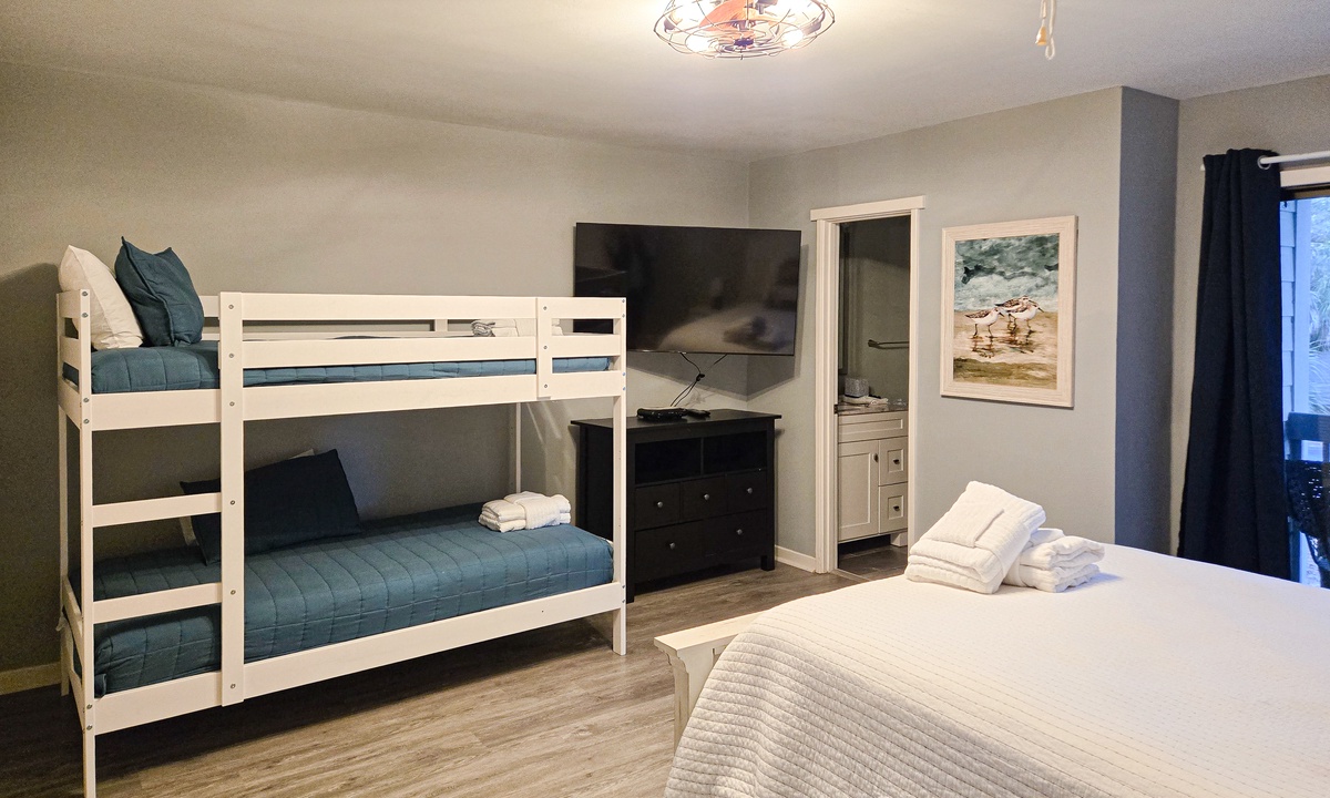 Shipmaster 1602 comfortably sleeps 6 guests in 2 bedrooms on the second floor, each with a flat screen TV, private deck and newly renovated private baths! The primary bedroom features a king bed, while the guest bedroom features a queen bed, as well as bunkbeds. Two twin rollaway beds are also available for guest use.