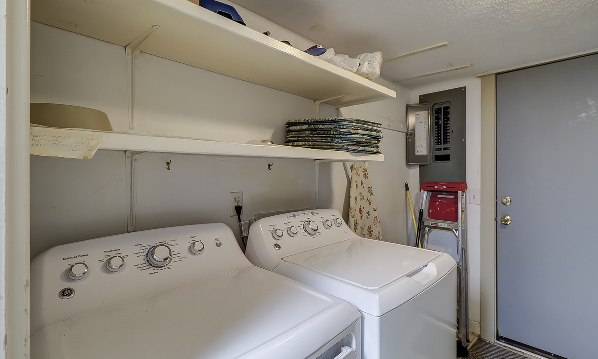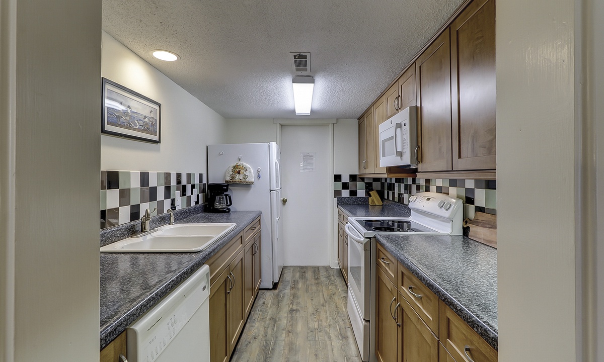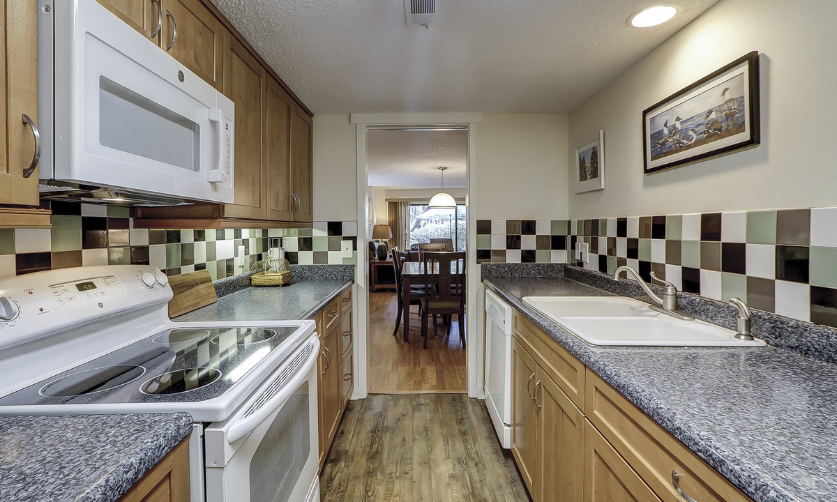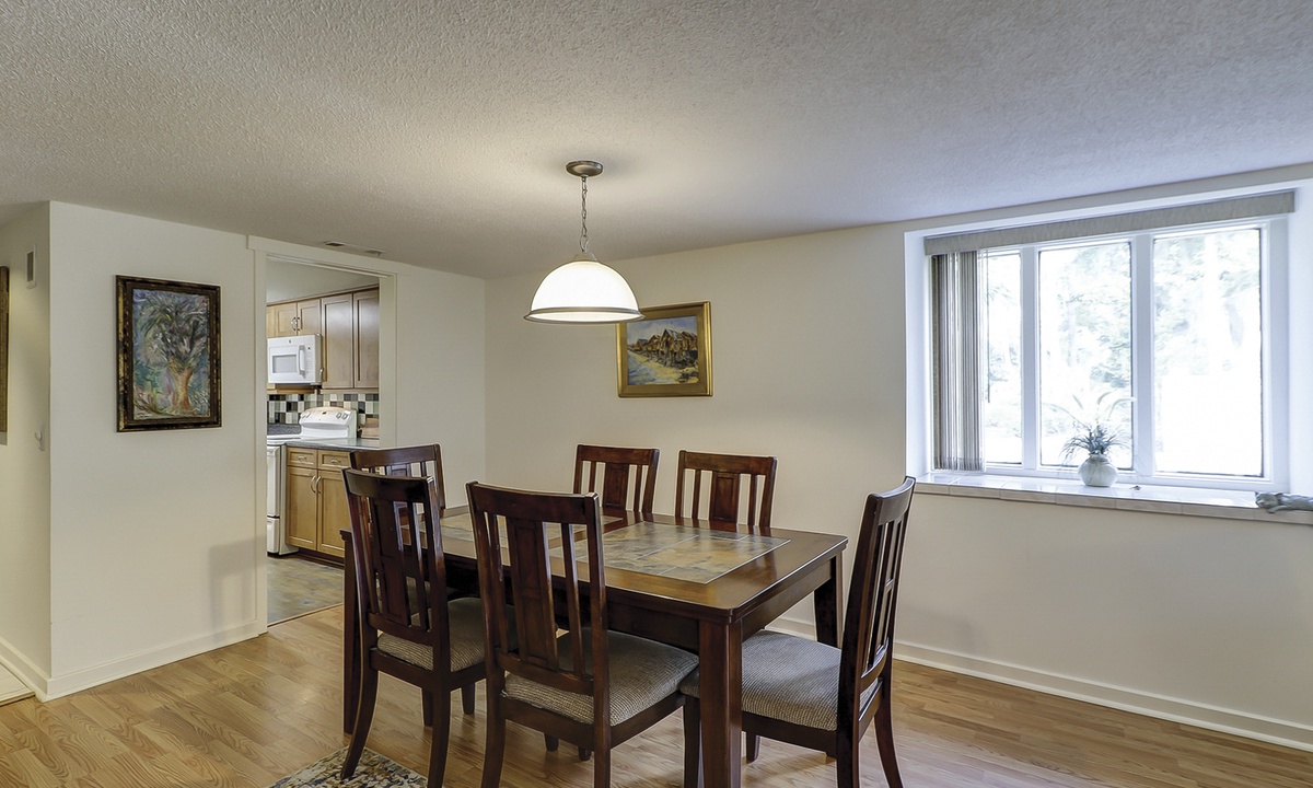 The compact, yet fully equipped, galley kitchen opens to a roomy dining area. The adjoining living room is comfortably furnished and affords slider door access to a private outside patio. Also on the main floor are a laundry room and convenient half bath.