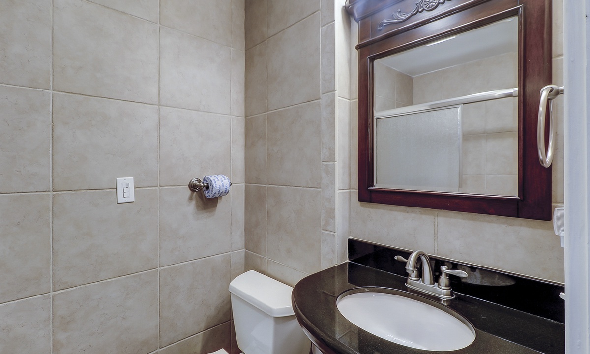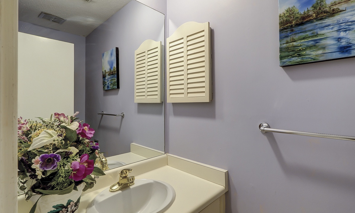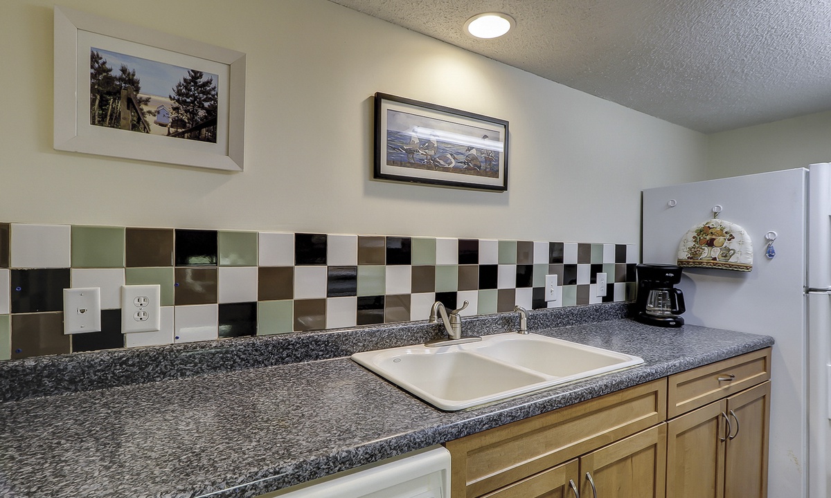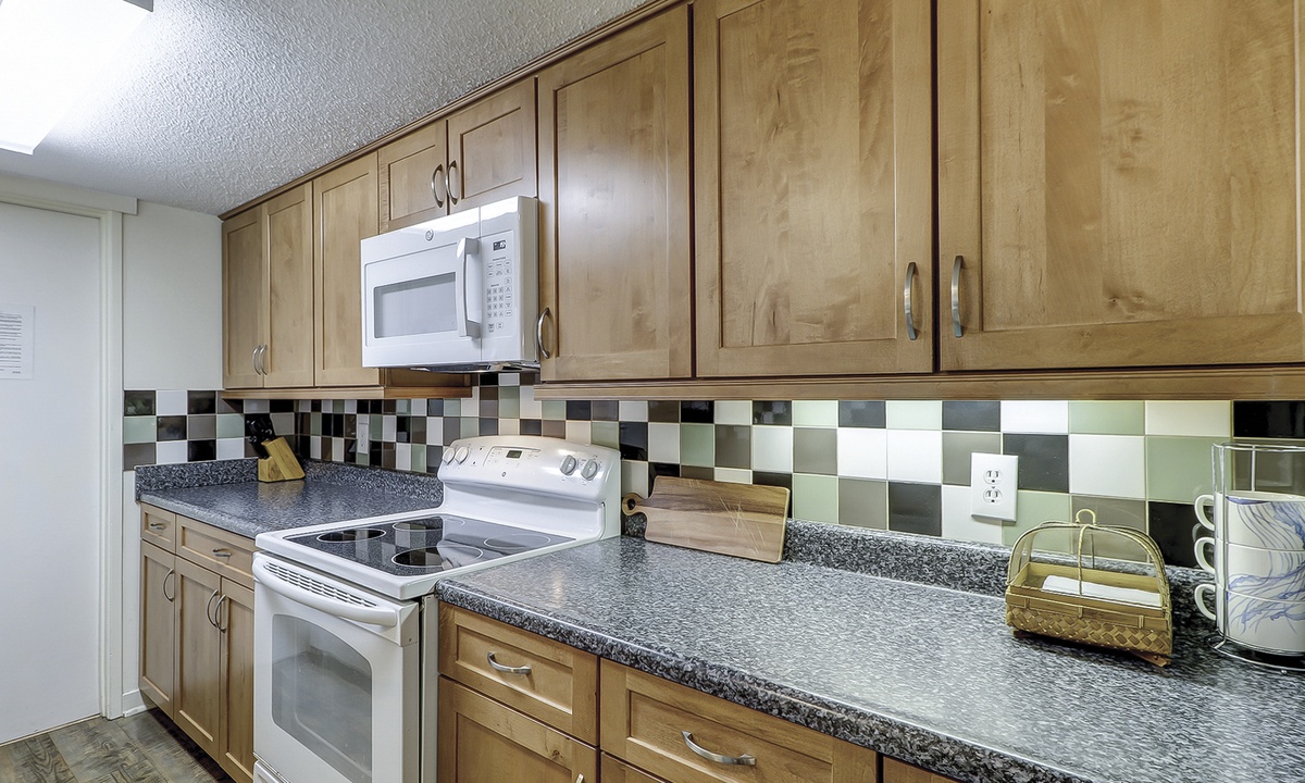 The compact, yet fully equipped, galley kitchen opens to a roomy dining area. The adjoining living room is comfortably furnished and affords slider door access to a private outside patio. Also on the main floor are a laundry room and convenient half bath.