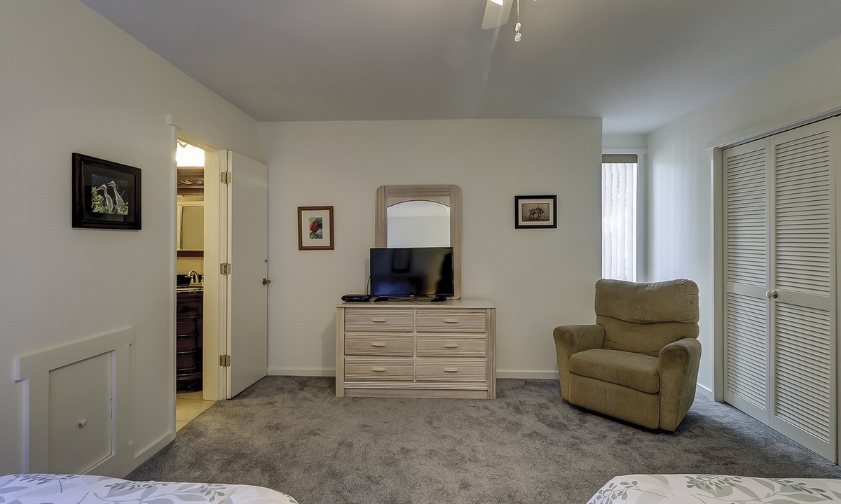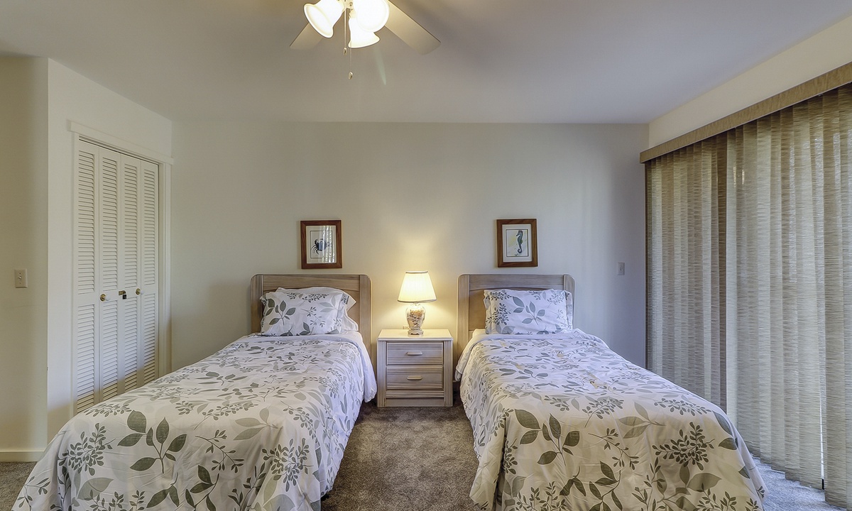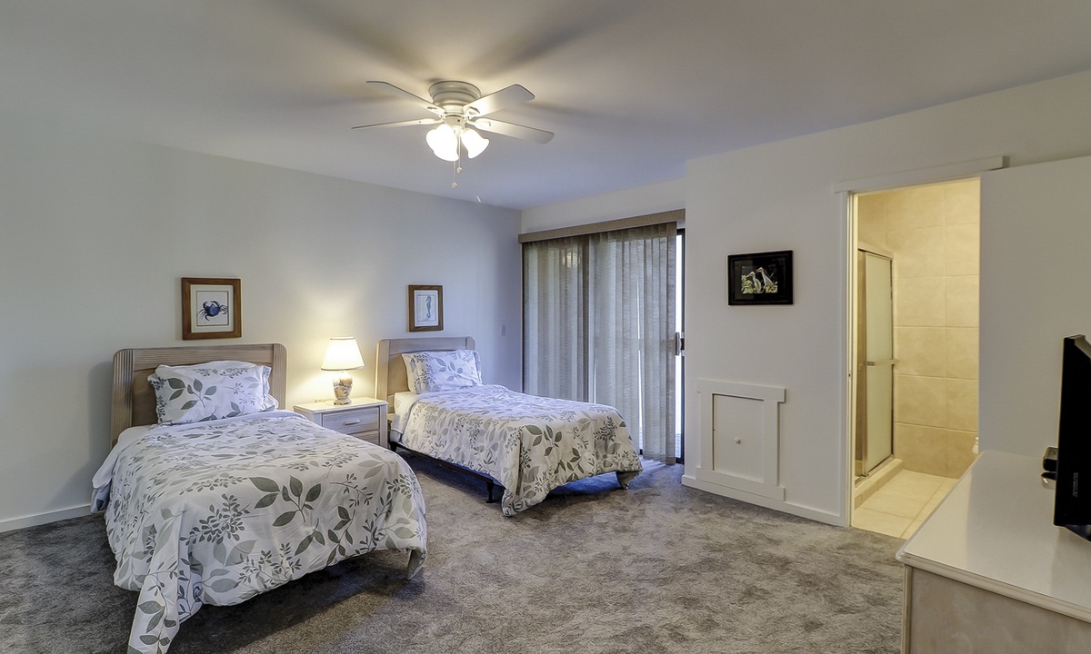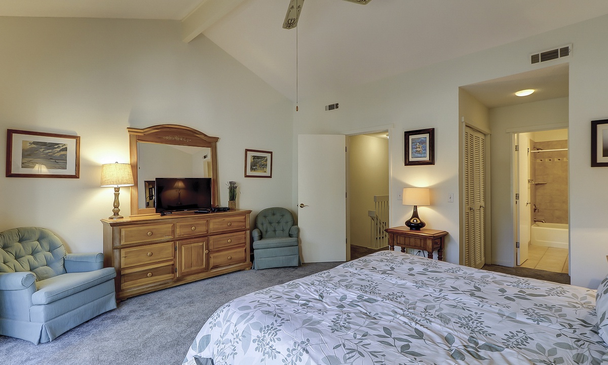 Shipmaster 1605 comfortably sleeps 6 guests in 2 bedrooms on the second floor, each with a private deck and private bath. The primary bedroom has a king-size bed, and the guest bedroom has two twin beds.