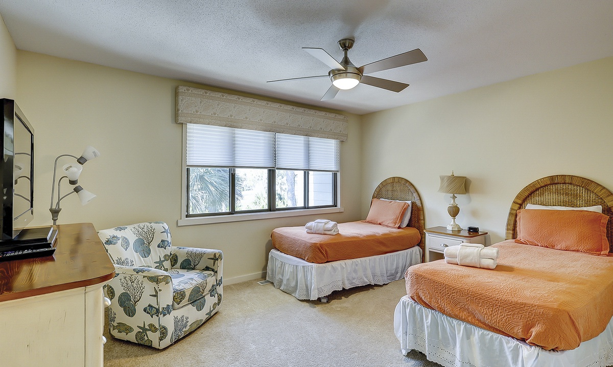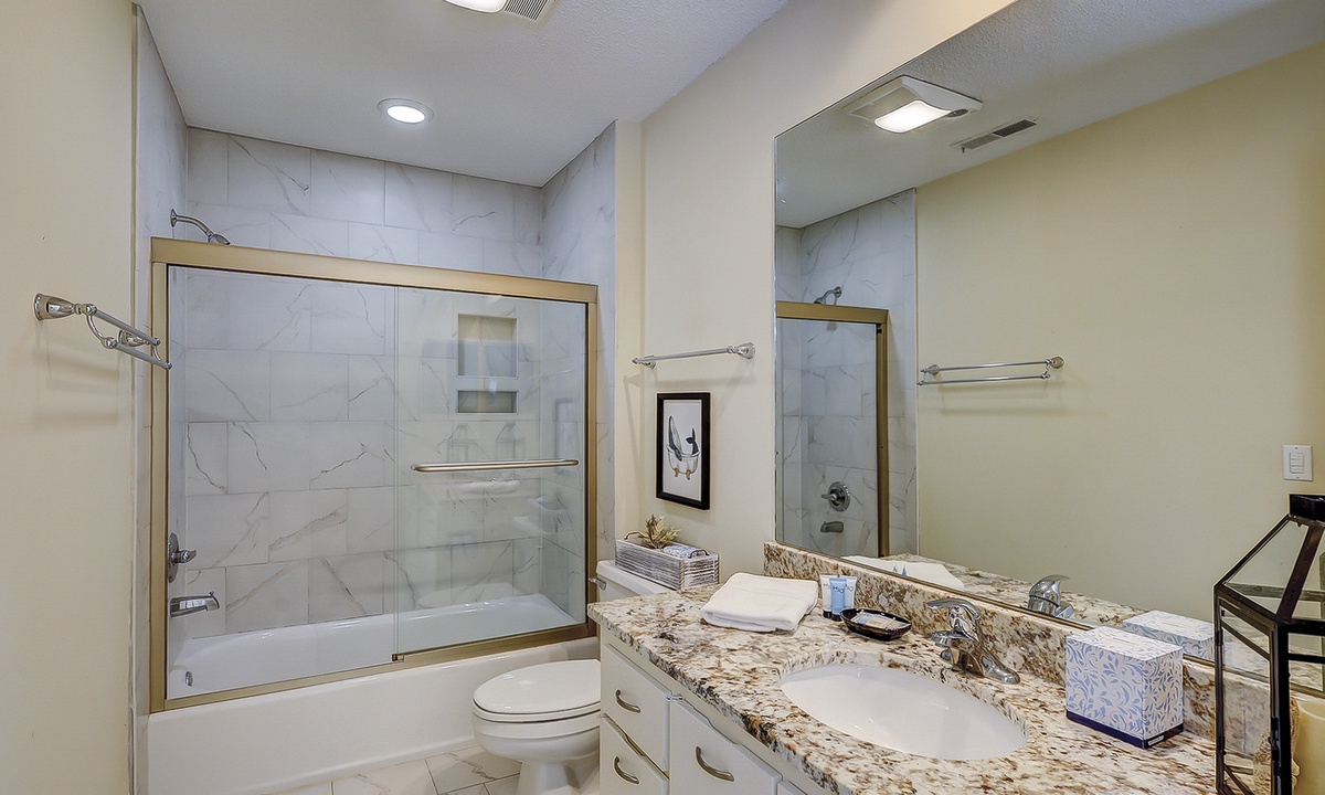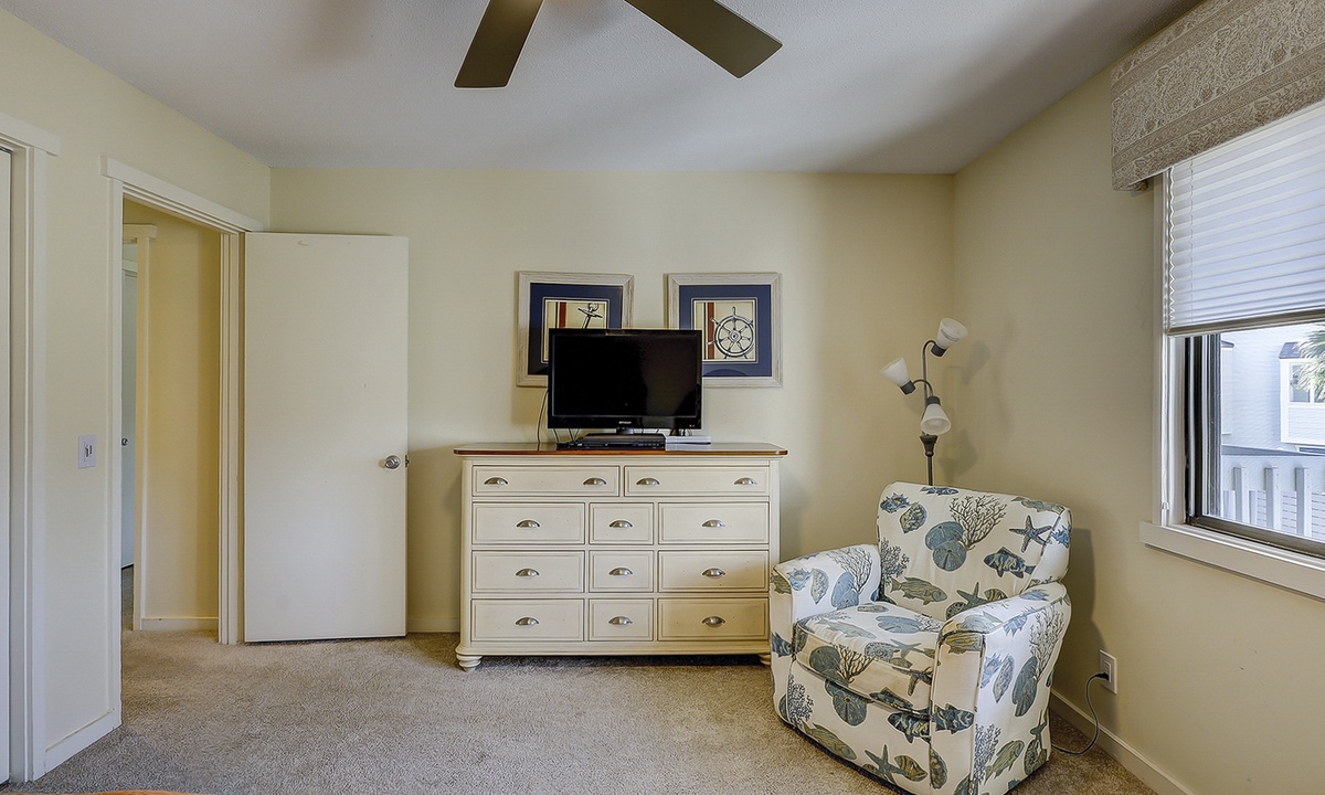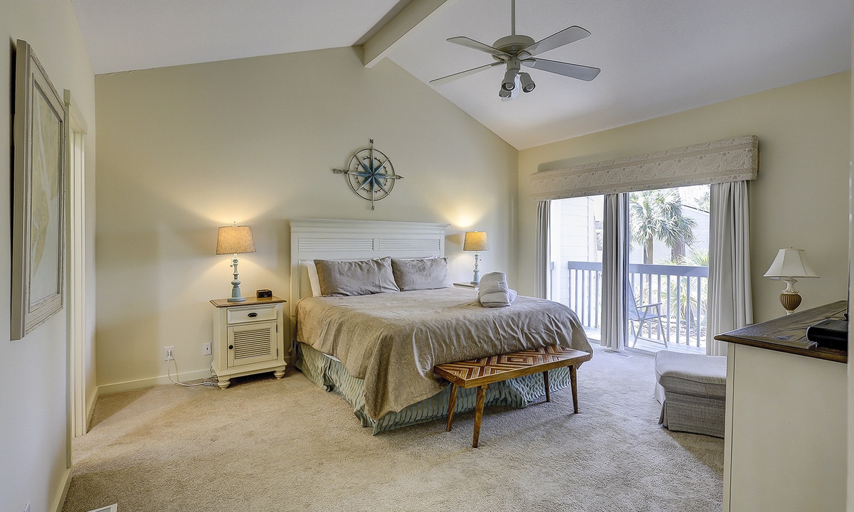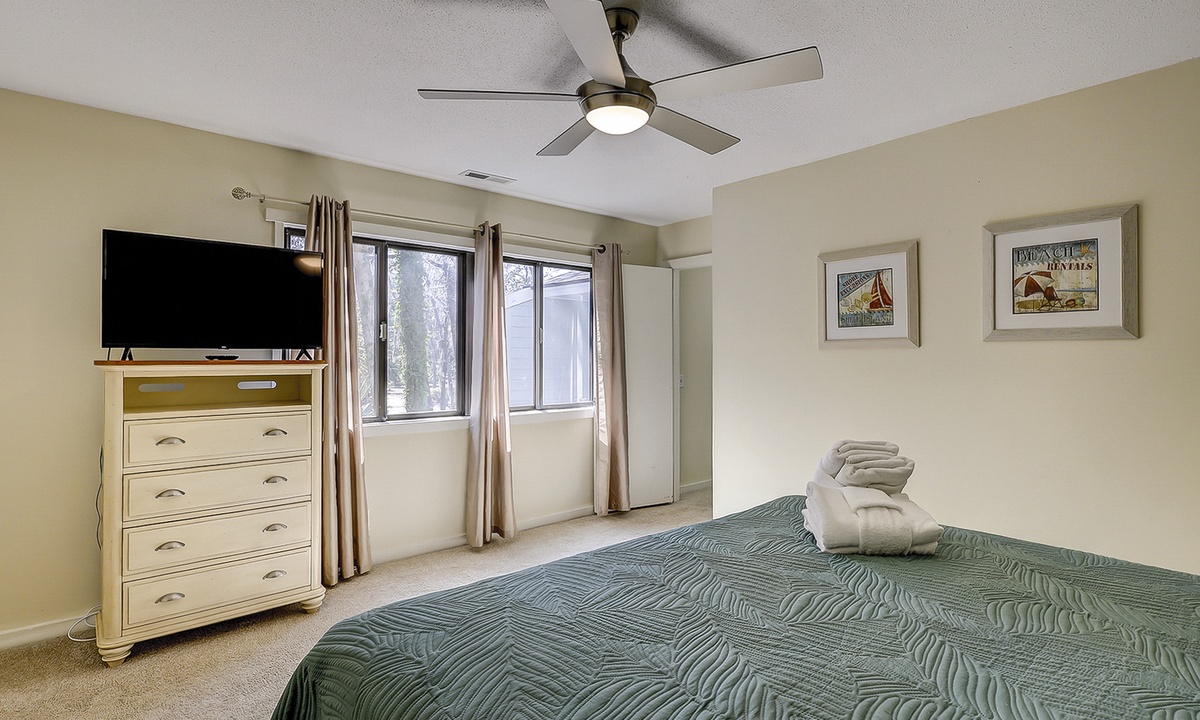 The remaining 3 bedrooms are on the 2nd level of the townhome. You'll find a king room and a twin room, both with flat screen TVs and access to a shared bathroom with a tub/shower combination. The master bedroom features a king bed with a private bathroom with a walk-in shower. This room also features a private balcony overlooking the back deck to the golf course beyond.