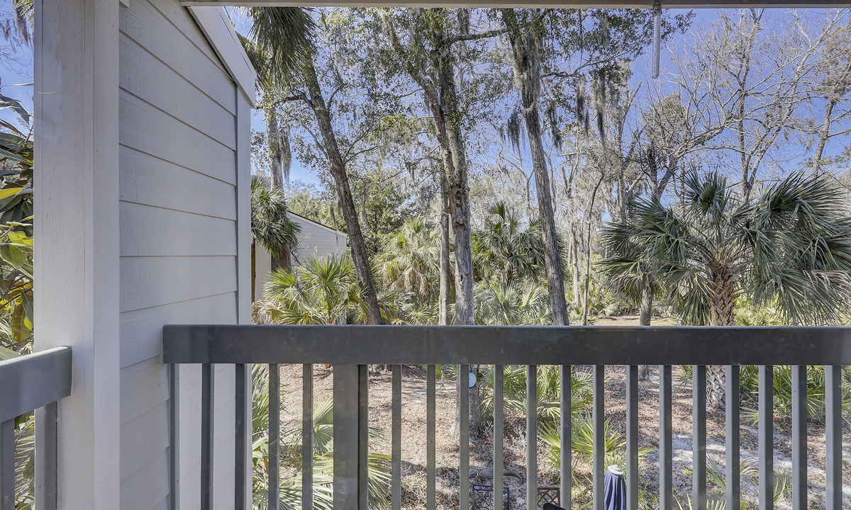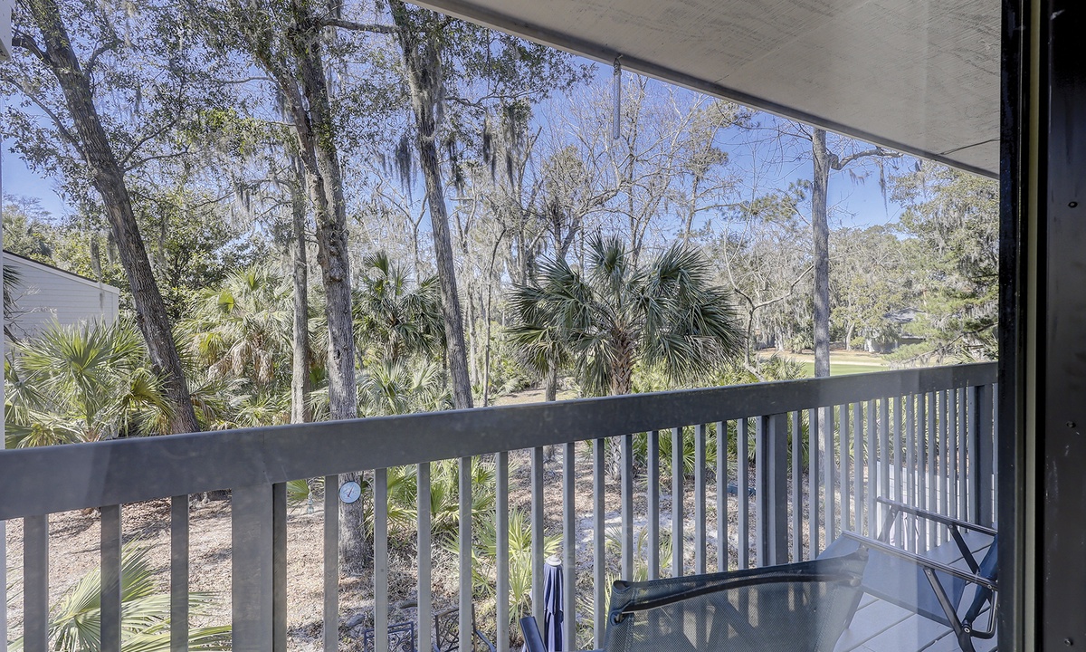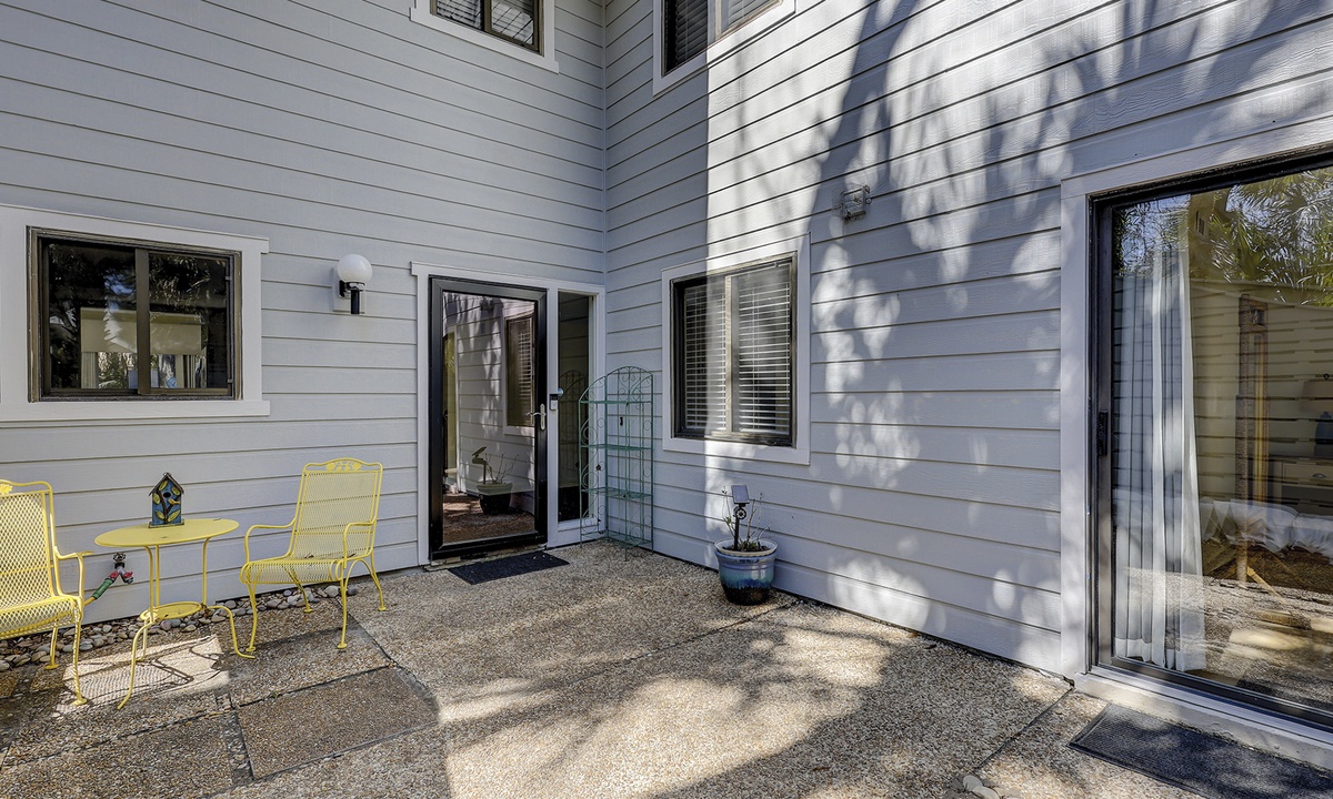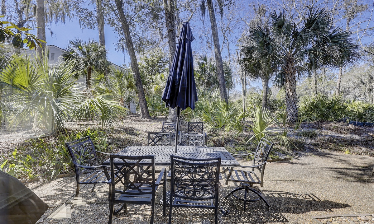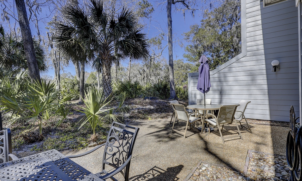 This property has plenty of outdoor space with two dining table and chair sets overlooking the Shipyard Golf Course.