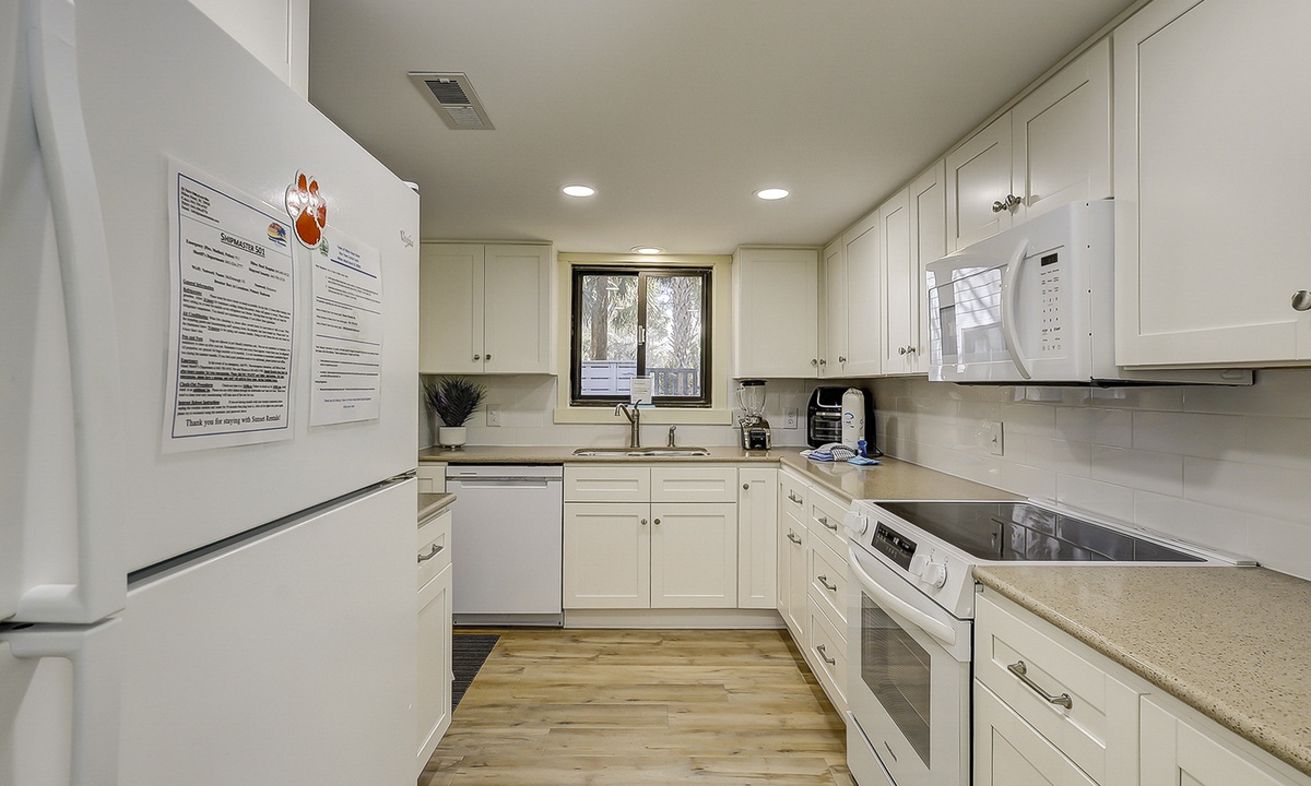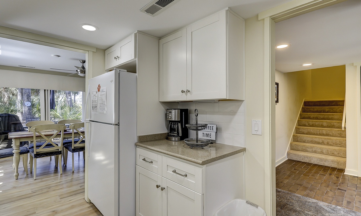 The dining area also has access to the patio area, as well as the kitchen. The kitchen features white appliances and everything you'll need to cook a meal for your guests.