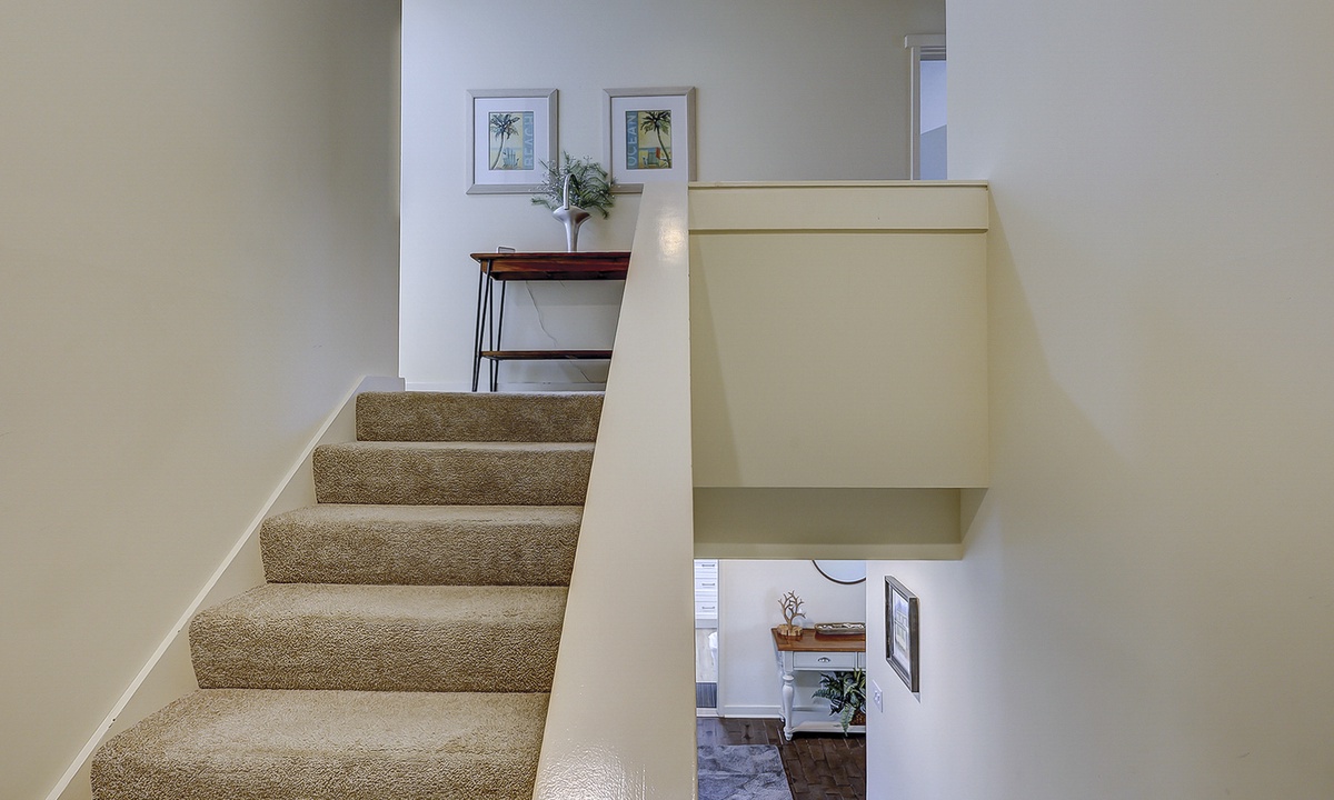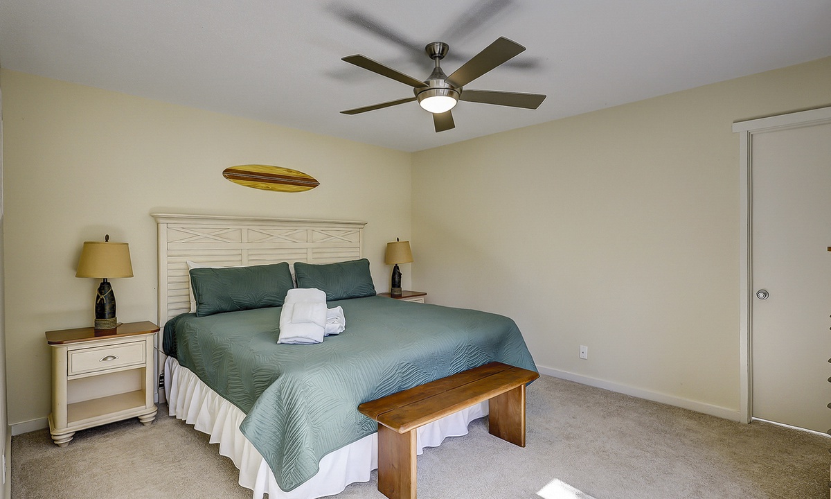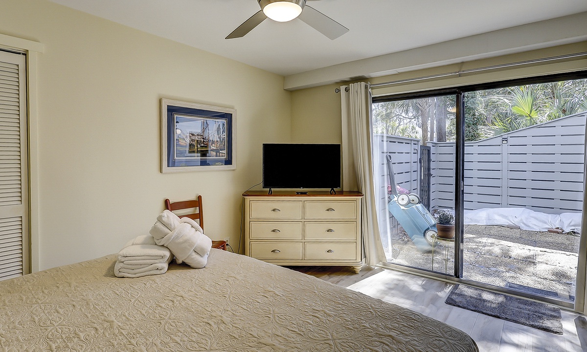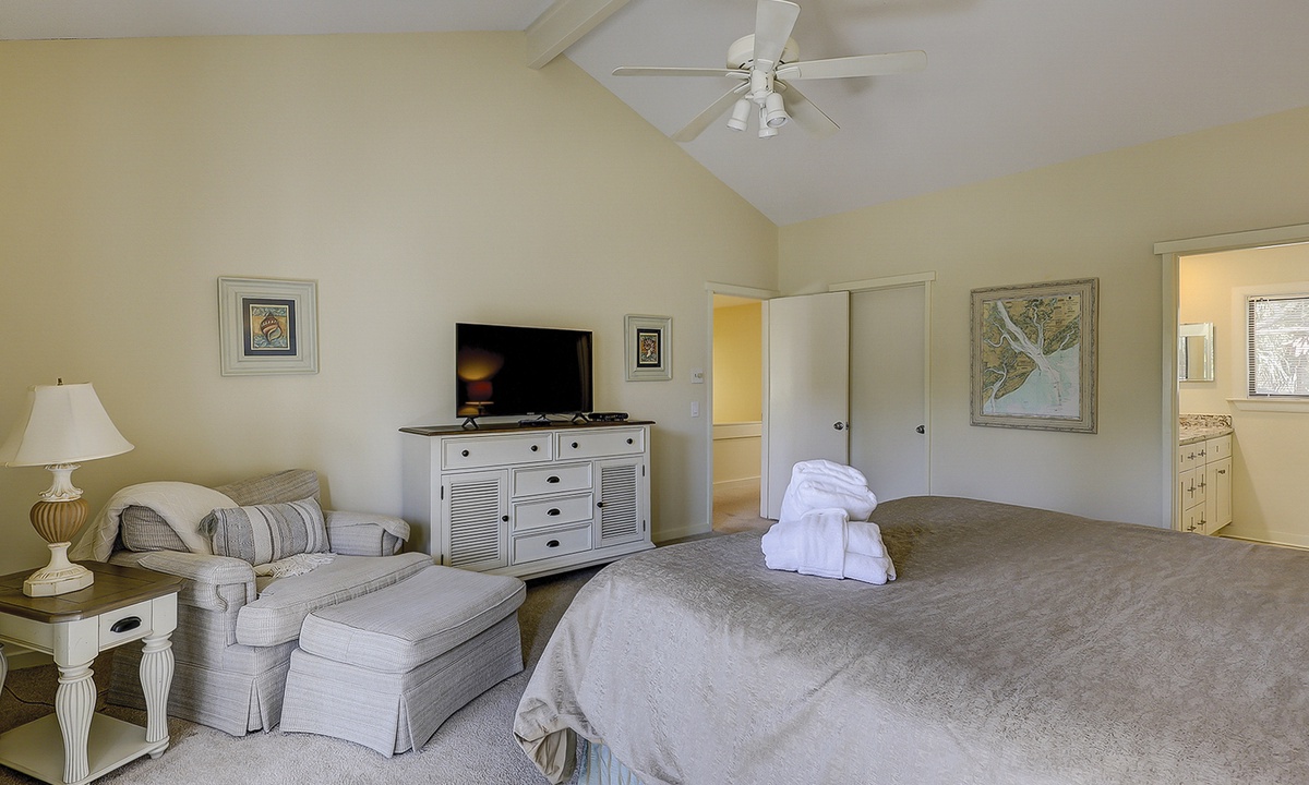 The main level of the home is stair-free and includes the living area, dining area, kitchen and a king bedroom with a private bathroom with a walk-in shower. The living area features a large flat screen TV, comfortable furnishings and access to the private patio through sliding glass doors.