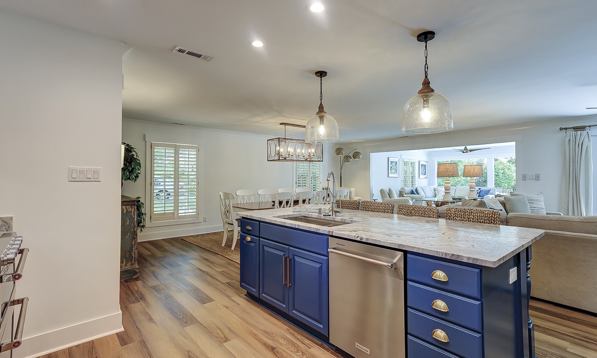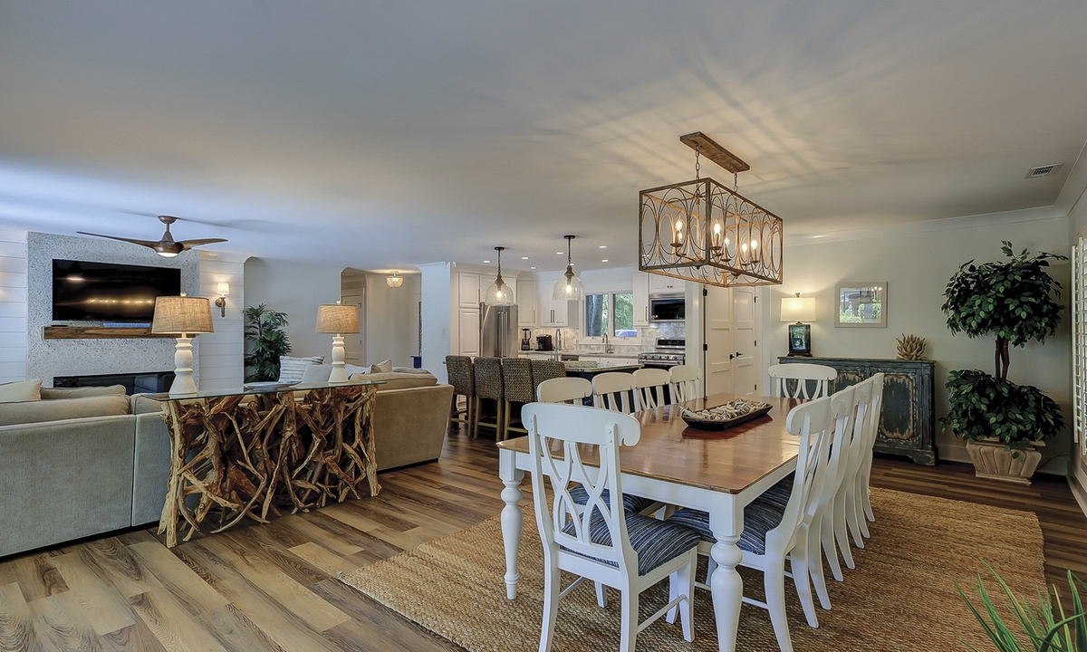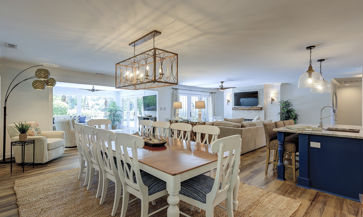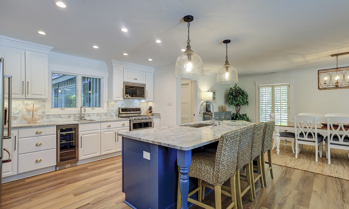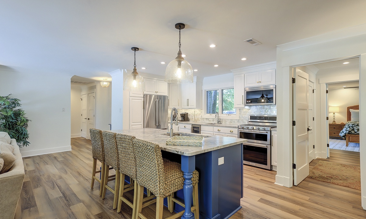 The deluxe, fully renovated kitchen offers plenty of counter space, stainless steel appliances, including a wine fridge, and everything you’ll need to cook a meal right from home. The dining area sits between the two living rooms and offers seating for 10 with additional seating for 4 at the kitchen bar.