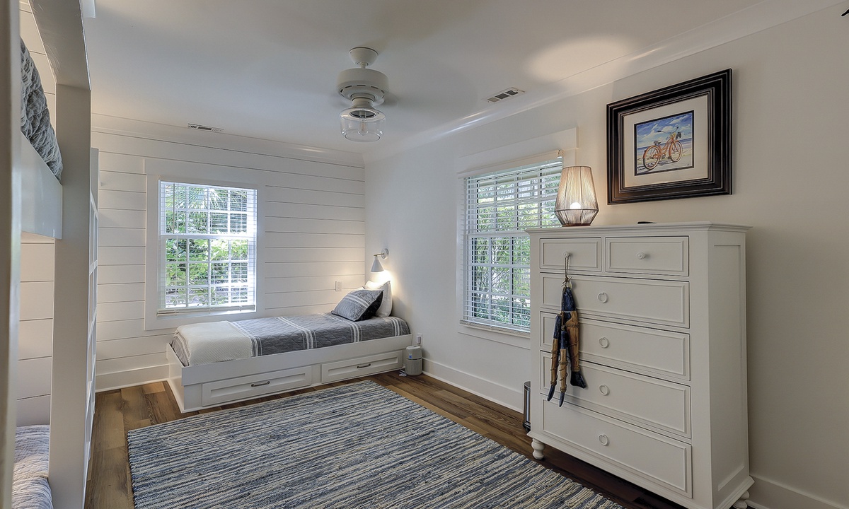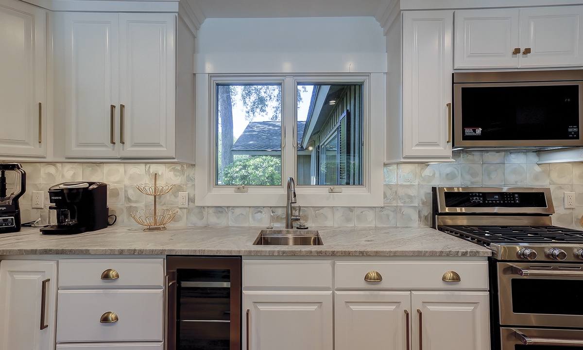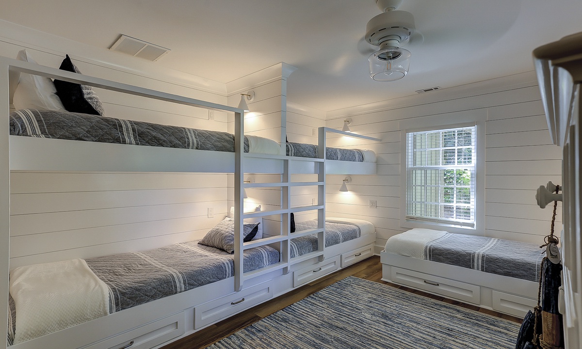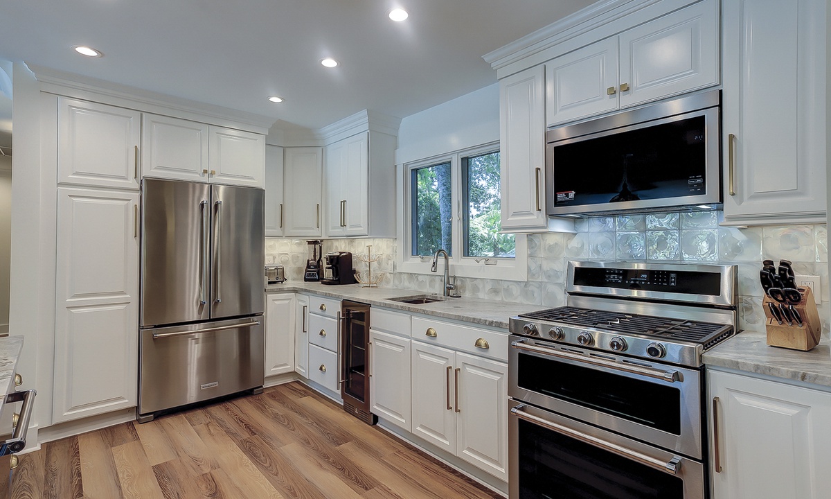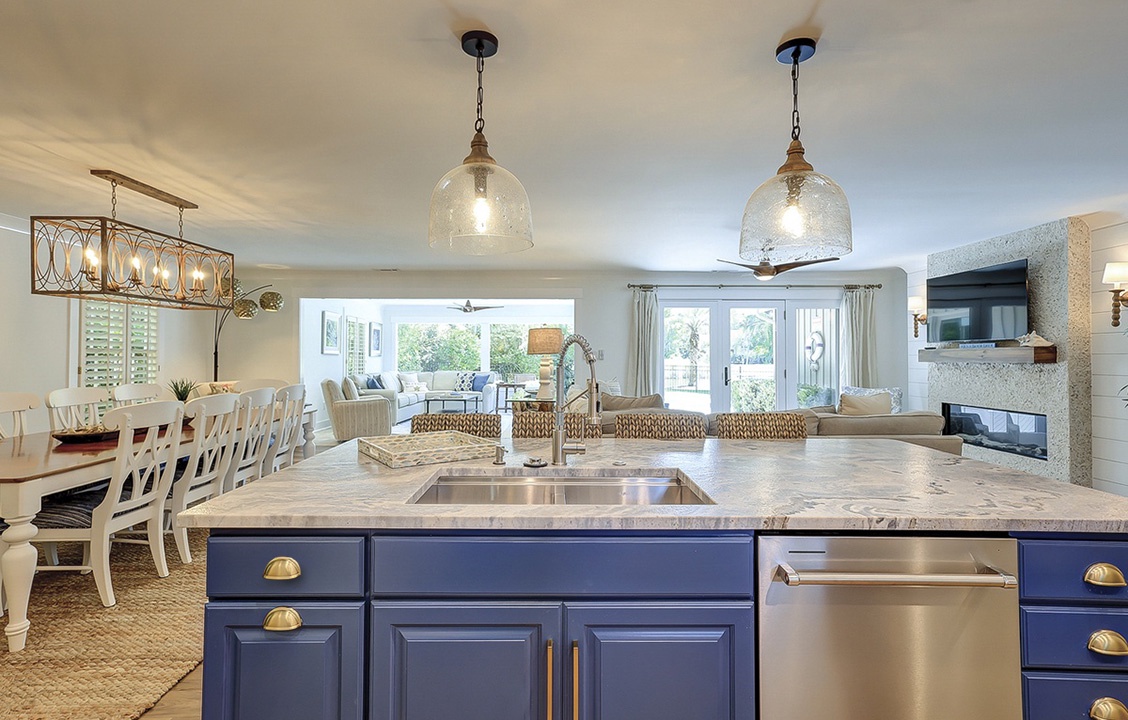 The deluxe, fully renovated kitchen offers plenty of counter space, stainless steel appliances, including a wine fridge, and everything you’ll need to cook a meal right from home. The dining area sits between the two living rooms and offers seating for 10 with additional seating for 4 at the kitchen bar.