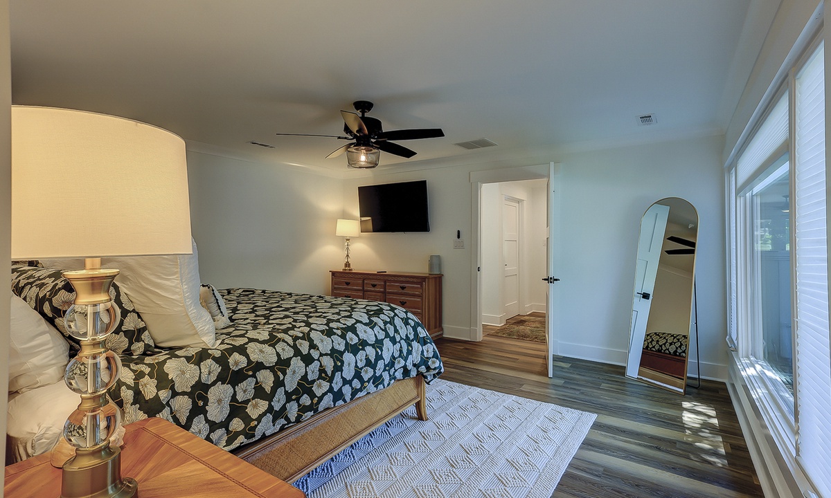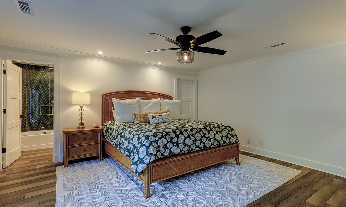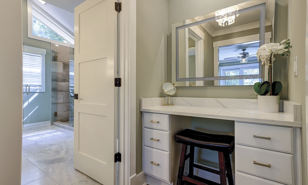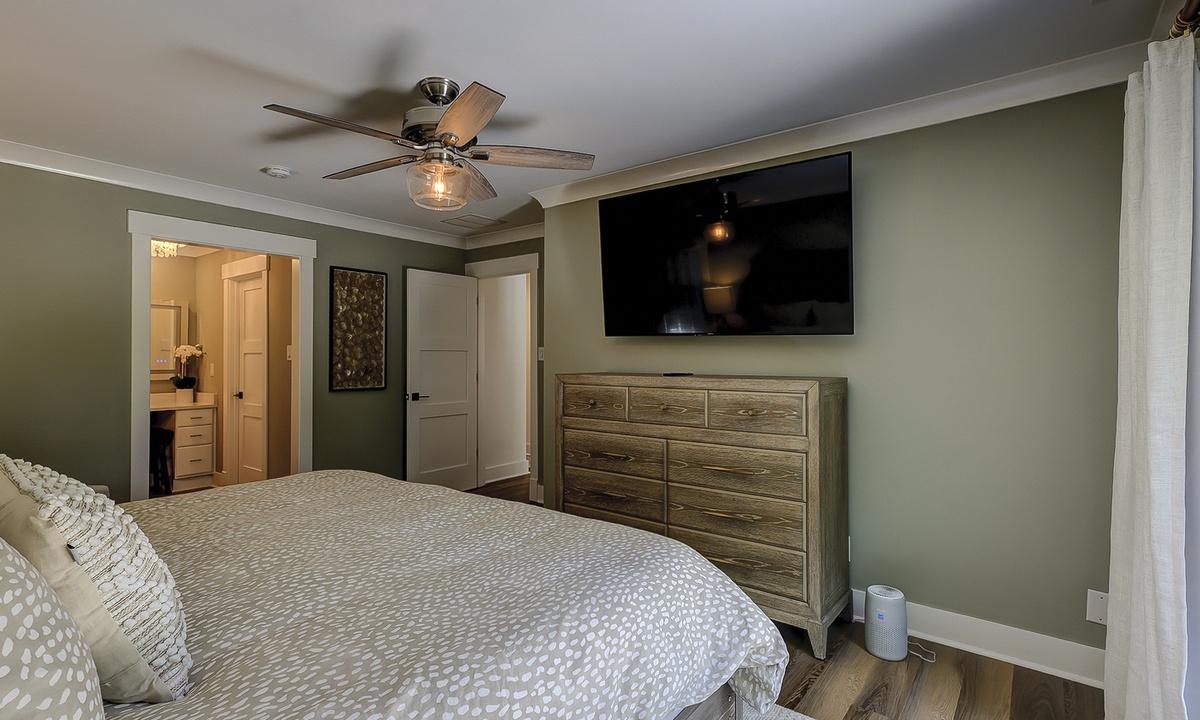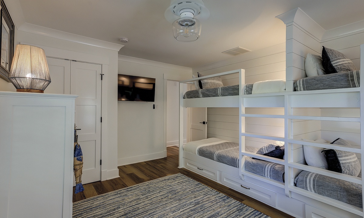 Just off the dining area, you’ll find the first of two primary suites featuring a king bed, flat screen TV and a newly renovated private bathroom. The bathroom features a custom tiled walk-in shower, an expansive vanity with plenty of counter space to get ready, tons of under sink storage, as well as a separate vanity area with an LED make up mirror and sitting stool. The remaining 3 bedrooms are on the opposite side of the home. The first bedroom features two sets of built-in bunk beds, as well as an additional twin bed. This room has access to a hall bathroom with a tiled walk-in shower. The next room features a queen bed with a private bathroom featuring a tiled walk-in shower. The second primary suite features a king bed, flat screen TV and sliding doors that lead out to the pool deck. The stunning master bathroom features a separate vanity outside of the bathroom, as well as a large dual vanity inside and a tiled walk-in shower.