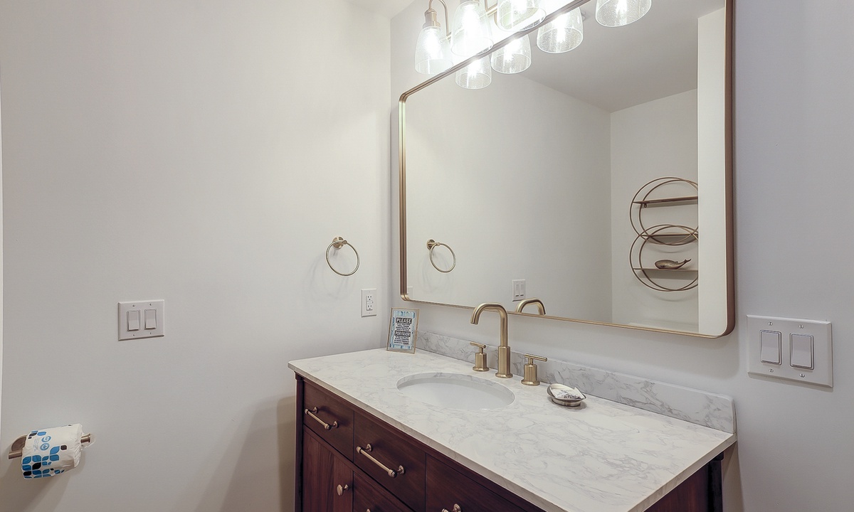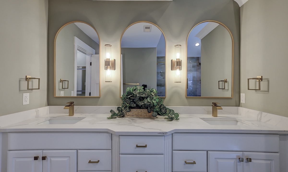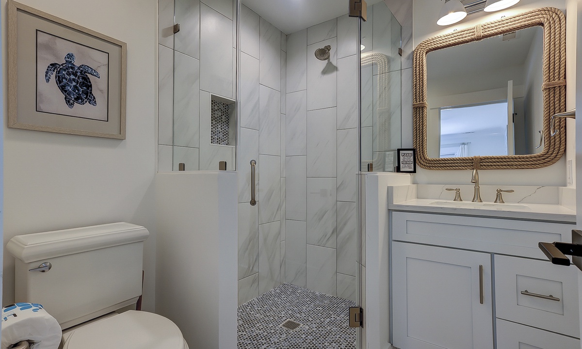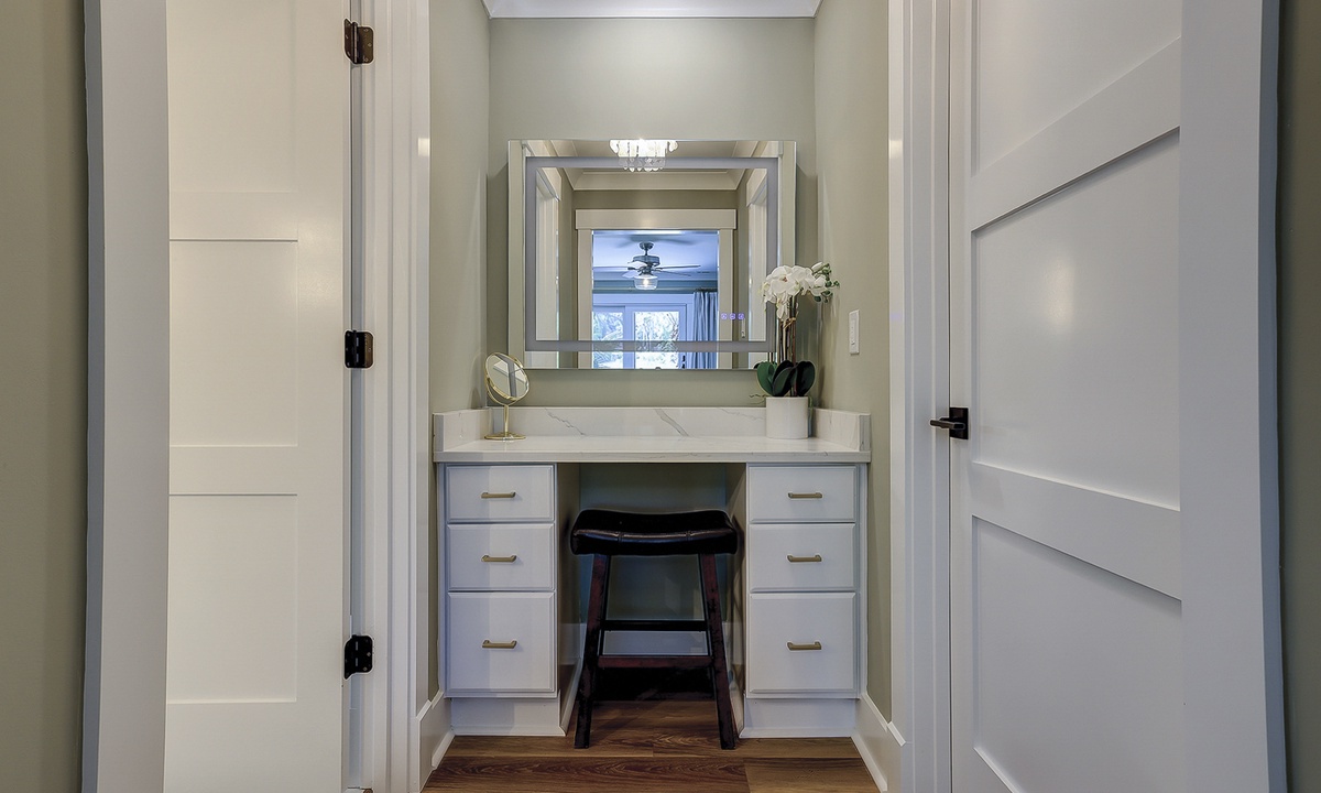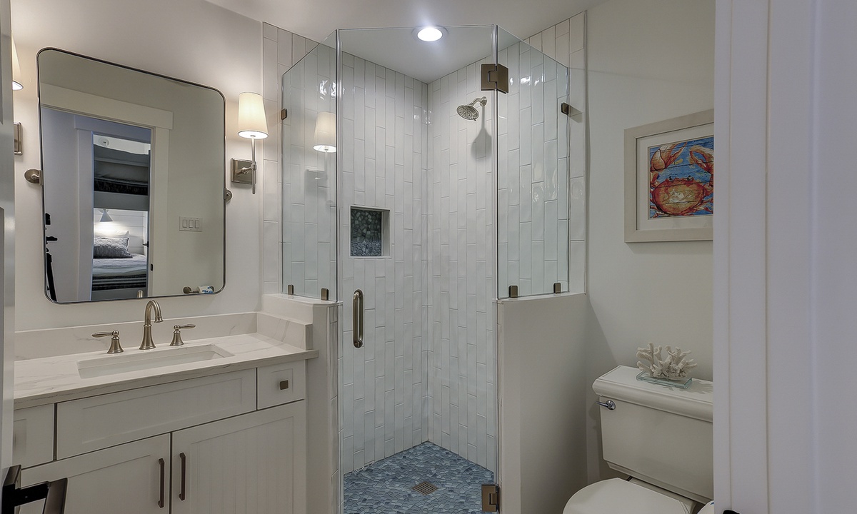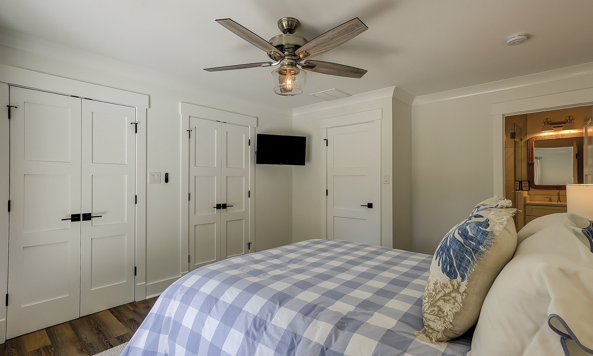 Just off the dining area, you’ll find the first of two primary suites featuring a king bed, flat screen TV and a newly renovated private bathroom. The bathroom features a custom tiled walk-in shower, an expansive vanity with plenty of counter space to get ready, tons of under sink storage, as well as a separate vanity area with an LED make up mirror and sitting stool. The remaining 3 bedrooms are on the opposite side of the home. The first bedroom features two sets of built-in bunk beds, as well as an additional twin bed. This room has access to a hall bathroom with a tiled walk-in shower. The next room features a queen bed with a private bathroom featuring a tiled walk-in shower. The second primary suite features a king bed, flat screen TV and sliding doors that lead out to the pool deck. The stunning master bathroom features a separate vanity outside of the bathroom, as well as a large dual vanity inside and a tiled walk-in shower.