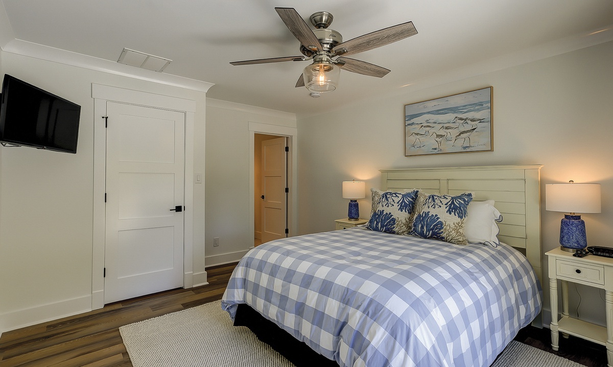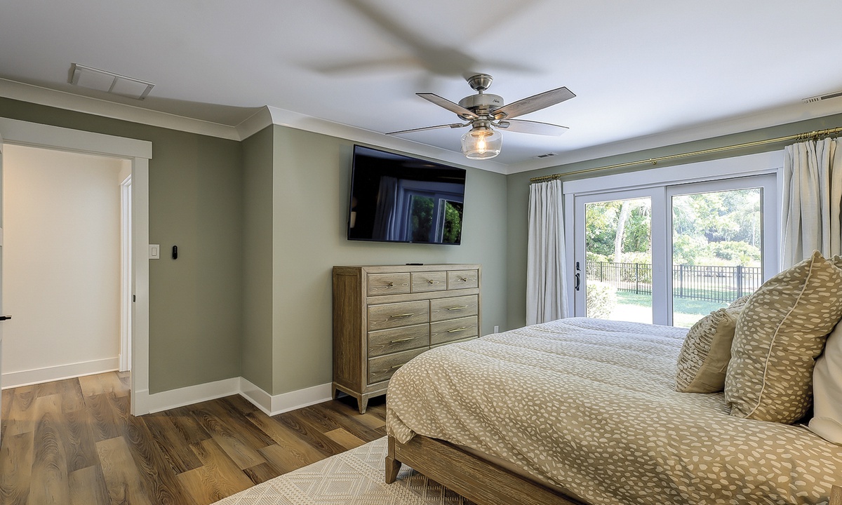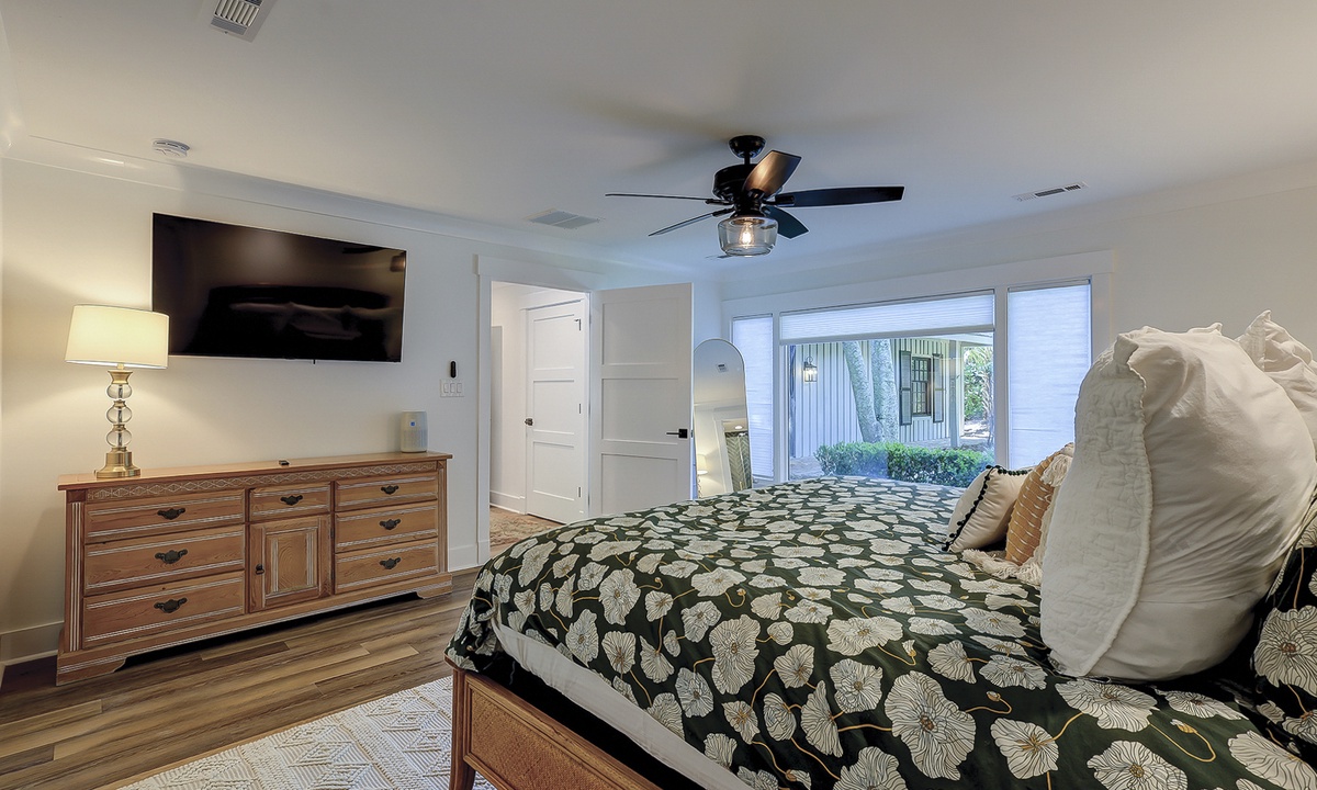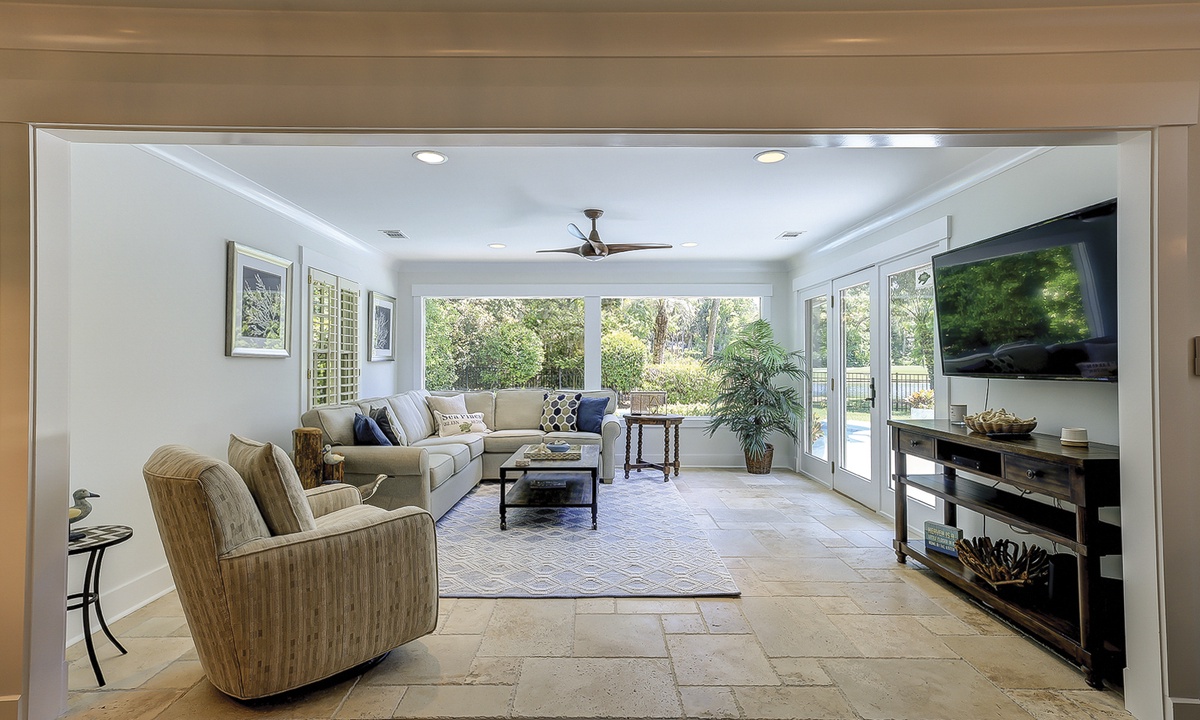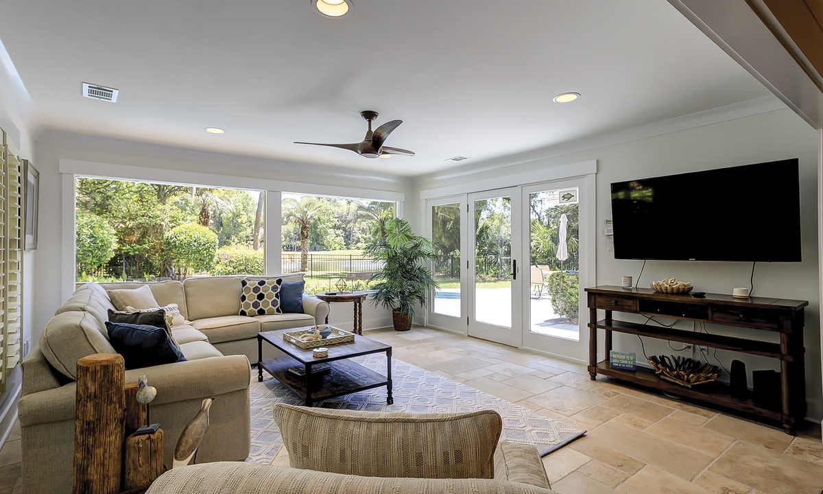 As you walk in the front door, you’ll find the first living area straight ahead. The second living space, the Carolina room, is just beyond. Both living areas feature comfortable furnishings, flat screen TVs and access to the private pool deck with fantastic views of the Atlantic Dunes golf course. The main living area offers cable viewing to watch your favorite TV shows, while all other TVs offer streaming capabilities.