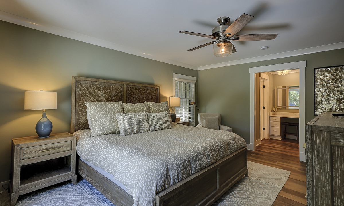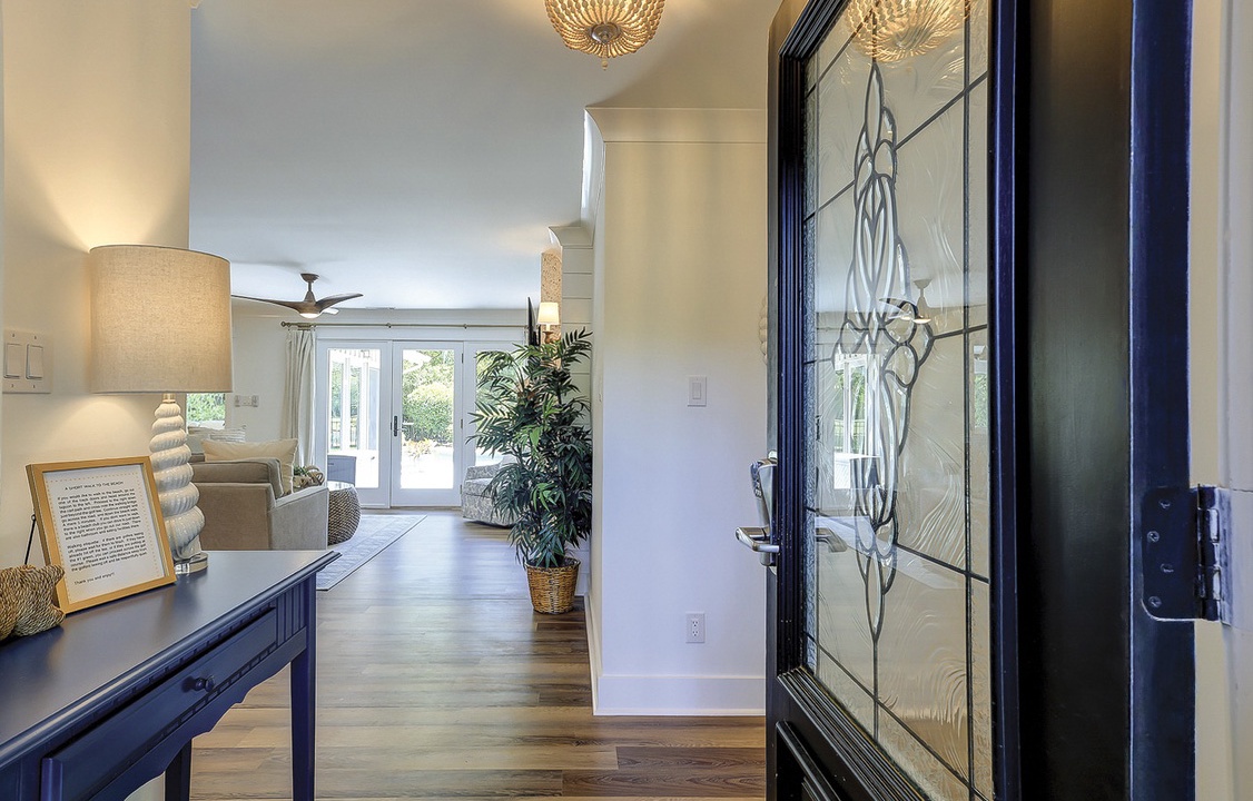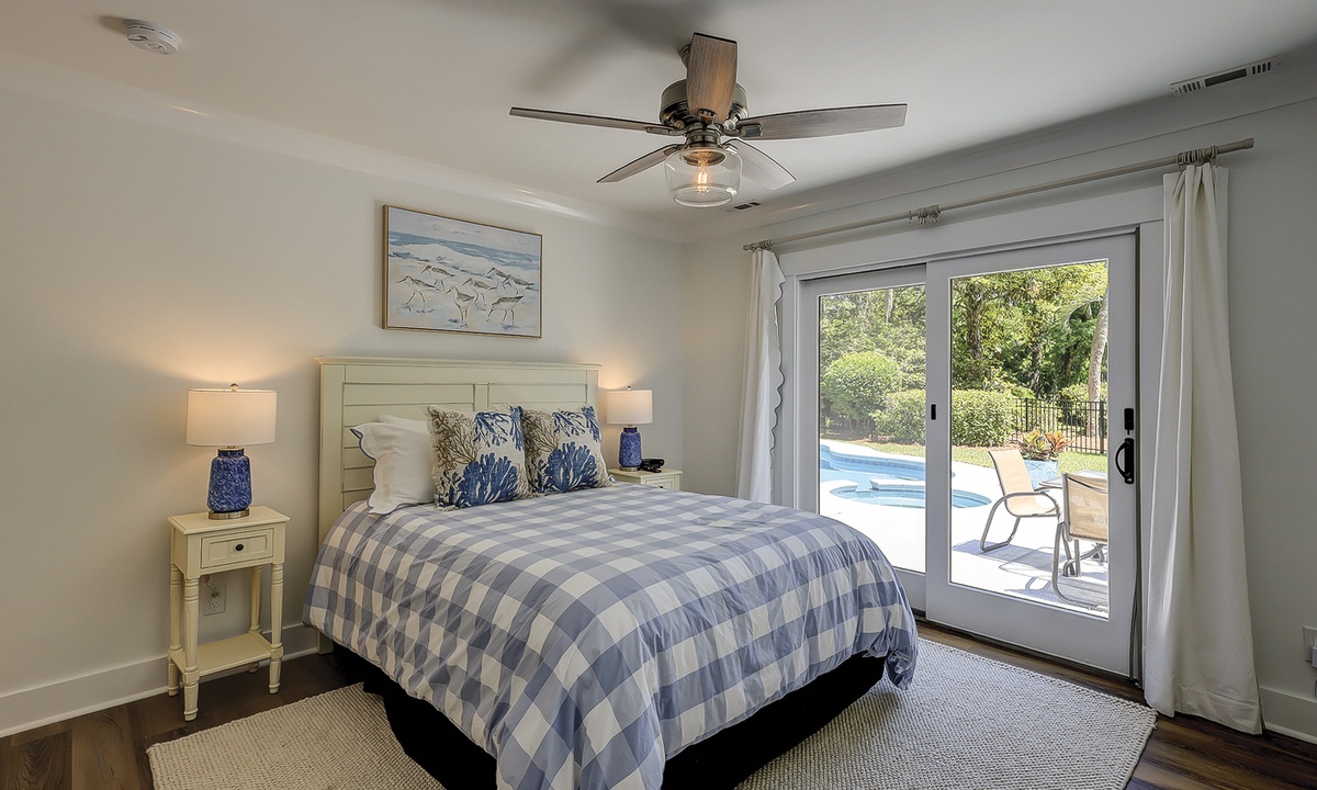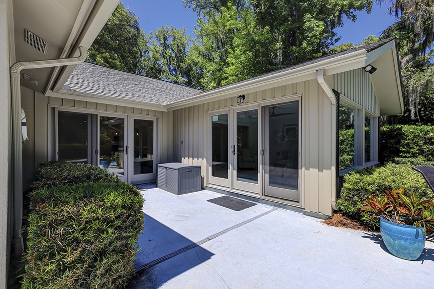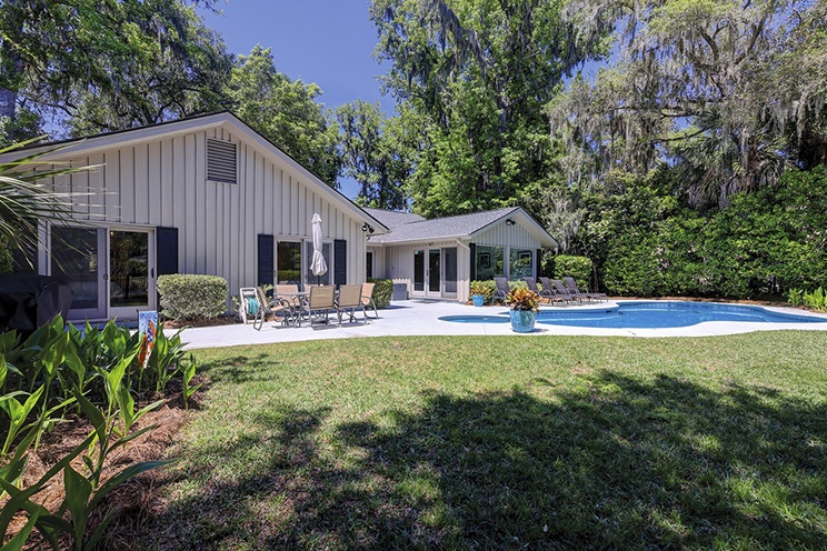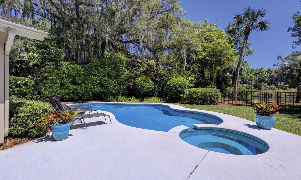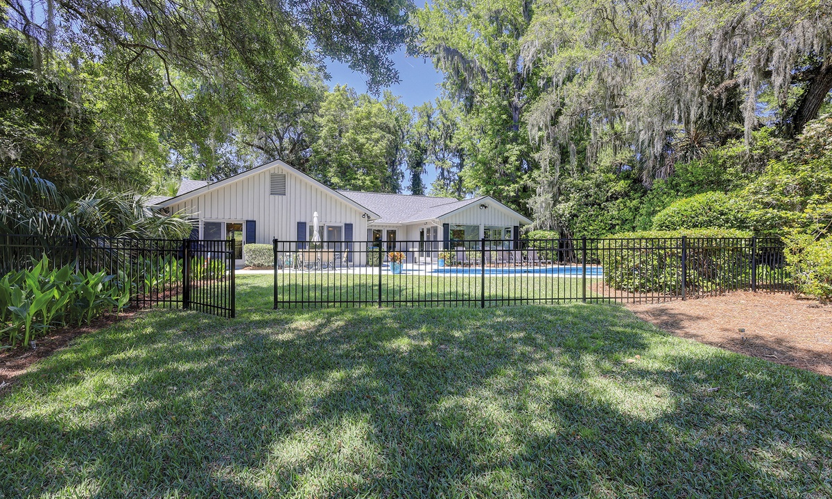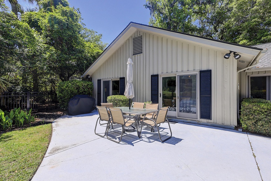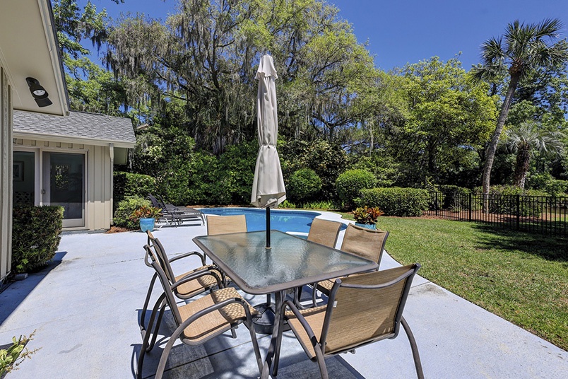 This Hilton Head Sea Pines home has a remarkable outdoor space with a large private pool, an attached spa, lounge seating, an outdoor dining table, and a gas grill all fenced in for a true private oasis. You’ll find the beach is just a short, 5-7 minute walk away!