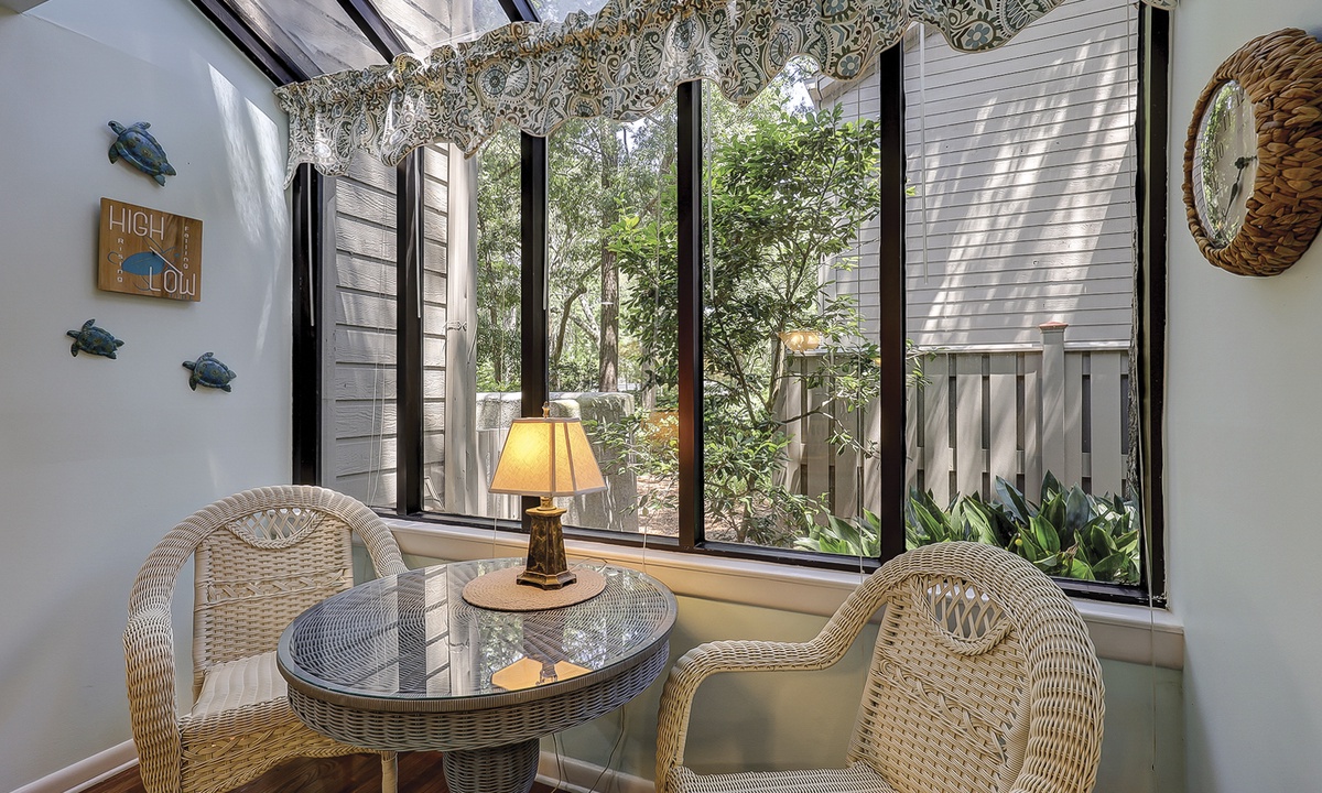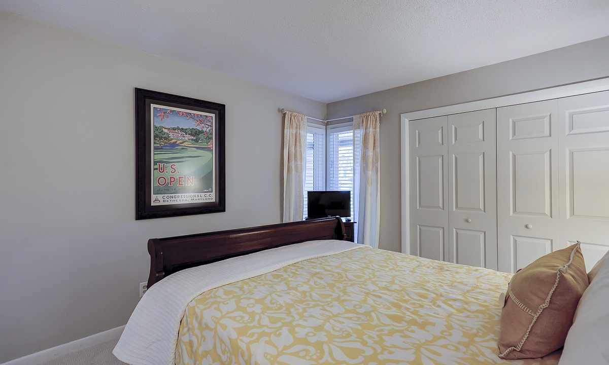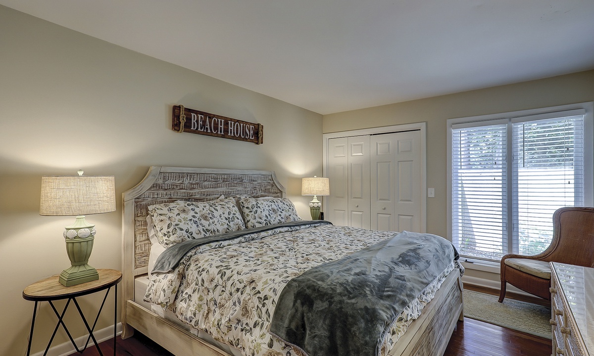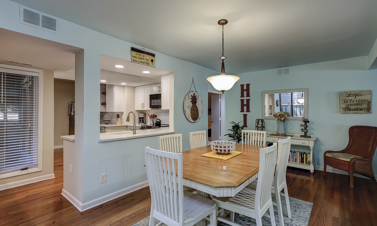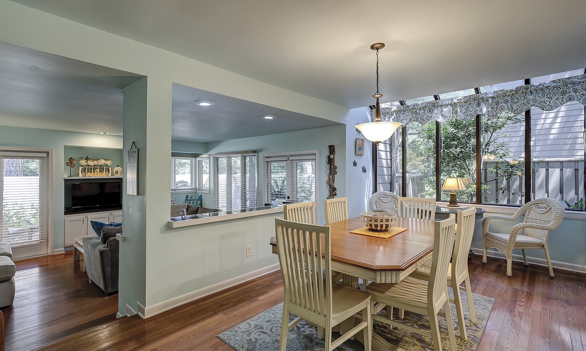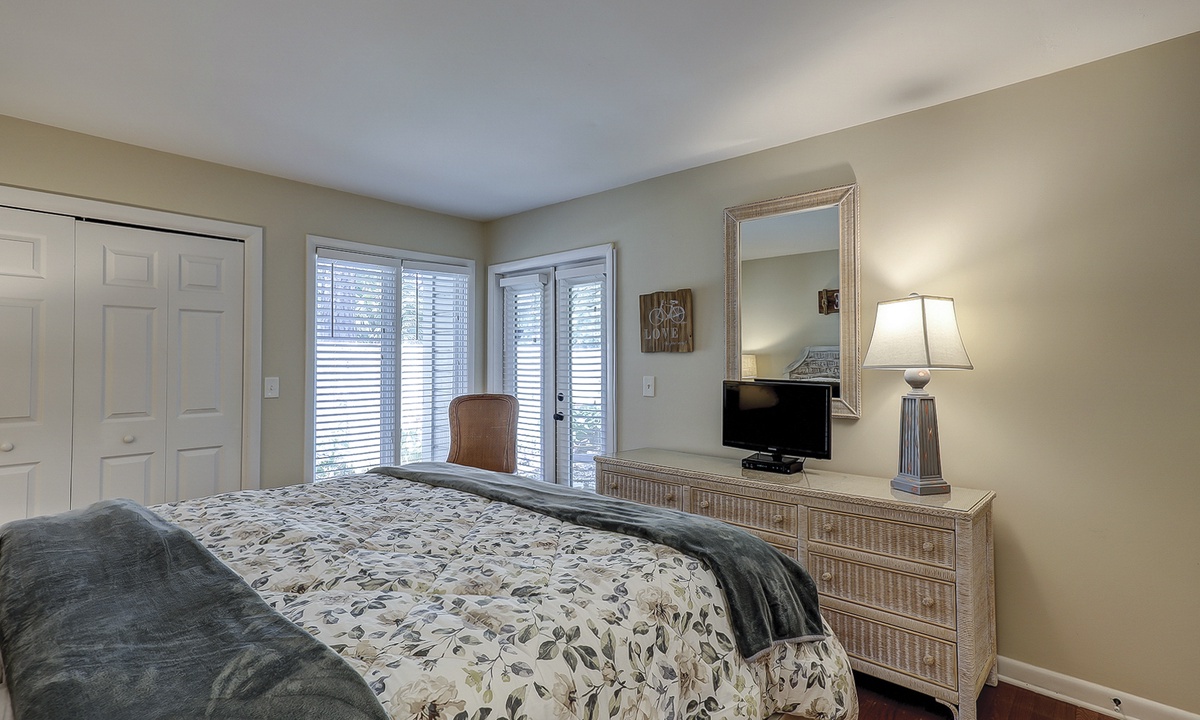 This Palmetto Dunes villa sleeps 6 guests in 2 inviting bedrooms. Hardwood floors continue through the primary bedroom featuring a king- size bed, along with a TV and access to the outdoor deck. This bedroom has a private bath/shower and toilet room with a separate vanity sink area. The guest bedroom offers plush carpet, a queen-size bed, and a bathroom that also serve as the powder room for guests. This bedroom also has its own TV along with a walk-in closet.