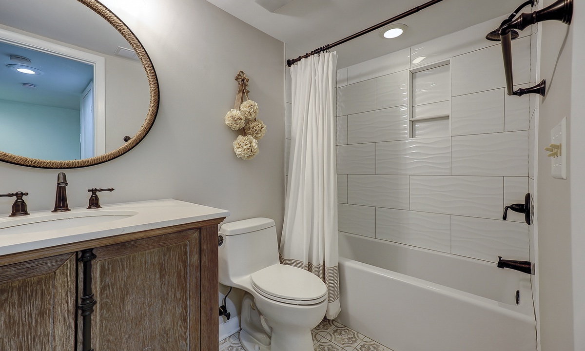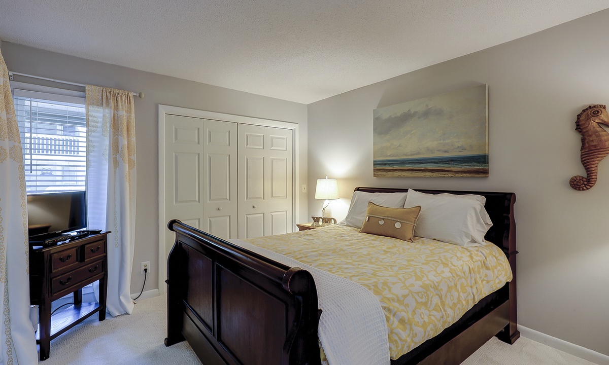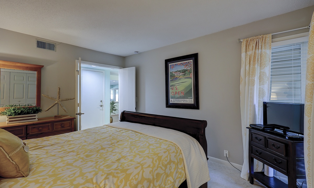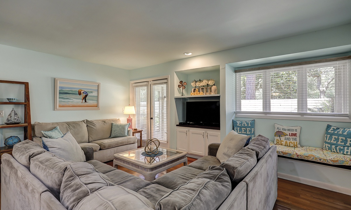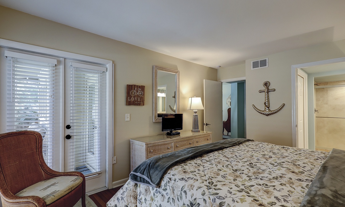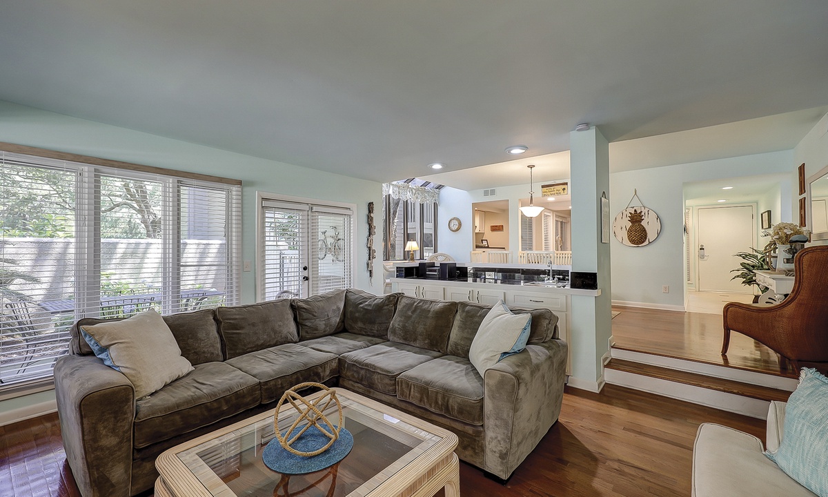 This Palmetto Dunes villa sleeps 6 guests in 2 inviting bedrooms. Hardwood floors continue through the primary bedroom featuring a king- size bed, along with a TV and access to the outdoor deck. This bedroom has a private bath/shower and toilet room with a separate vanity sink area. The guest bedroom offers plush carpet, a queen-size bed, and a bathroom that also serve as the powder room for guests. This bedroom also has its own TV along with a walk-in closet.