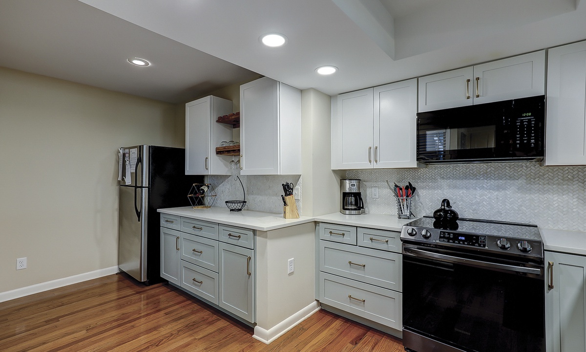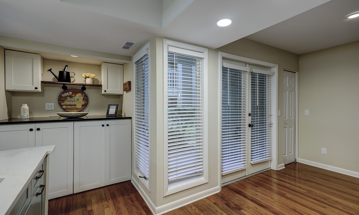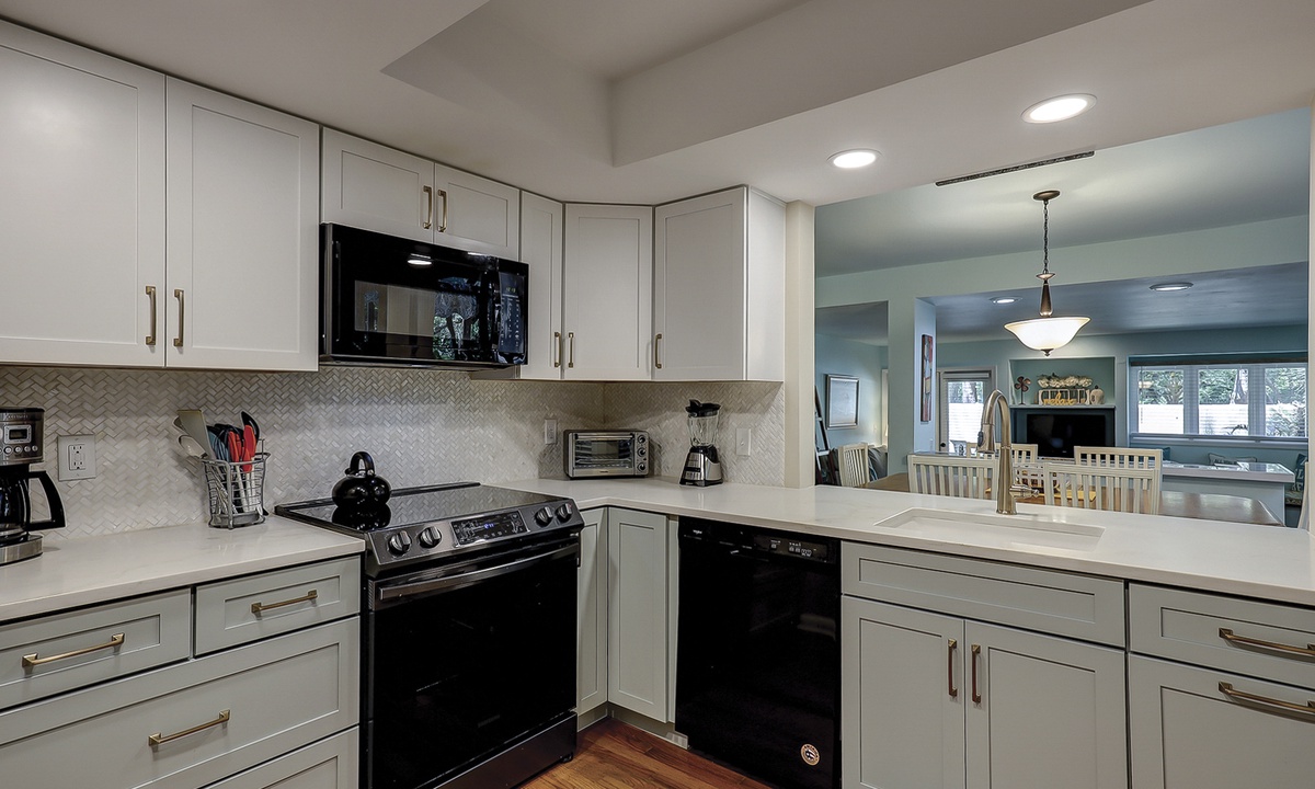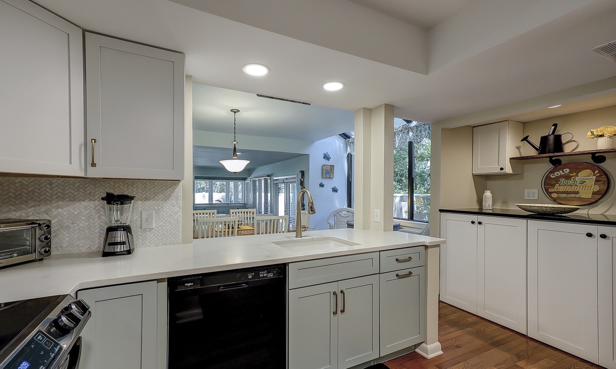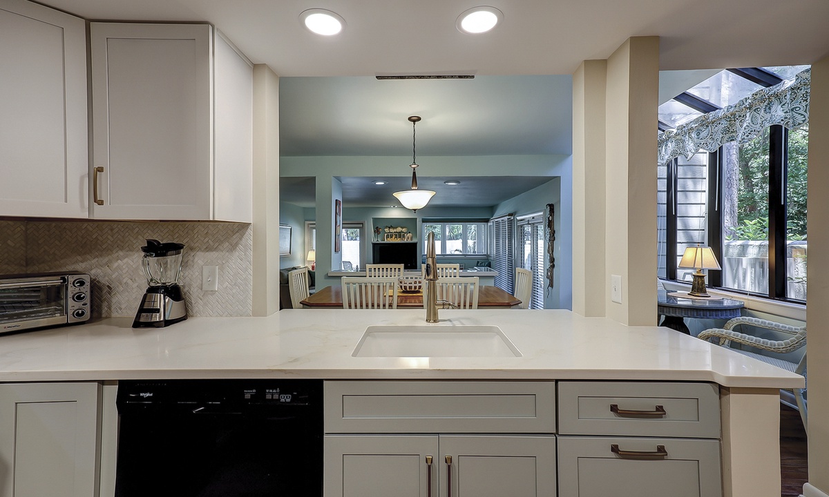 The foyer opens to a long platform area that overlooks the sunken living room, cathedral ceiling throughout the kitchen and dining room. The fully equipped kitchen, features granite countertops and all the appliances needed to make you feel right at home. For added convenience, there is also a washer and dryer in an alcove off the kitchen. The formal dining area sits adjacent to the kitchen and offers a table with seating for up to 8 along with a wicker coffee table and two additional chairs providing the perfect spot to sip your mornings’ coffee. The dining room sits in front of large castanet windows that will provide an abundance of light when the sun is out.