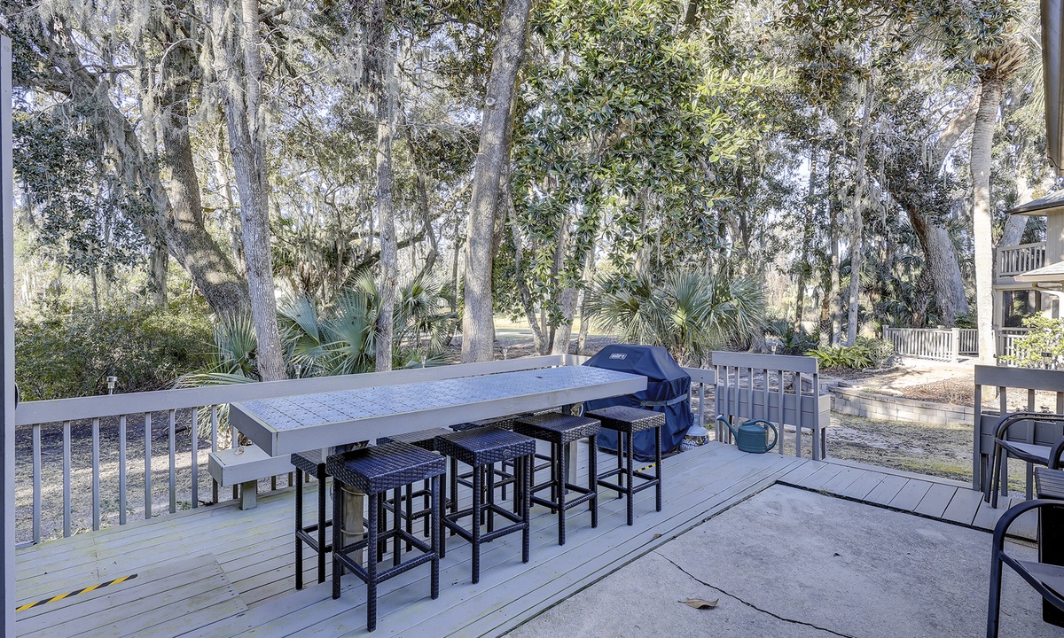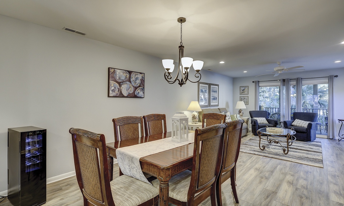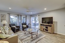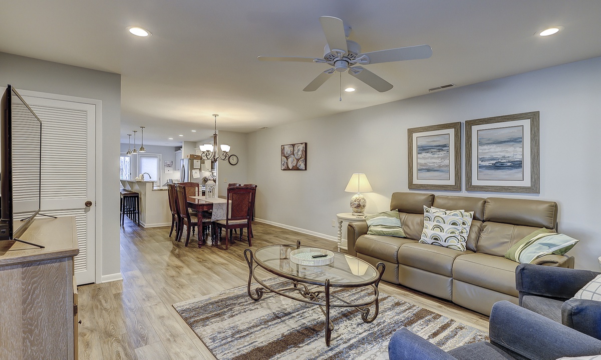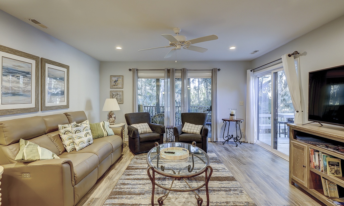 The open concept floor plan provides plenty of space to spread out. The living area features comfortable furnishings, a large Smart TV and access to both the screened in porch and large deck through sliding glass doors. Both outdoor spaces offer comfortable furnishings and views of the golf course beyond.