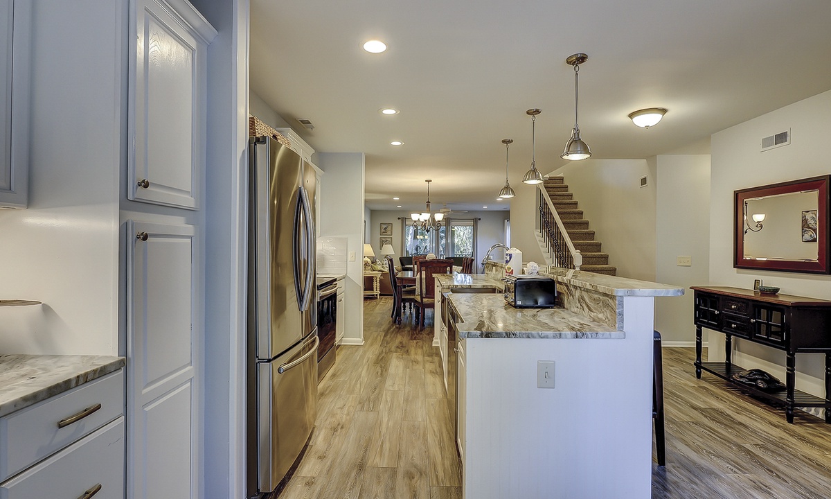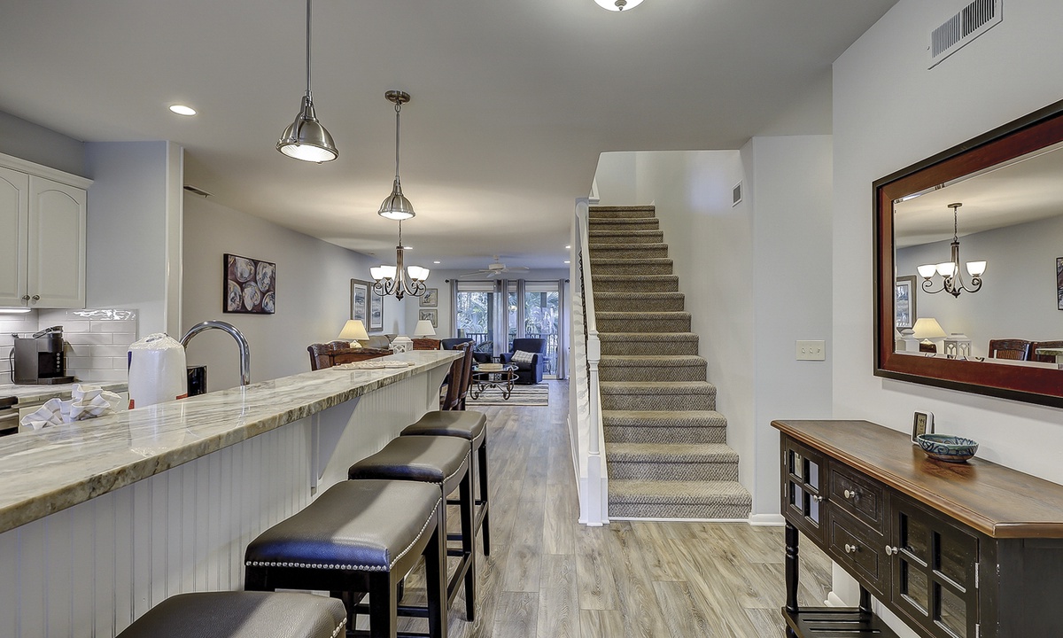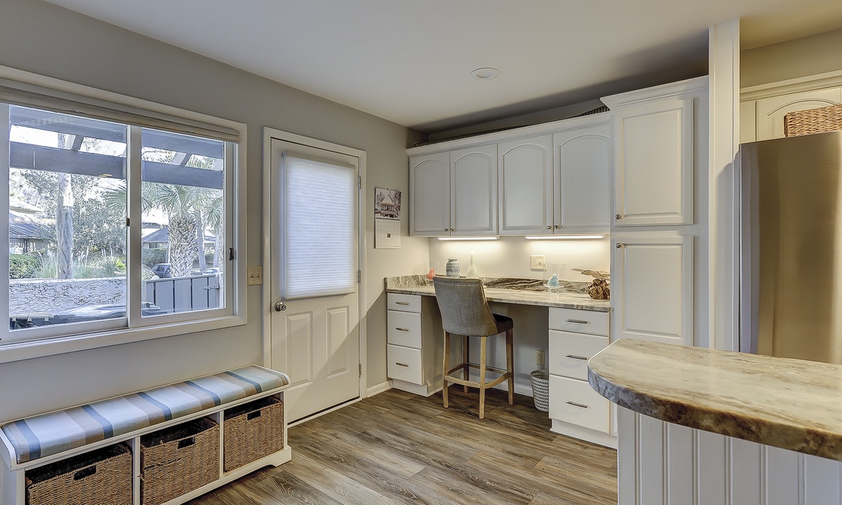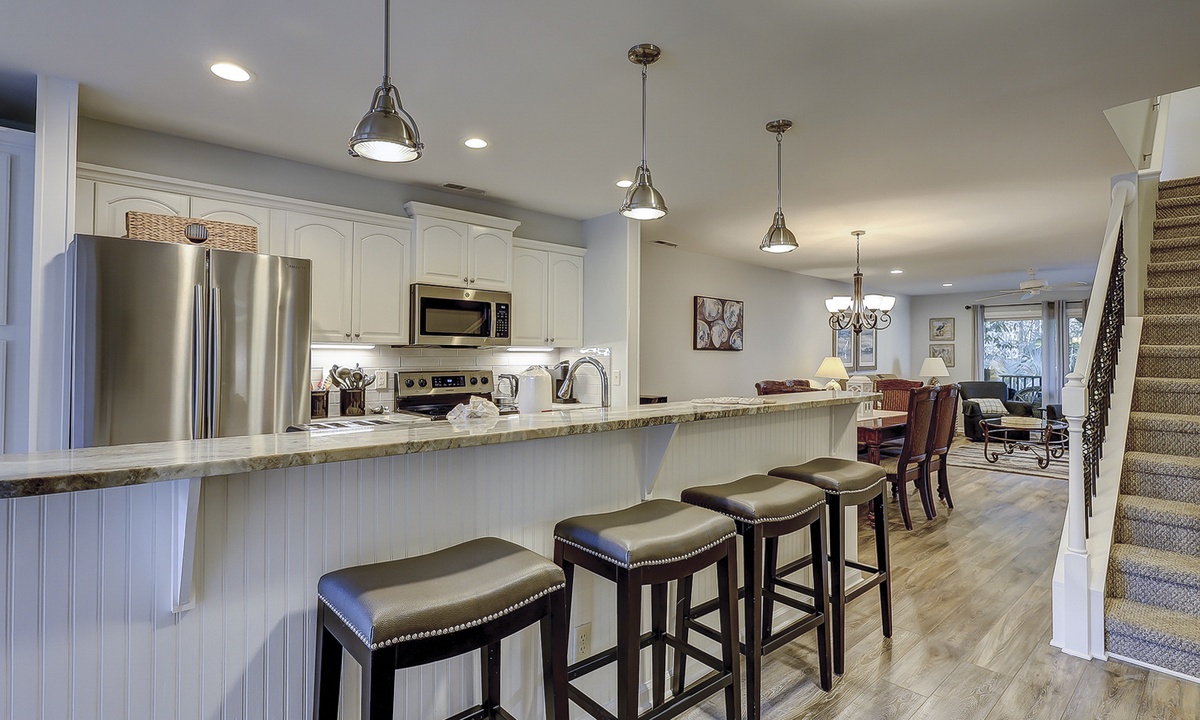 Back inside of this vacation rental in Shipyard, you'll also find a dining area and fully renovated kitchen with granite counters, stainless appliances and extra seating at the kitchen bar. You'll also find a powder room, as well as a dedicated workspace just off the kitchen.