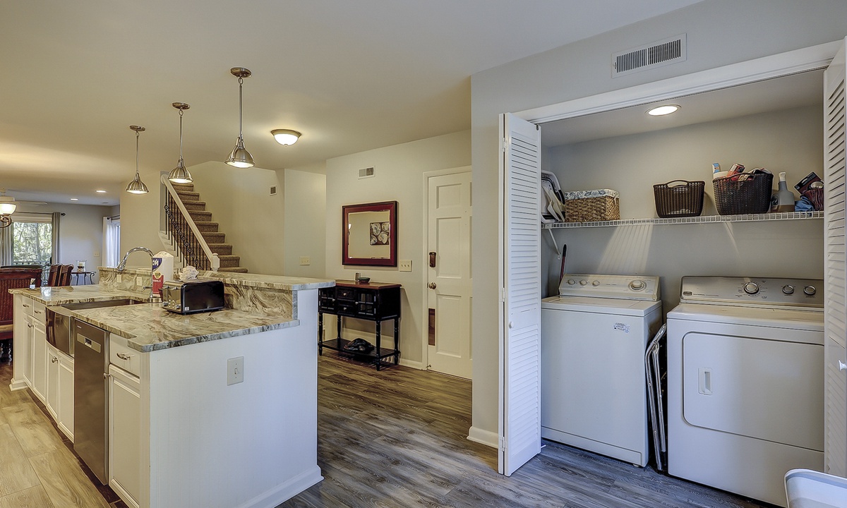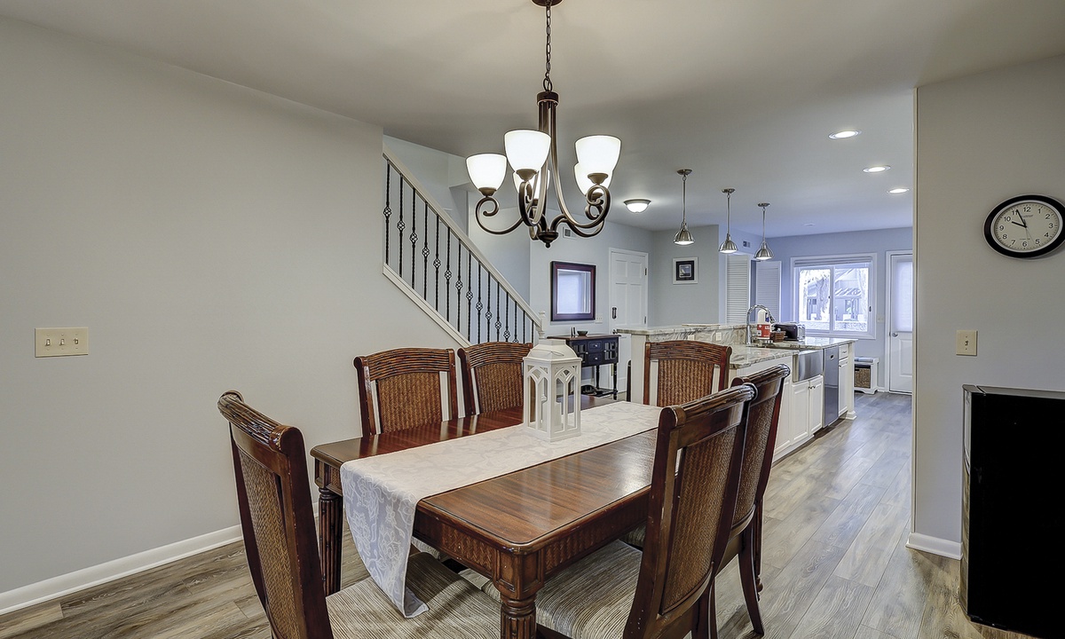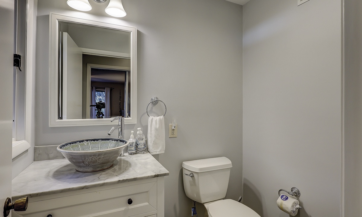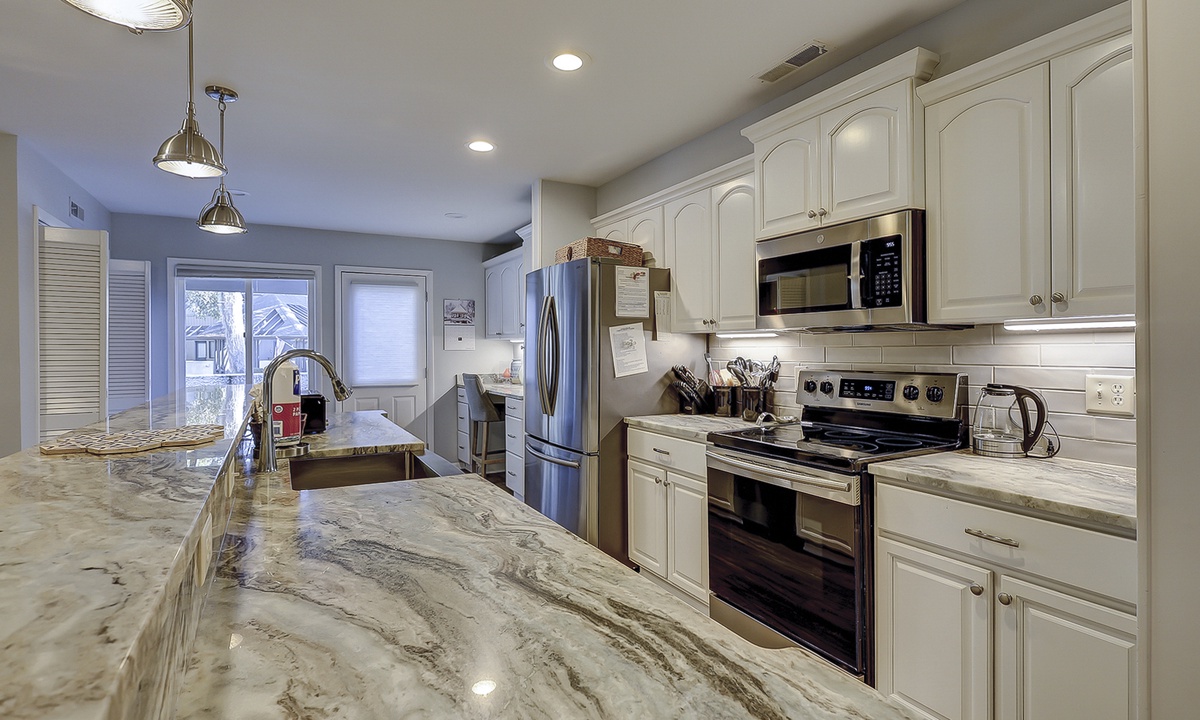Back inside of this vacation rental in Shipyard, you'll also find a dining area and fully renovated kitchen with granite counters, stainless appliances and extra seating at the kitchen bar. You'll also find a powder room, as well as a dedicated workspace just off the kitchen.