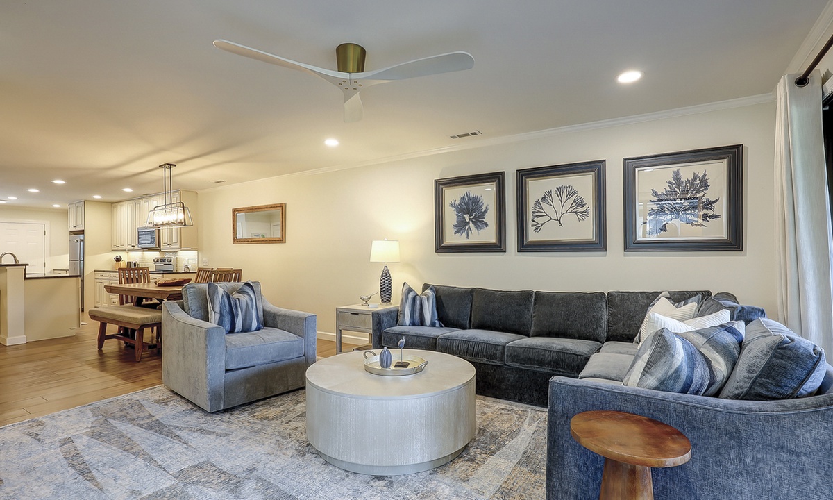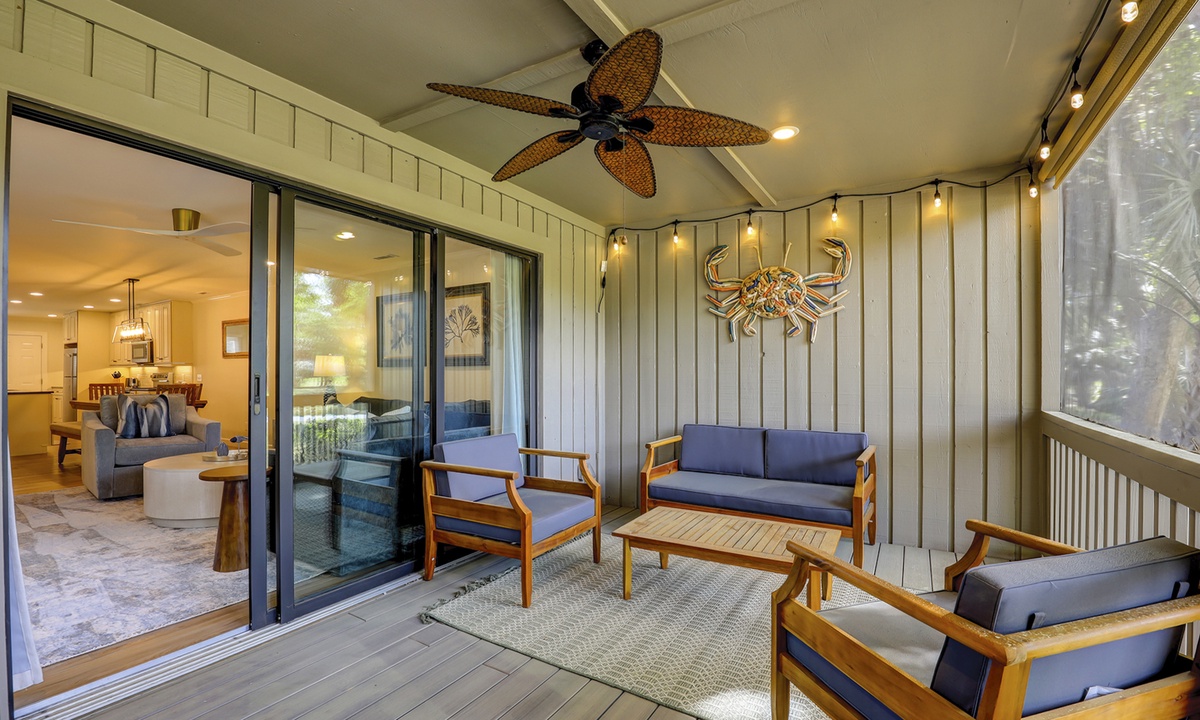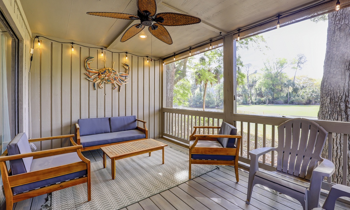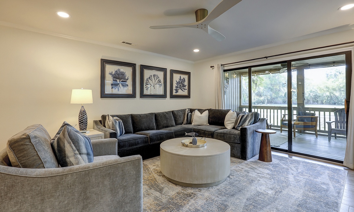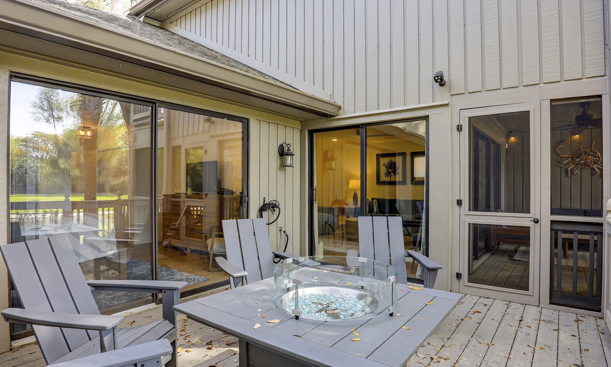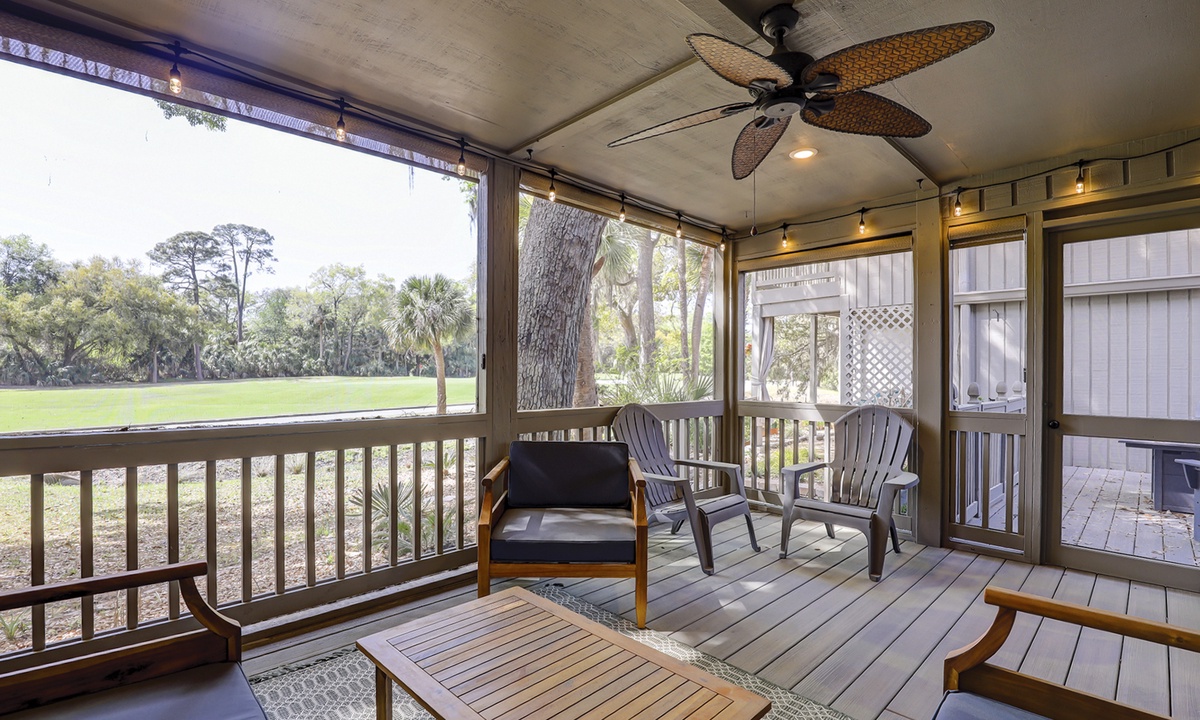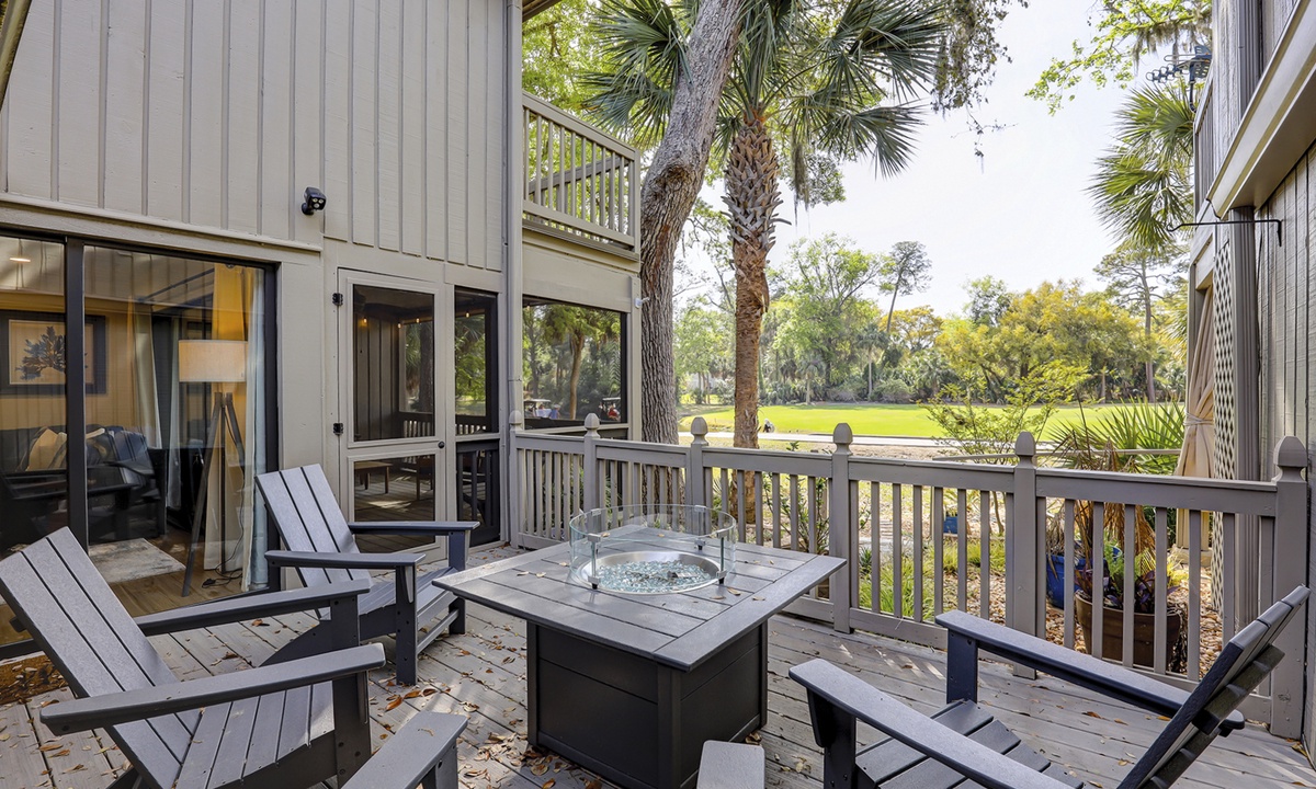 The stair-free main level features an open-concept floor plan with plush furniture and a large Smart TV in the living area. The screened-in porch can be accessed through the living area, as can the private patio with a propane fire table and lush golf course views.