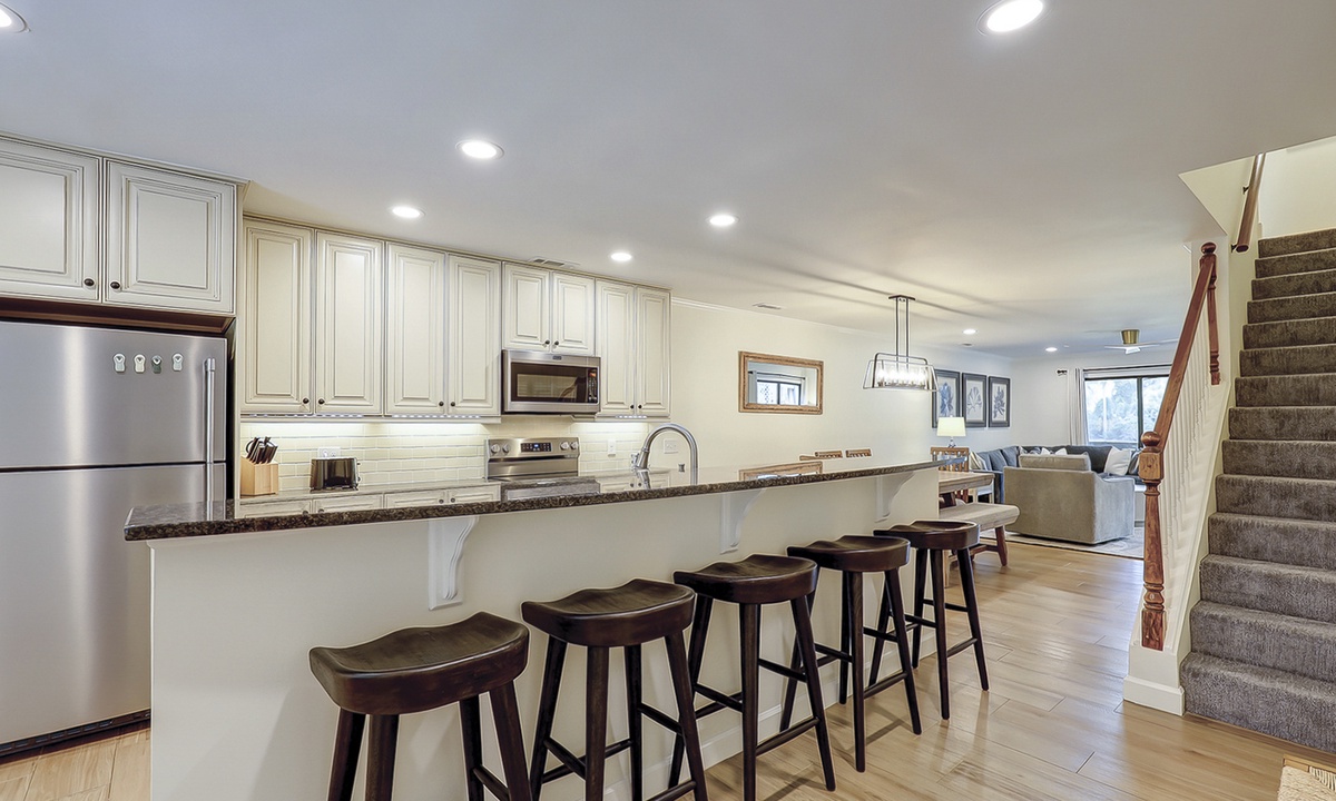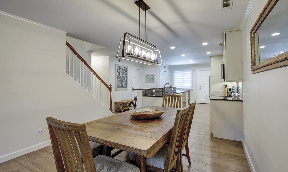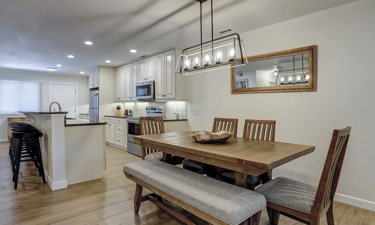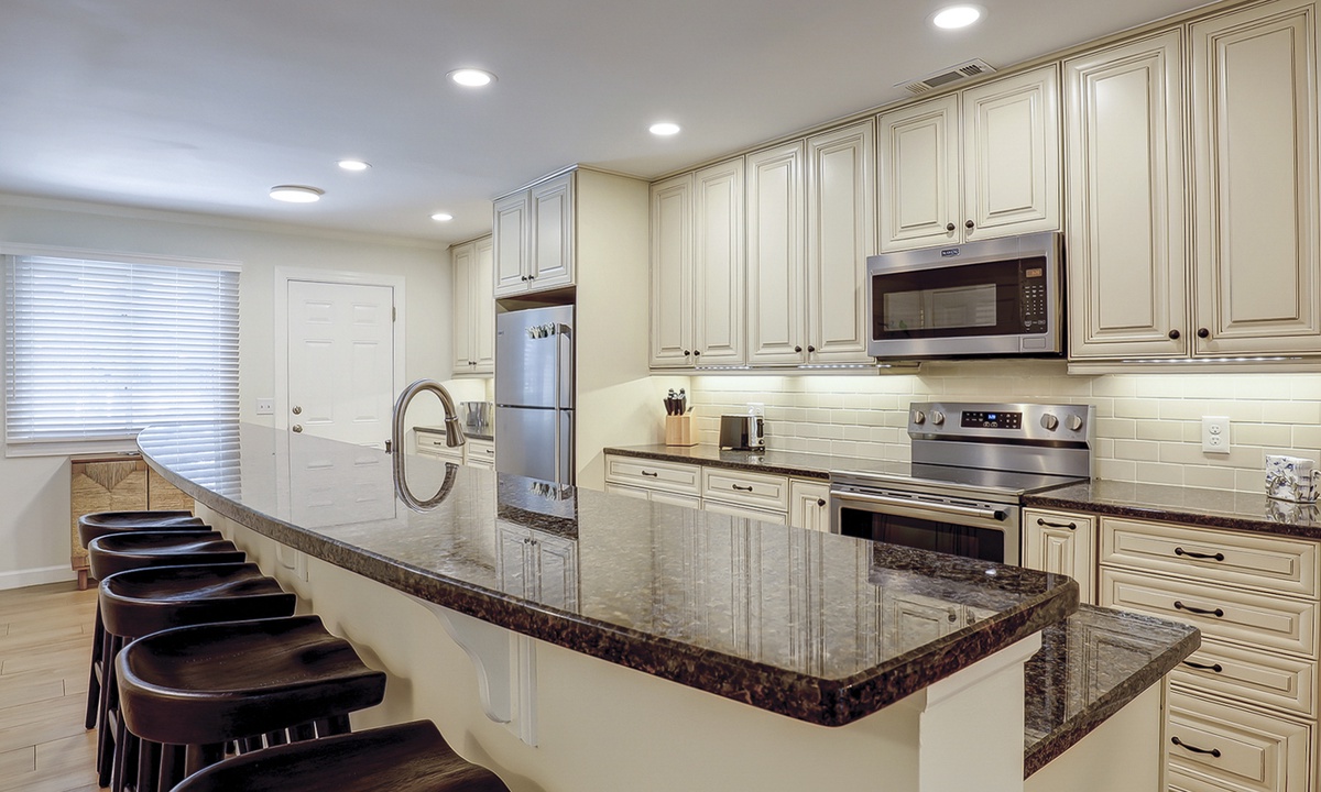 Back inside, you'll find a dining area with seating for 6, as well as additional seating at the kitchen bar. The well-appointed kitchen has granite counters, new stainless appliances and plenty of cabinet space.