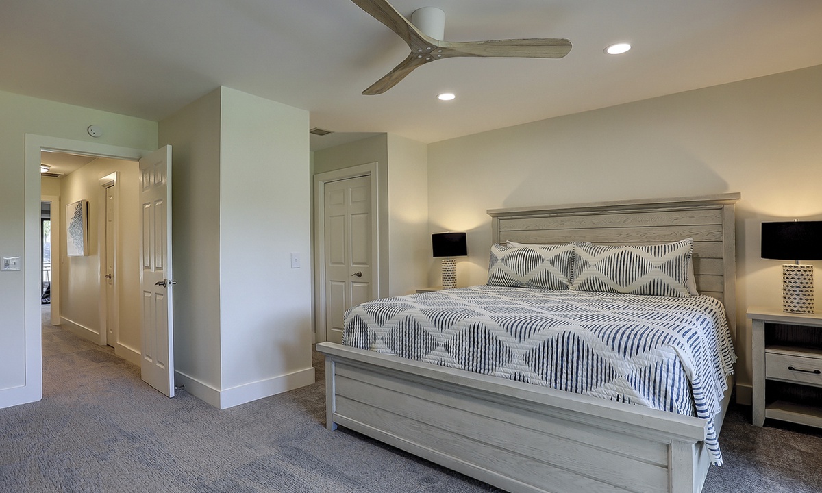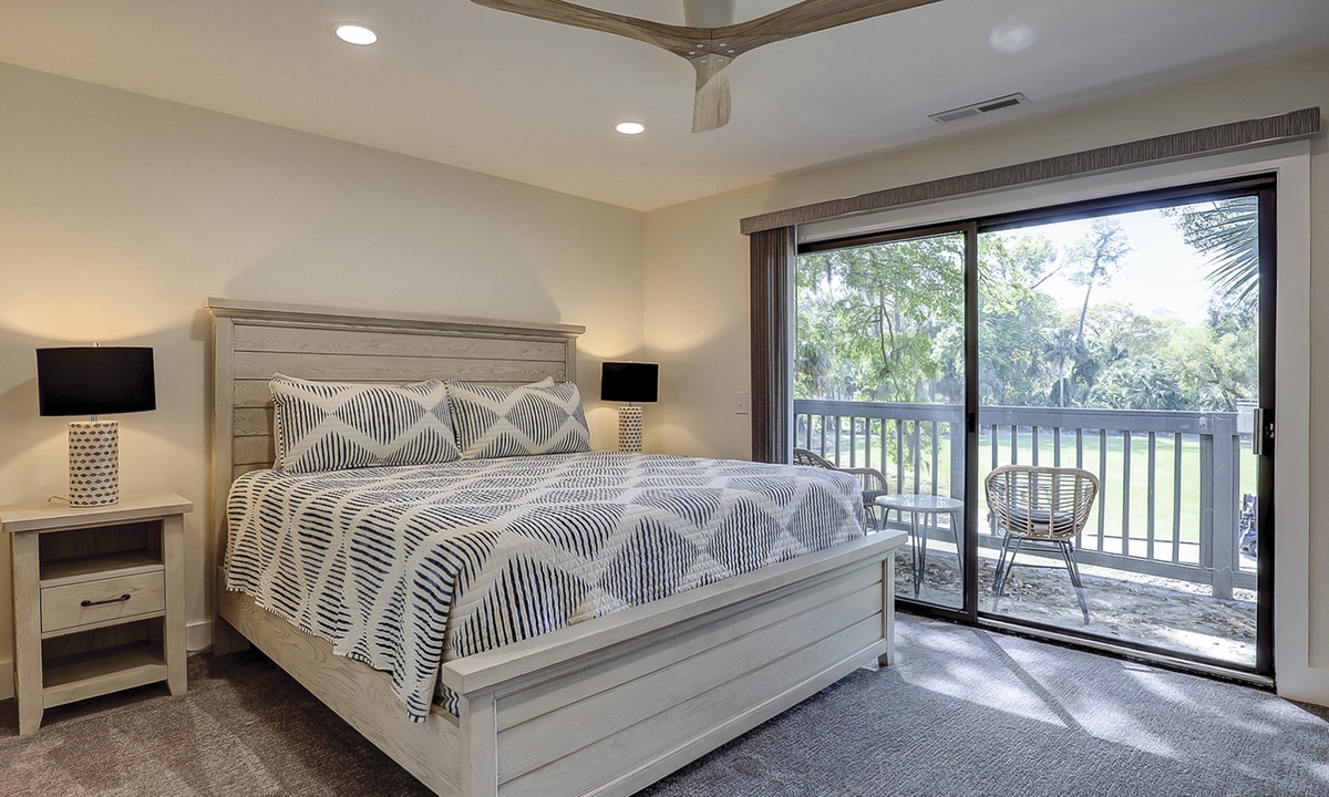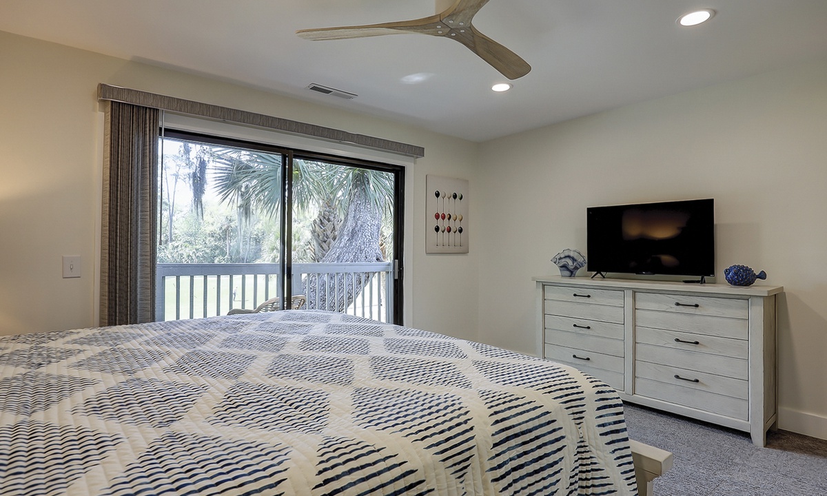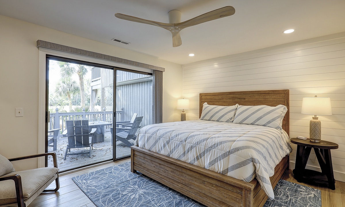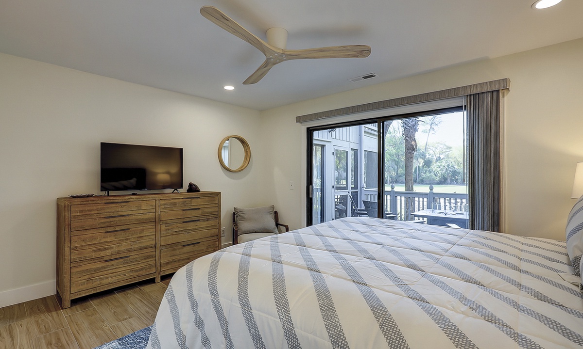 The main bedroom is located on the first level and features a king bed, Smart TV and a large, private bathroom with a tiled walk-in shower. The open patio area can also be accessed through sliding doors in this room.
