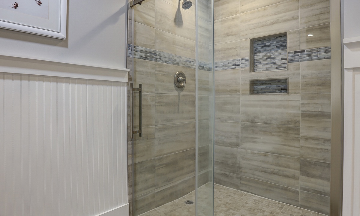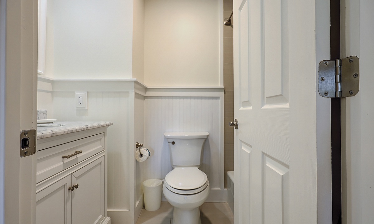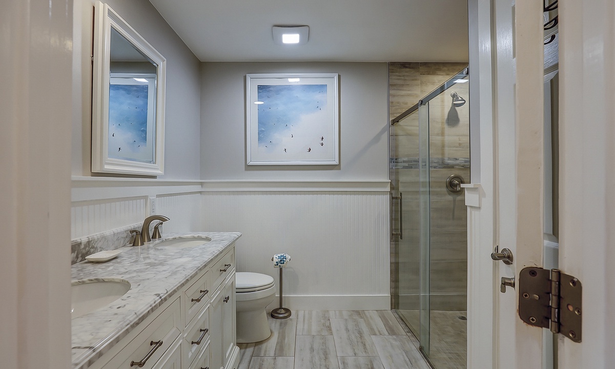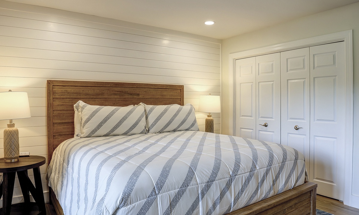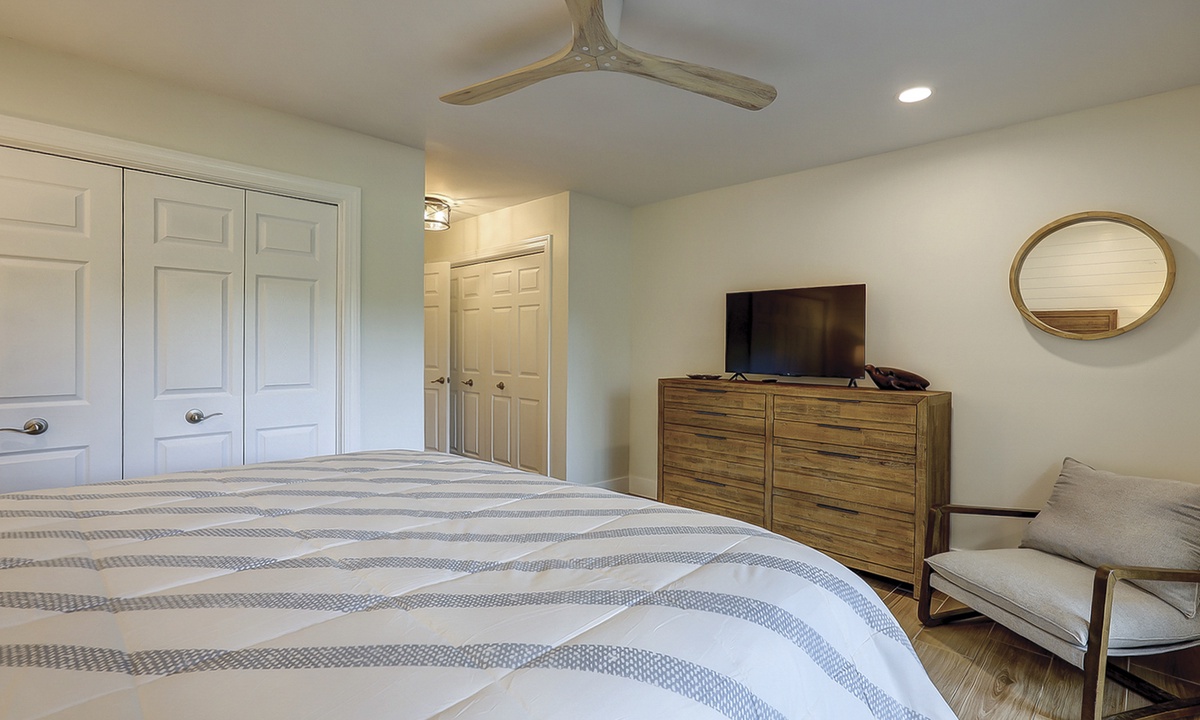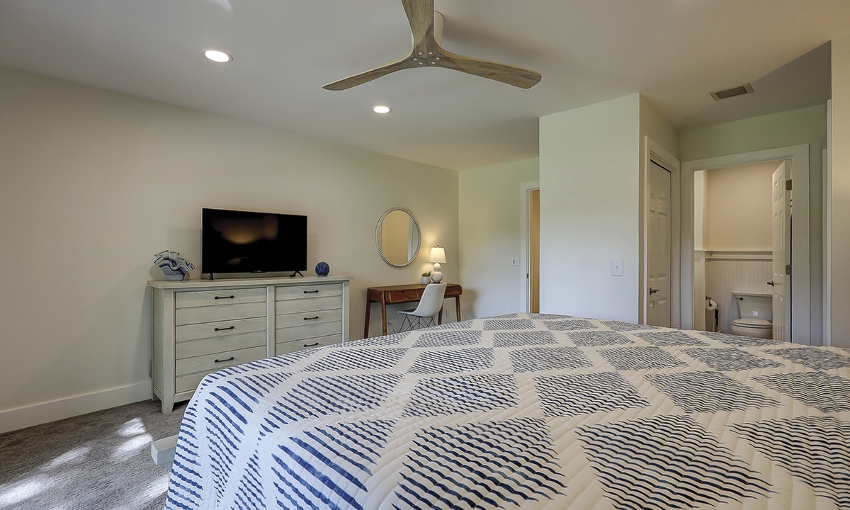 The main bedroom is located on the first level and features a king bed, Smart TV and a large, private bathroom with a tiled walk-in shower. The open patio area can also be accessed through sliding doors in this room.