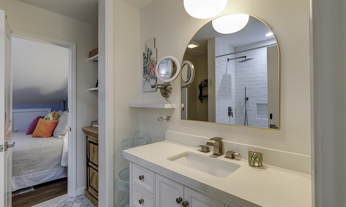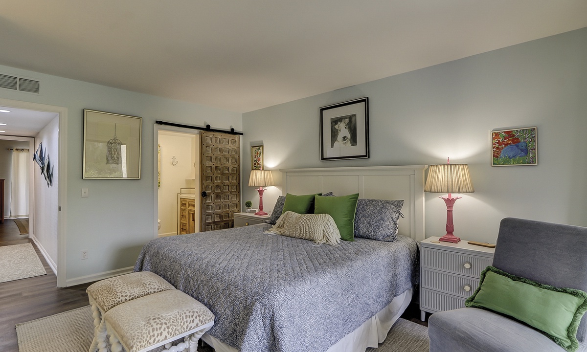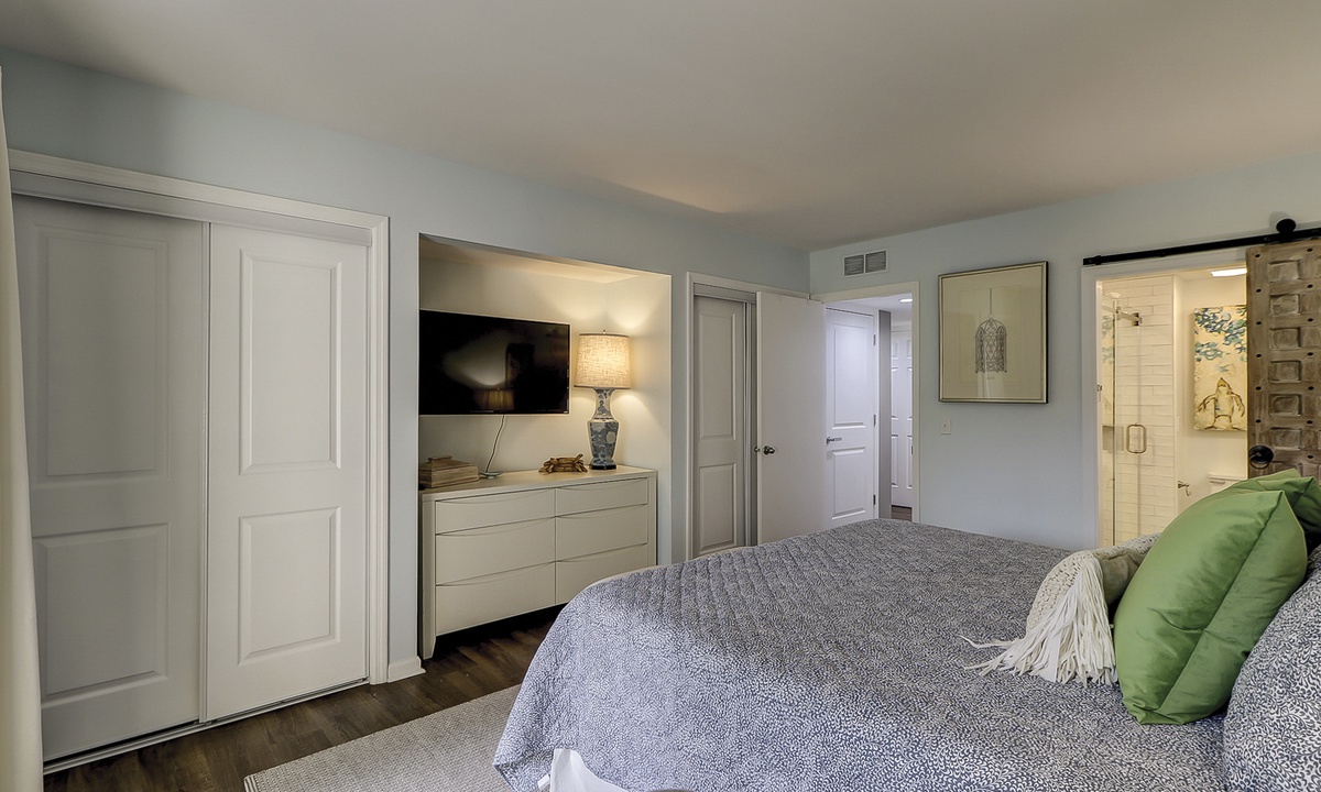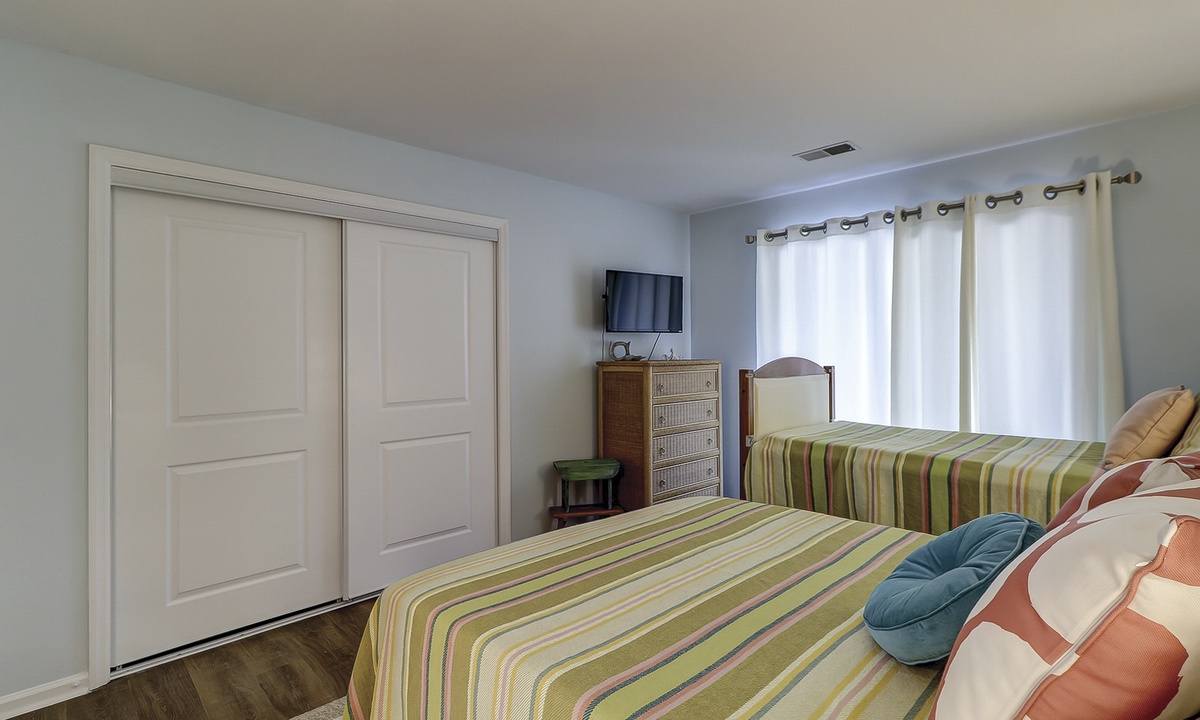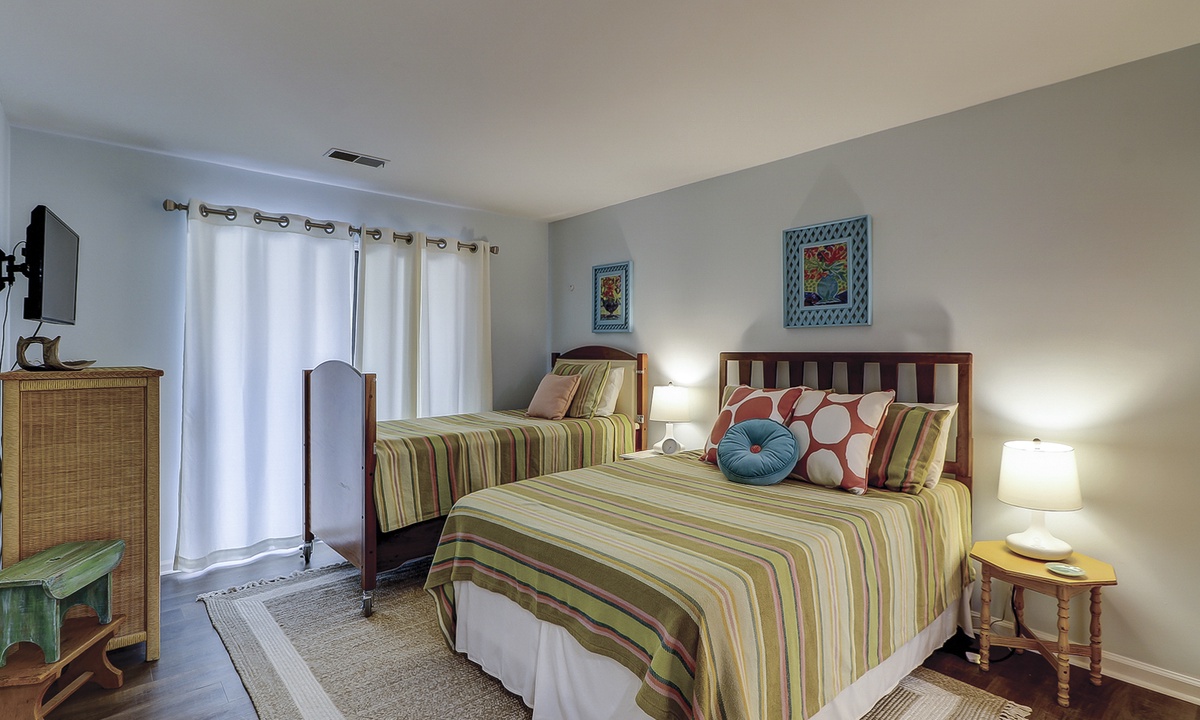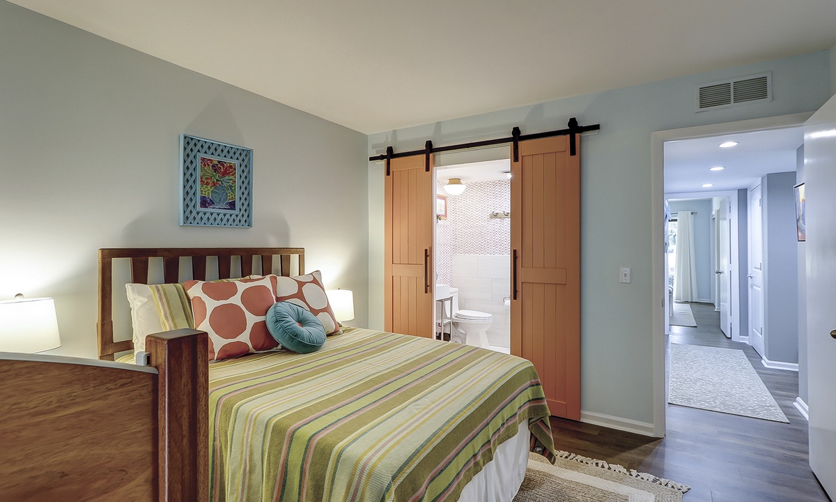 Two of the 4 bedrooms are located on the first level. The main bedroom features a king bed, Smart TV and private, renovated bathroom with barn door access with a walk-in shower. This room also has access to the patio area through sliding doors. The second bedroom on this level has a full bed and a twin bed, a Smart TV and a fully handicap accessible with barn door access and a curb-less shower, as well as a roll under ADA sink.