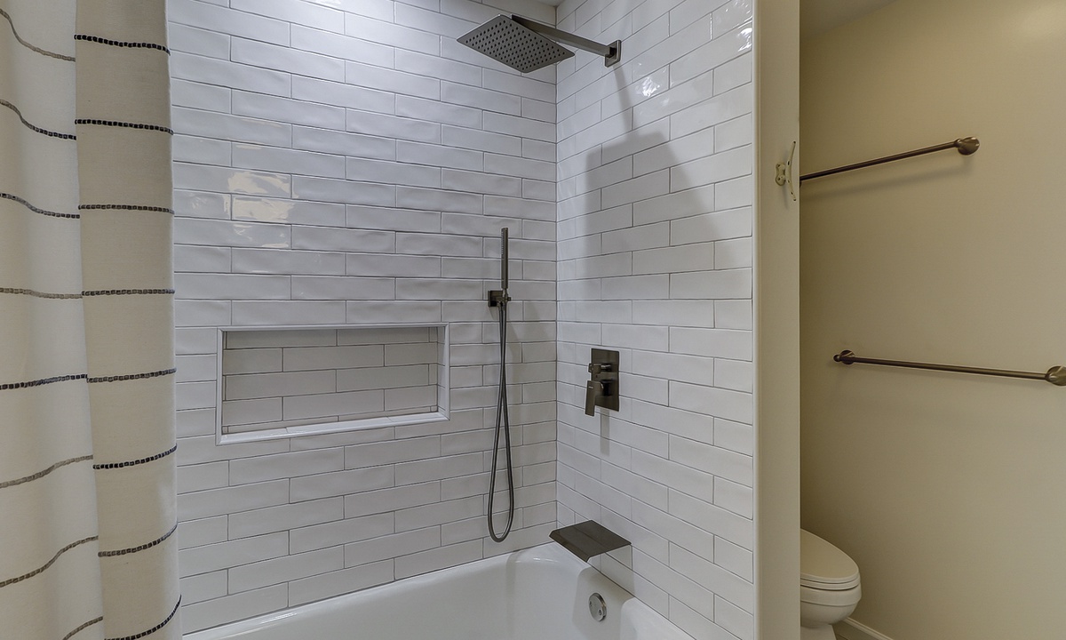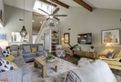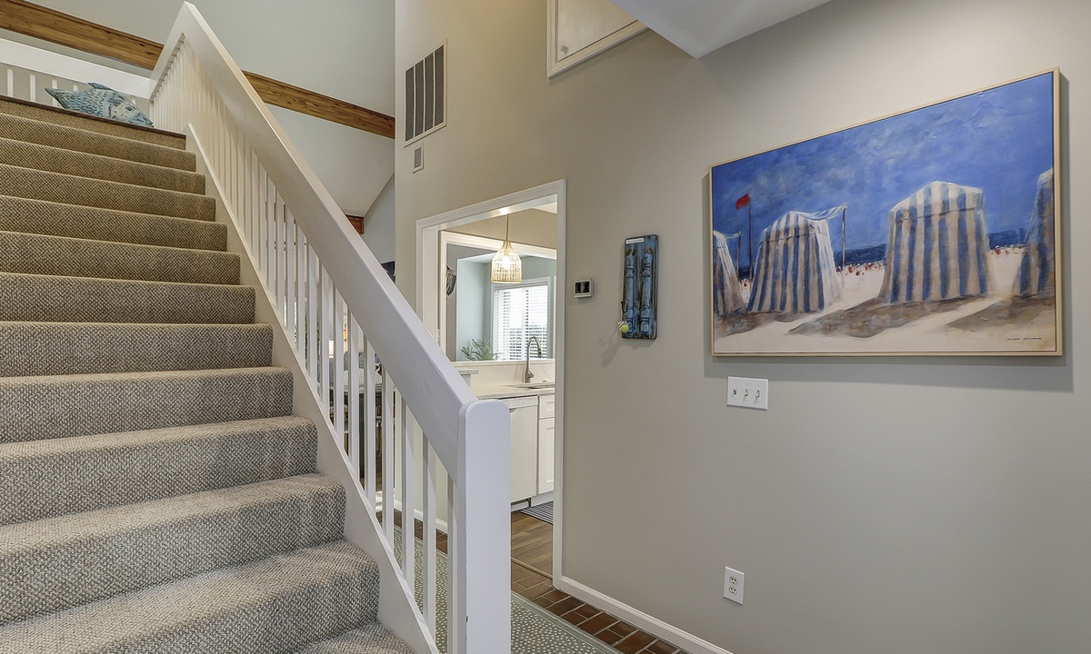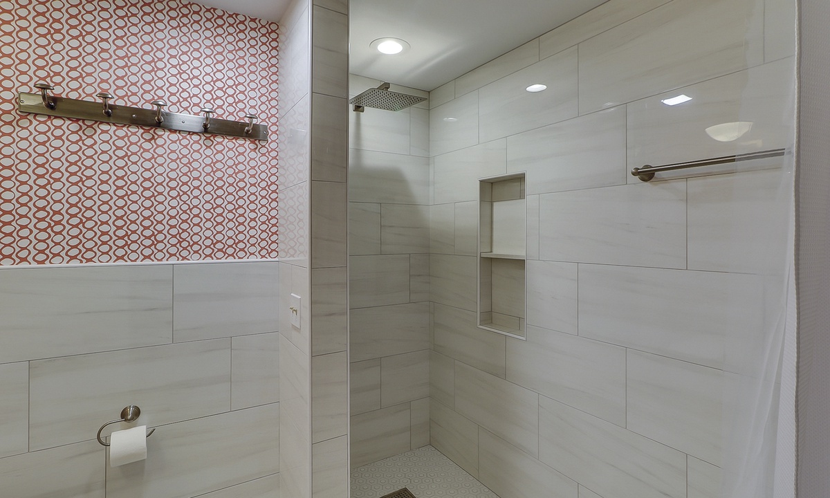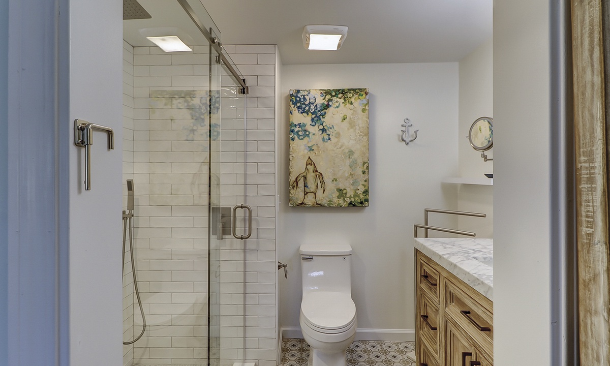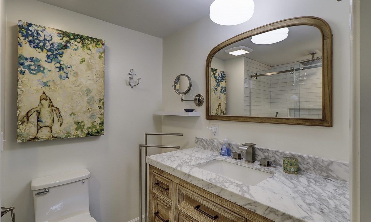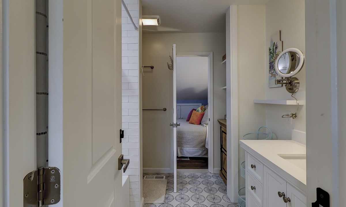 Two of the 4 bedrooms are located on the first level. The main bedroom features a king bed, Smart TV and private, renovated bathroom with barn door access with a walk-in shower. This room also has access to the patio area through sliding doors. The second bedroom on this level has a full bed and a twin bed, a Smart TV and a fully handicap accessible with barn door access and a curb-less shower, as well as a roll under ADA sink.